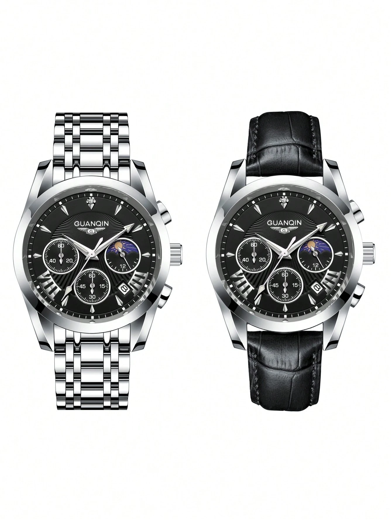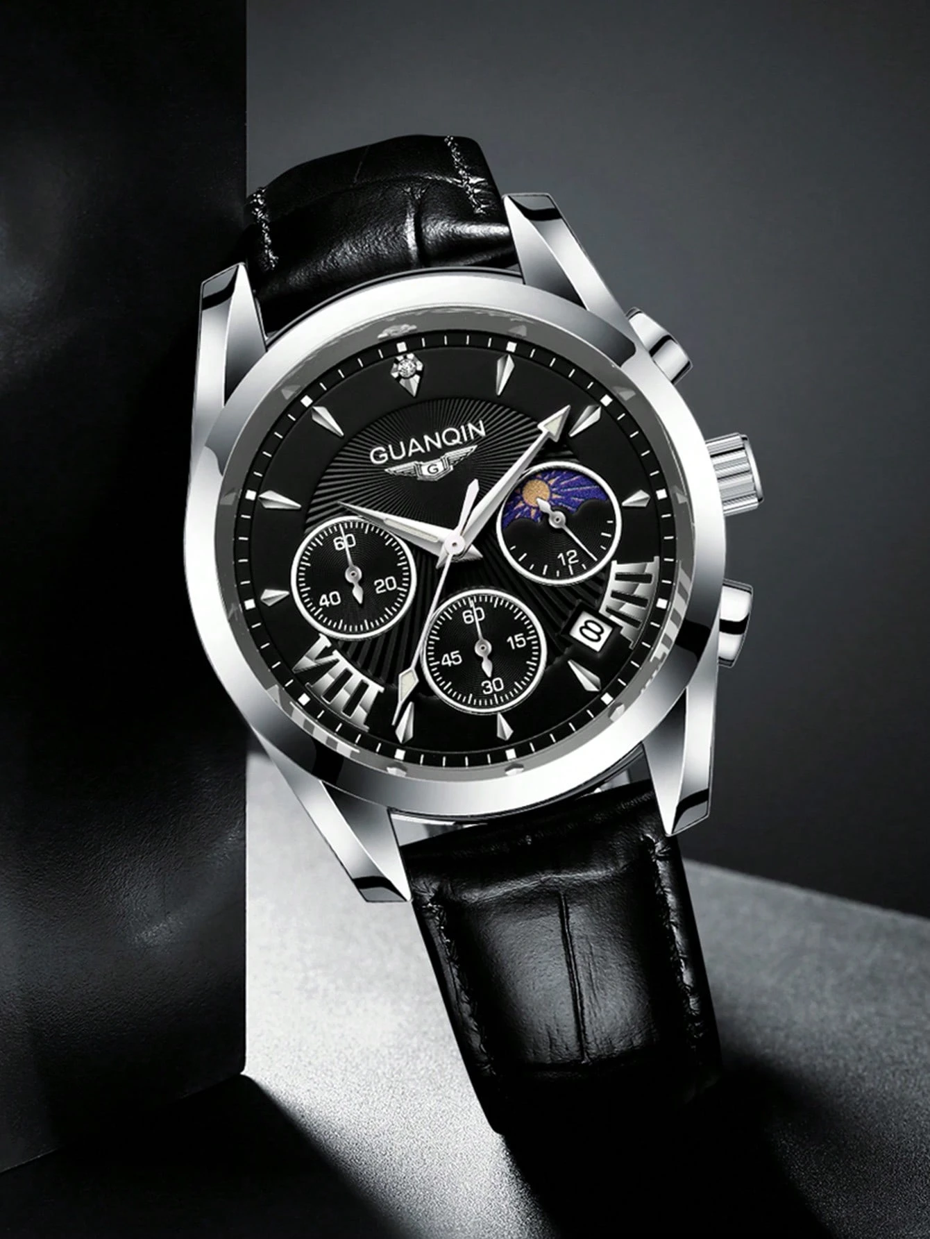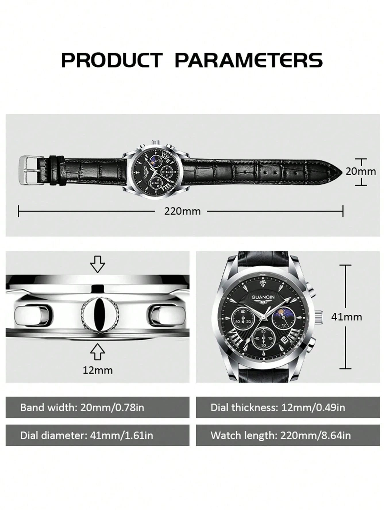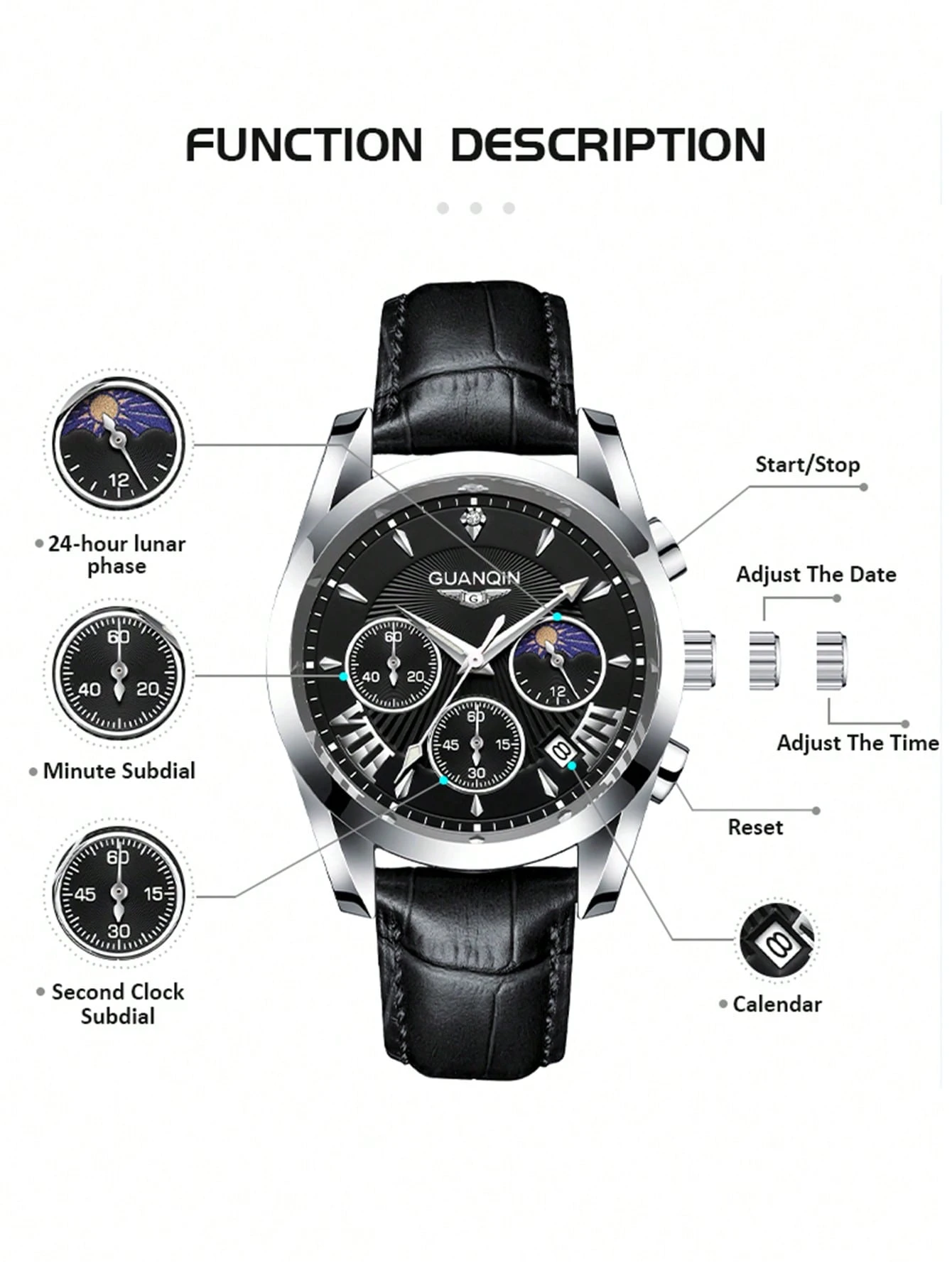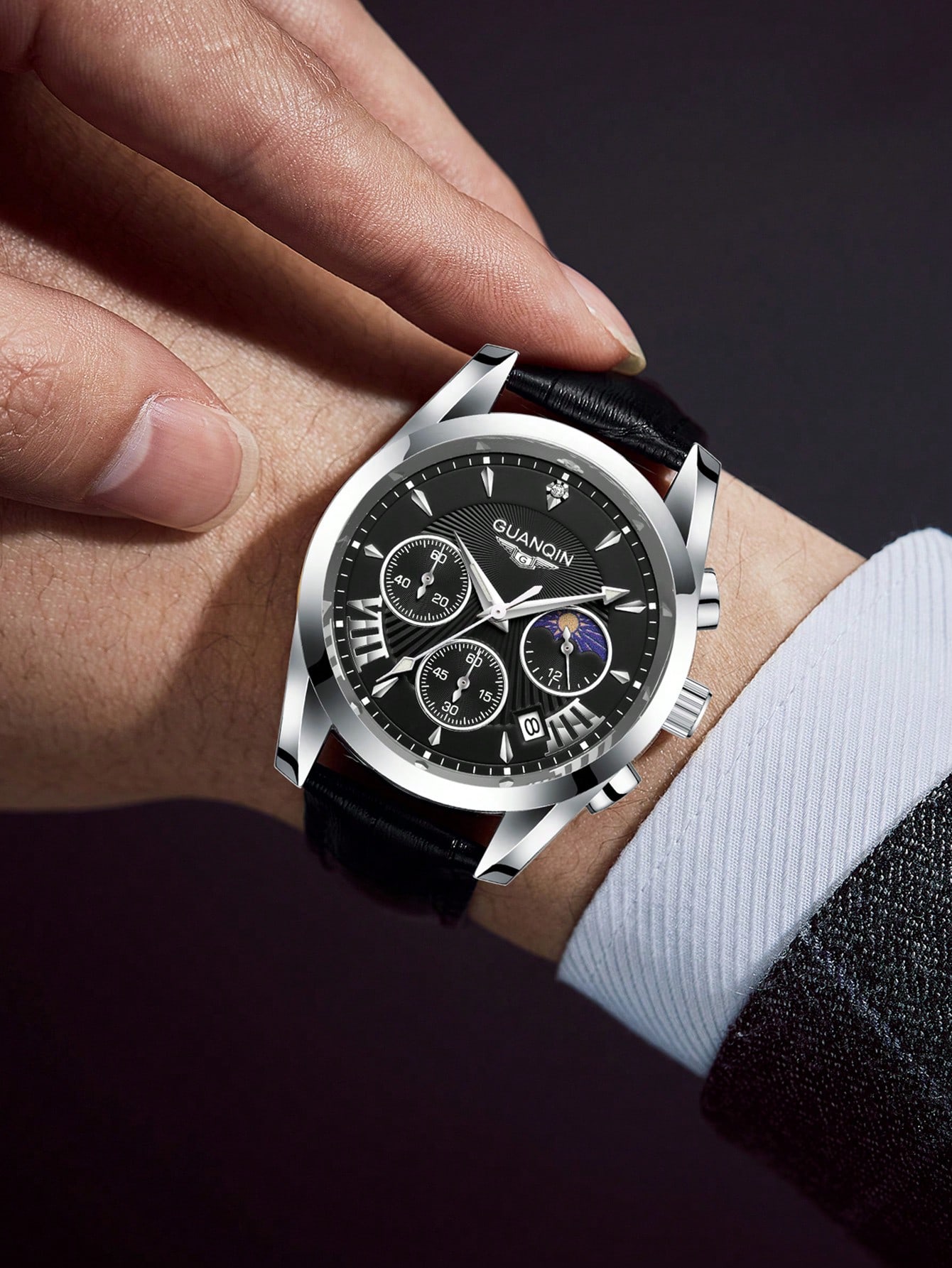 1 Pc Sophisticated Men's Quartz Watch – Automatic, 30m Waterproof, Chronograph Multifunction, Business Casual Style With Luminous Display, Steel Case & Leather Band Includes Battery – Perfect For Valentine's/Father's Day