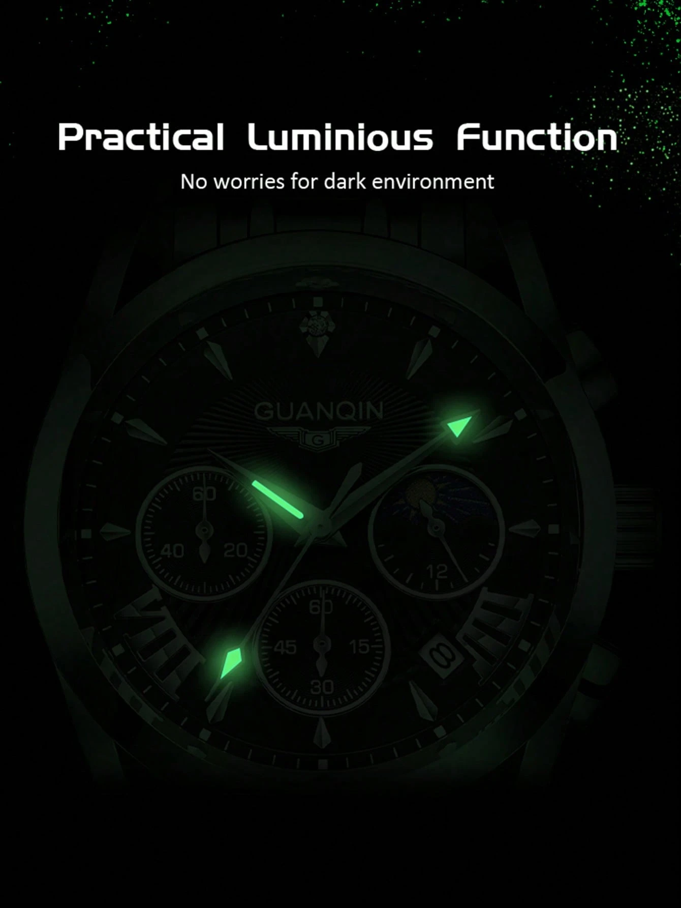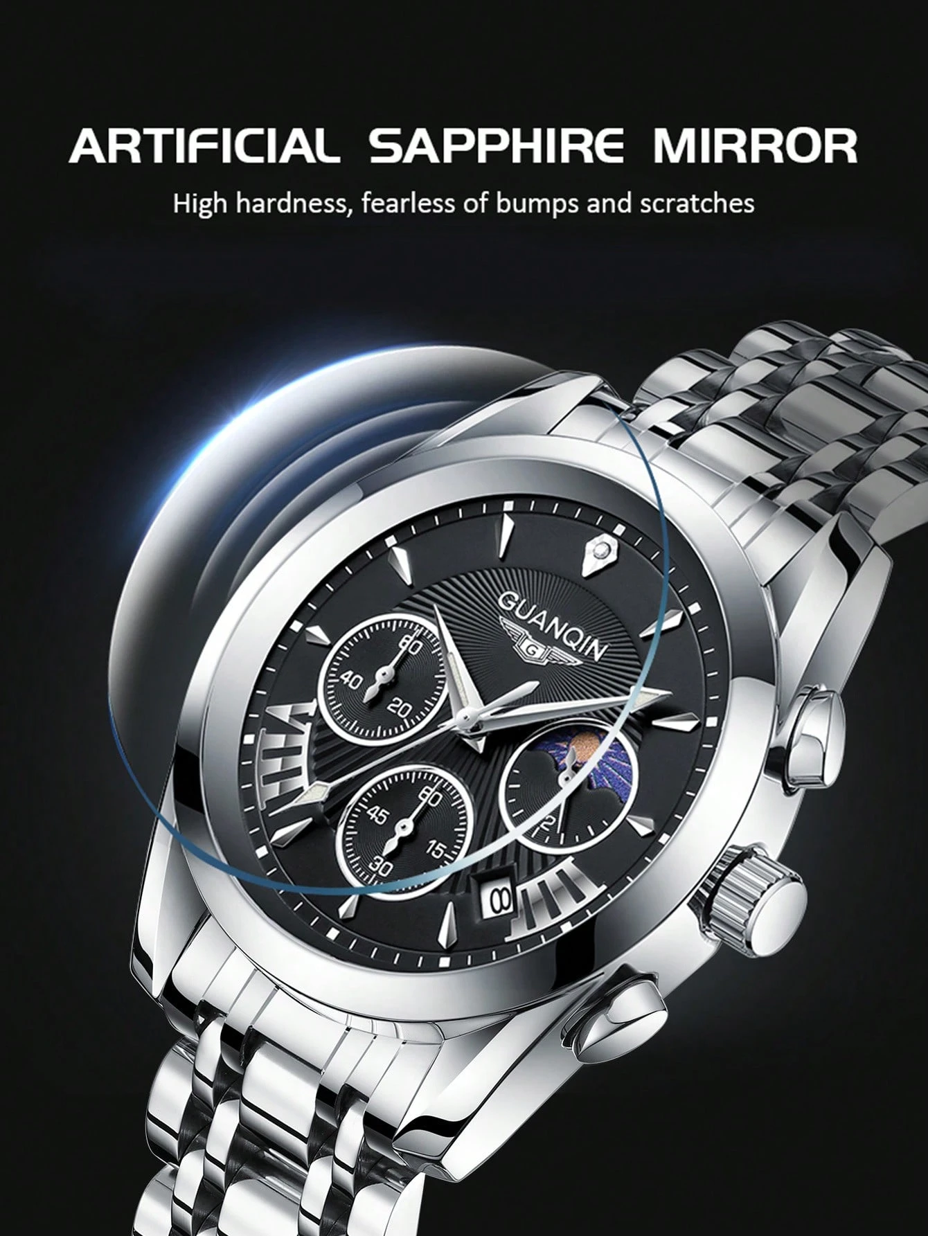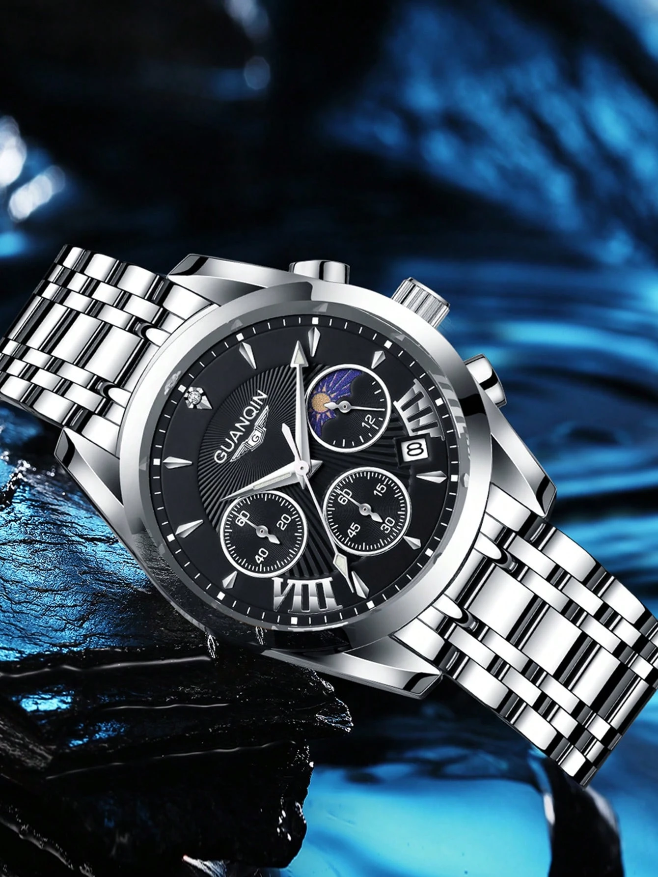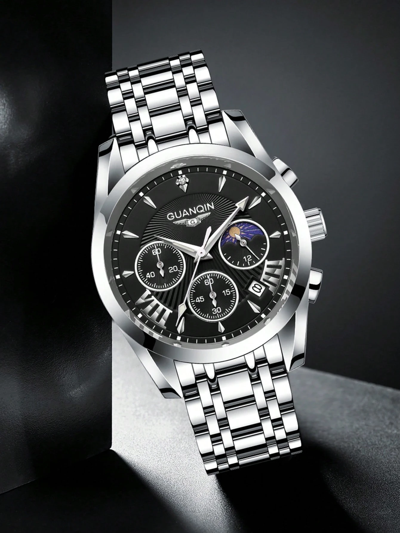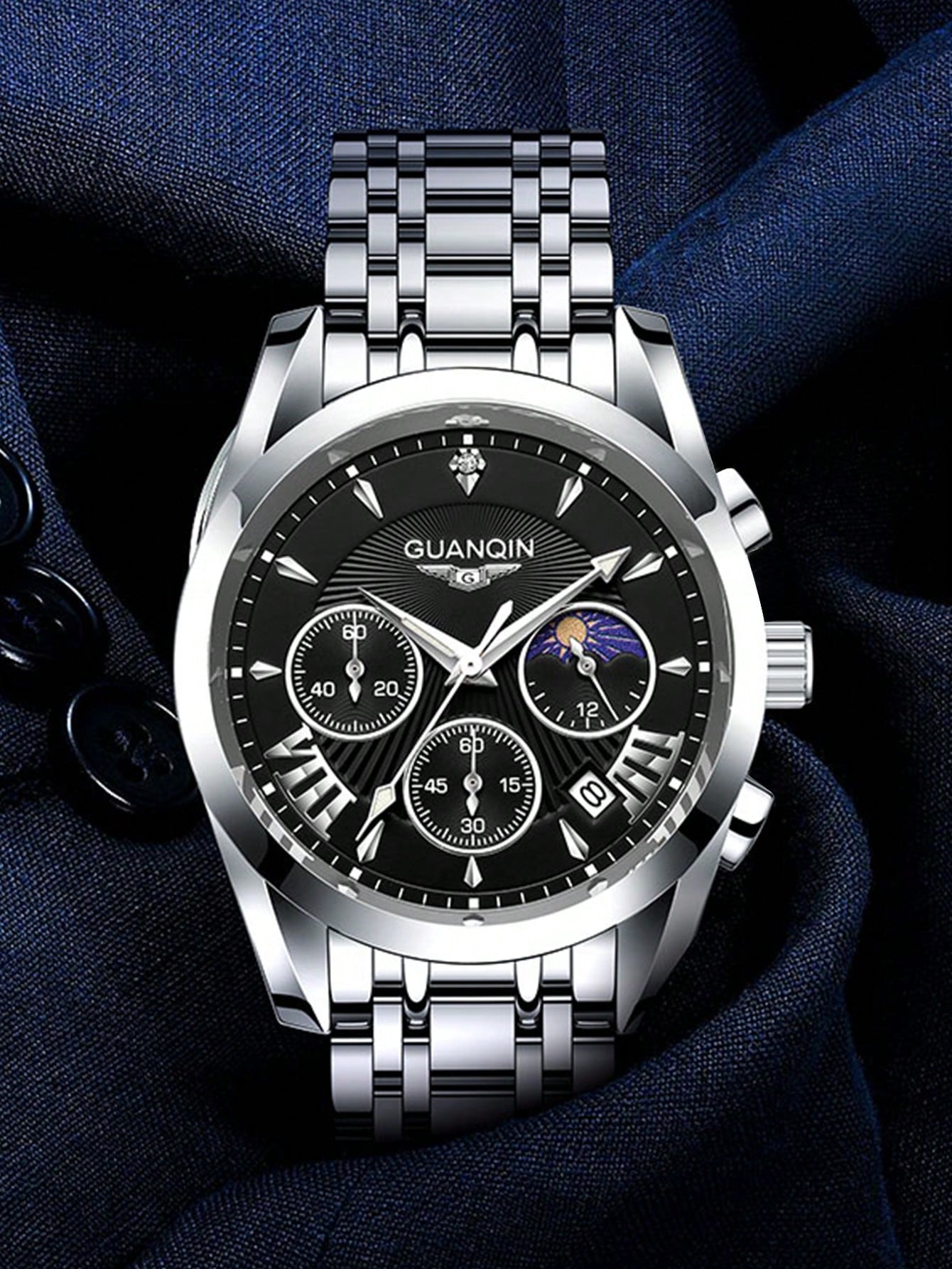 1 Pc Sophisticated Men's Quartz Watch – Automatic, 30m Waterproof, Chronograph Multifunction, Business Casual Style With Luminous Display, Steel Case & Leather Band Includes Battery – Perfect For Valentine's/Father's Day