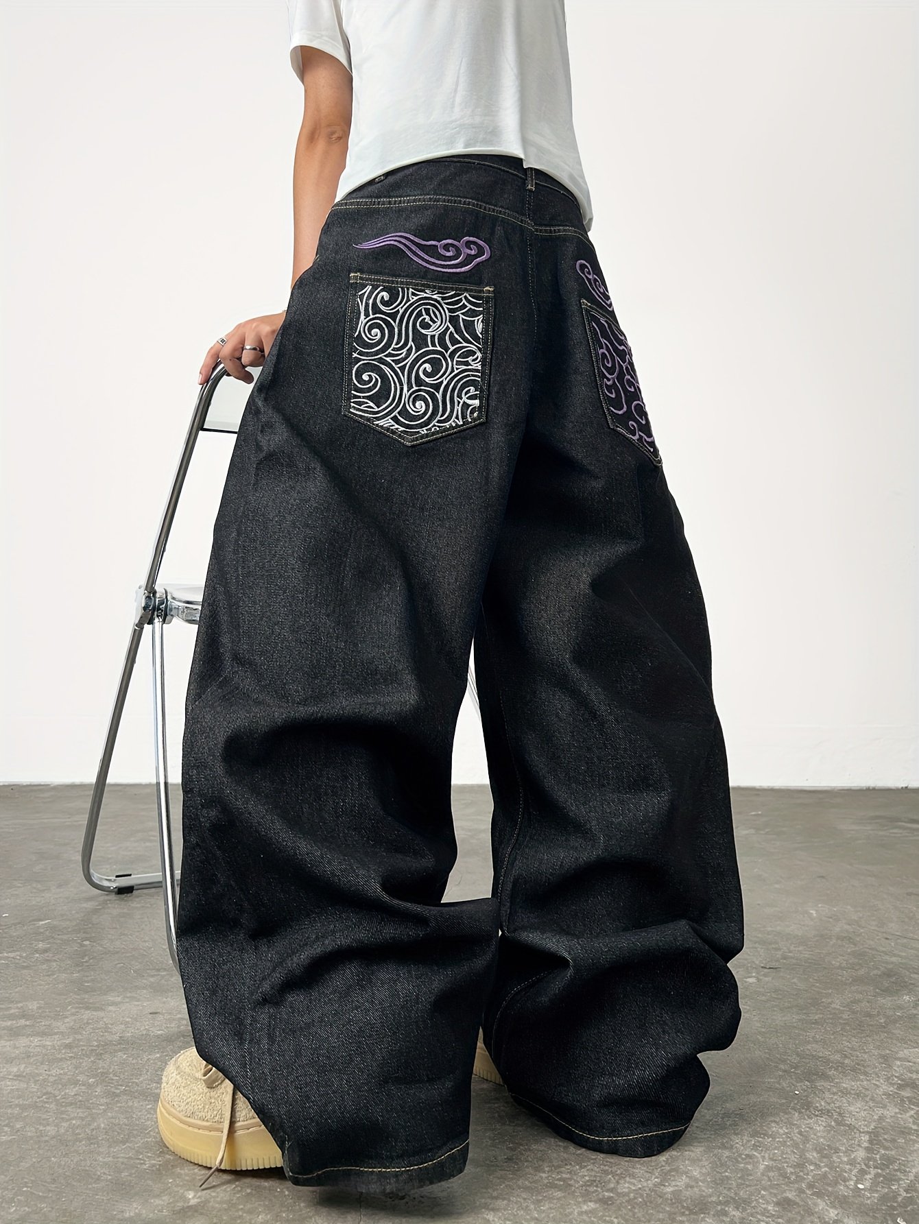 1pc American High Street Niche Design Heavy Embroidery Loose Faux Denim, Distressed Washed Fashionable Versatile Wide Leg Pants, Unisex Without Belt/Without Pendant, Yk Pants, Men'S Faux Denim, Baggy Pants