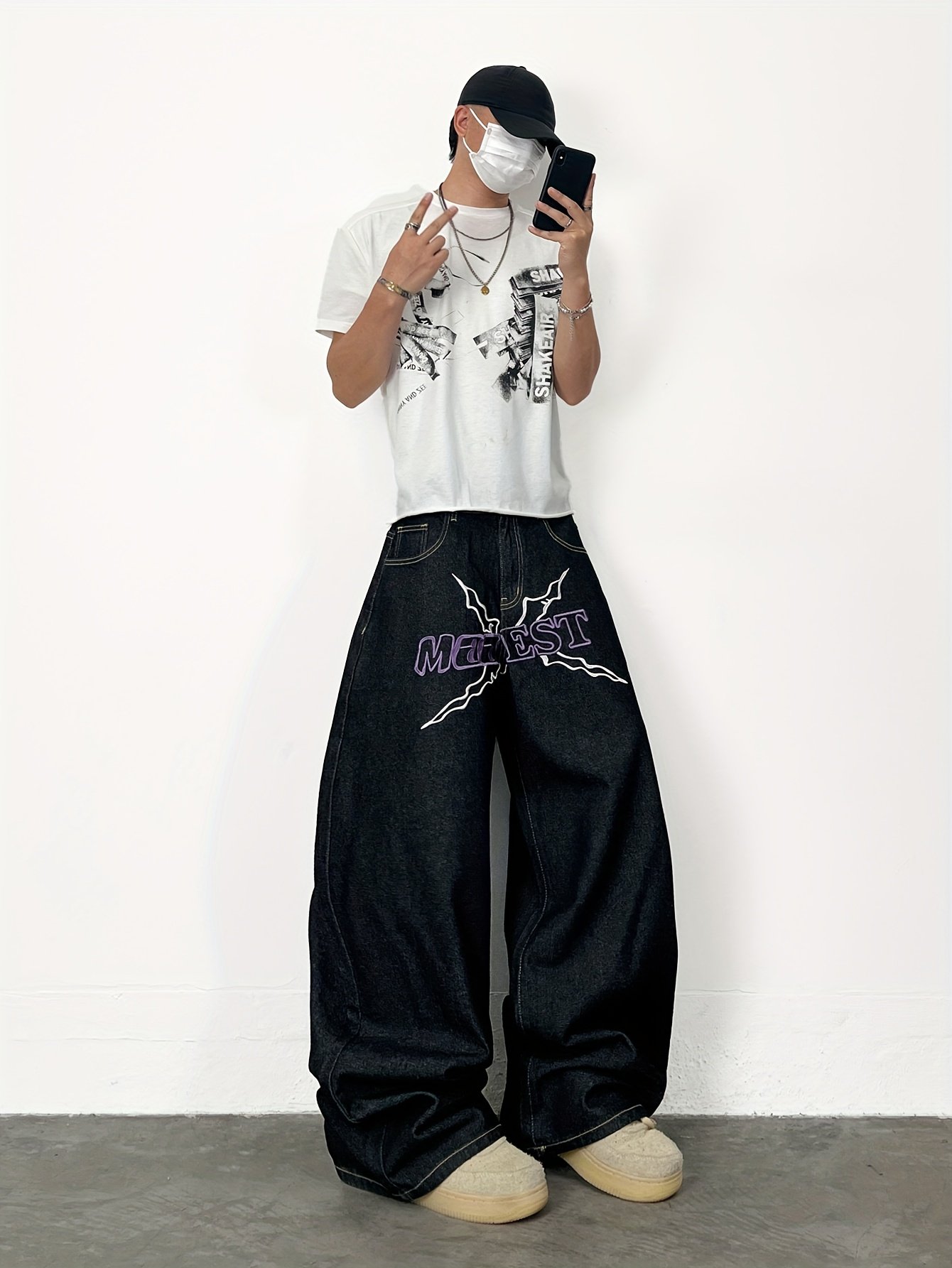 's & 's Oversized Vintage Wide-Leg Jeans – Y2K Streetwear Loose Fit Wash Blue Pants with Belt-Like Print No Belt Included, All-Season Casual Trousers for Retro 90s Style