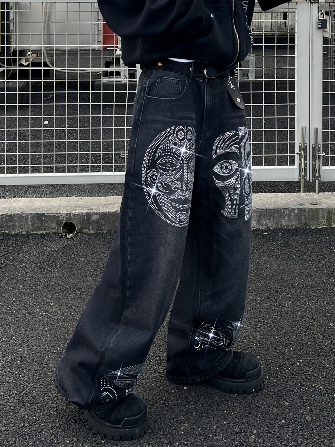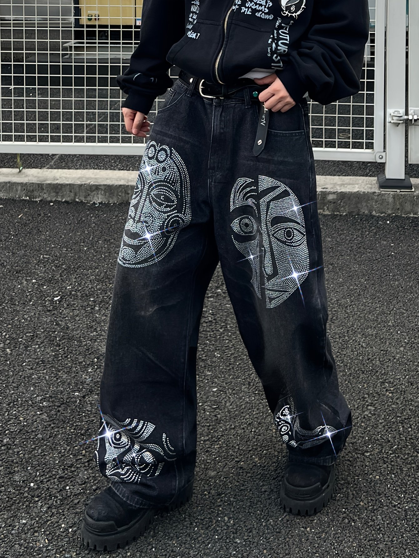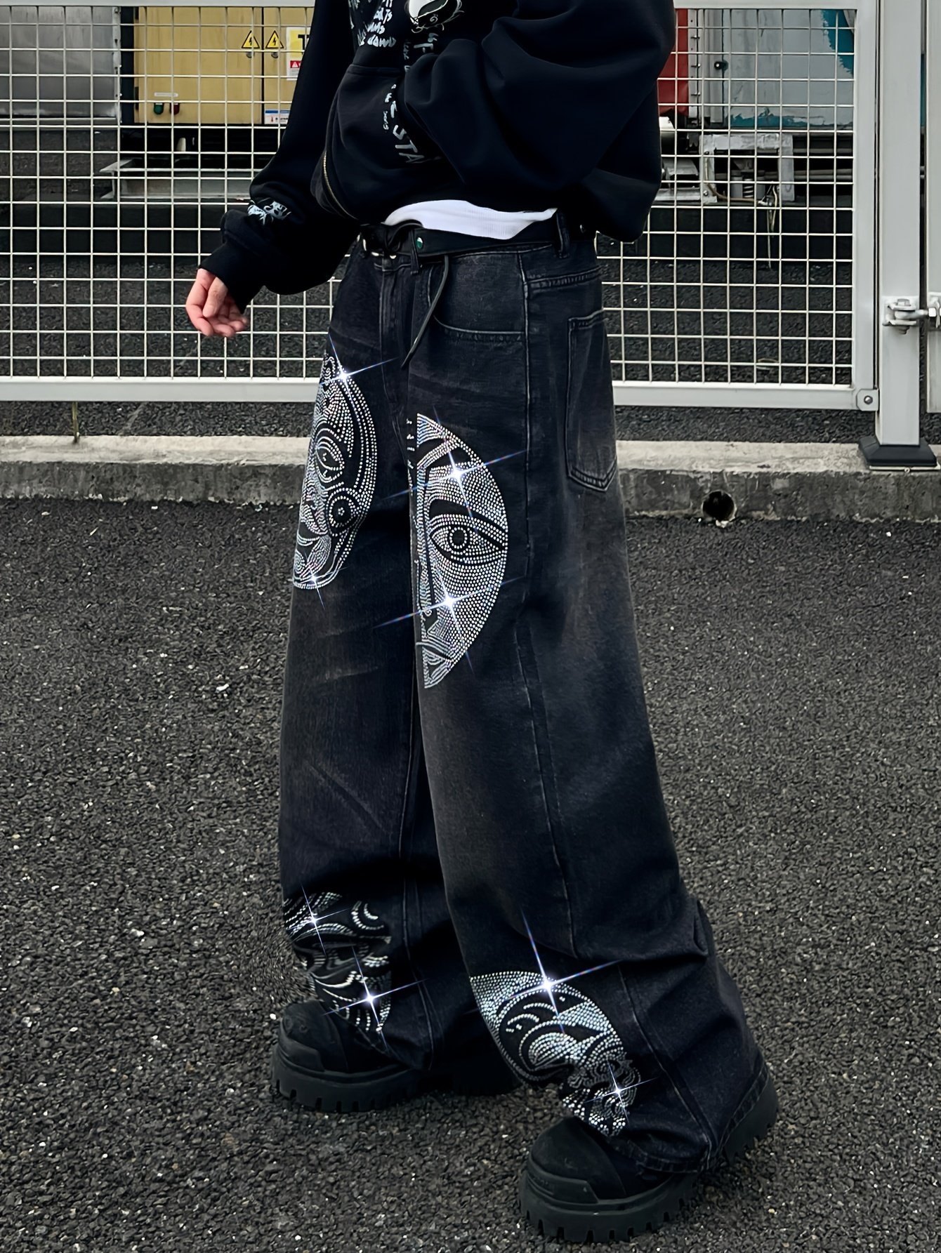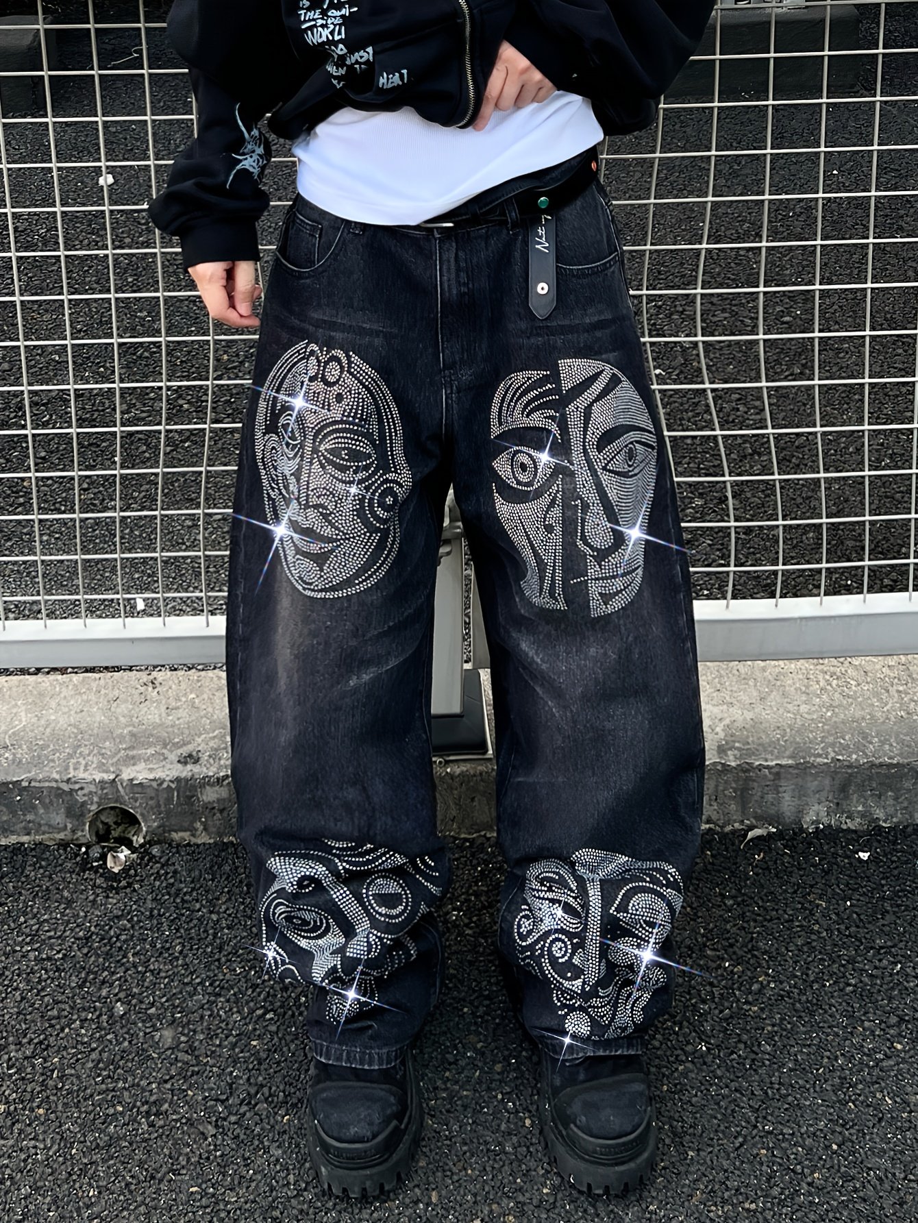 1pc American High Street Niche Design Rhinestone Loose Faux Denim, Distressed Washed Fashionable Versatile Wide Leg Pants, Unisex Without Belt/Without Accessories, Baggy Faux Denim/pants For Men, Pants Yk, Men'S Faux Denim