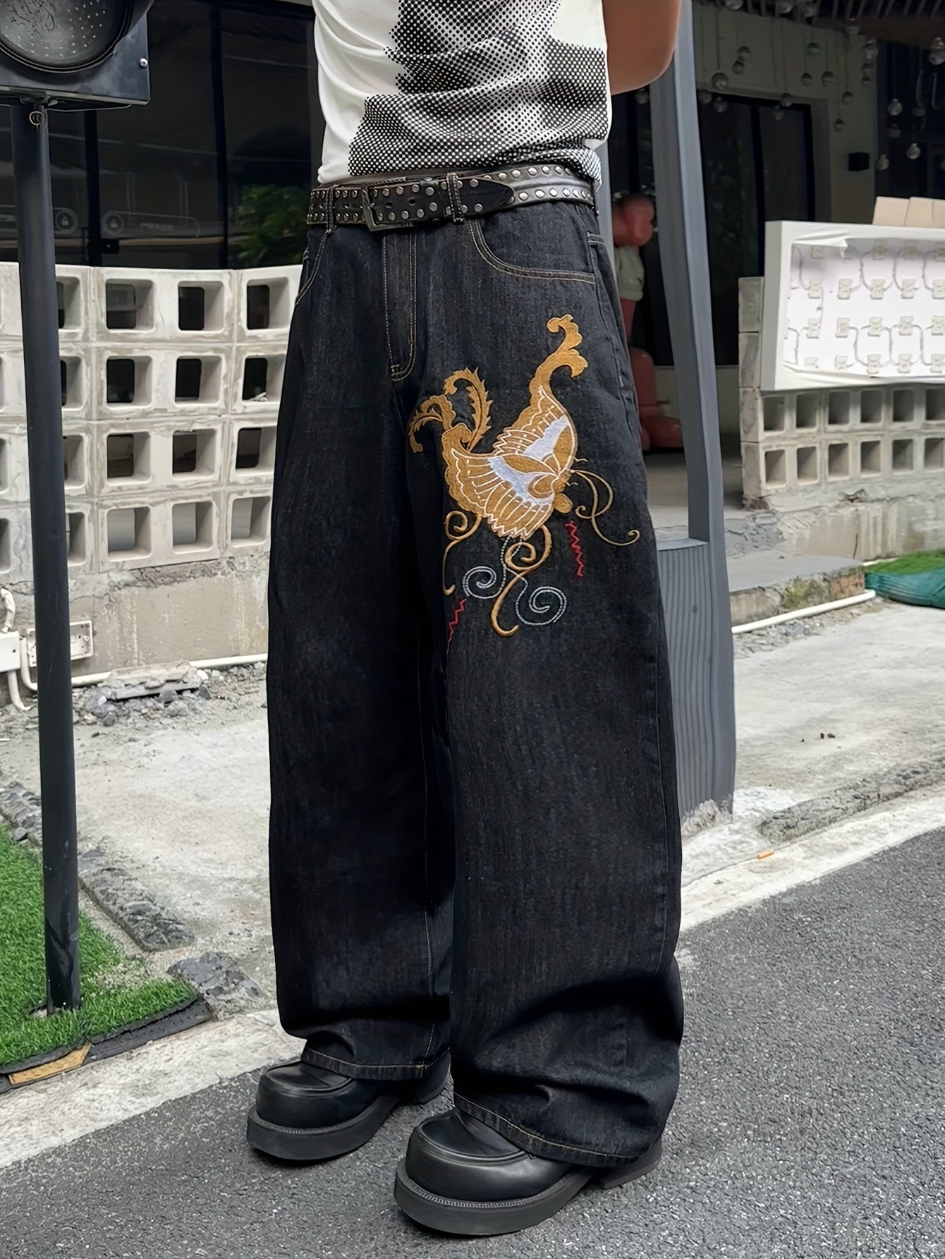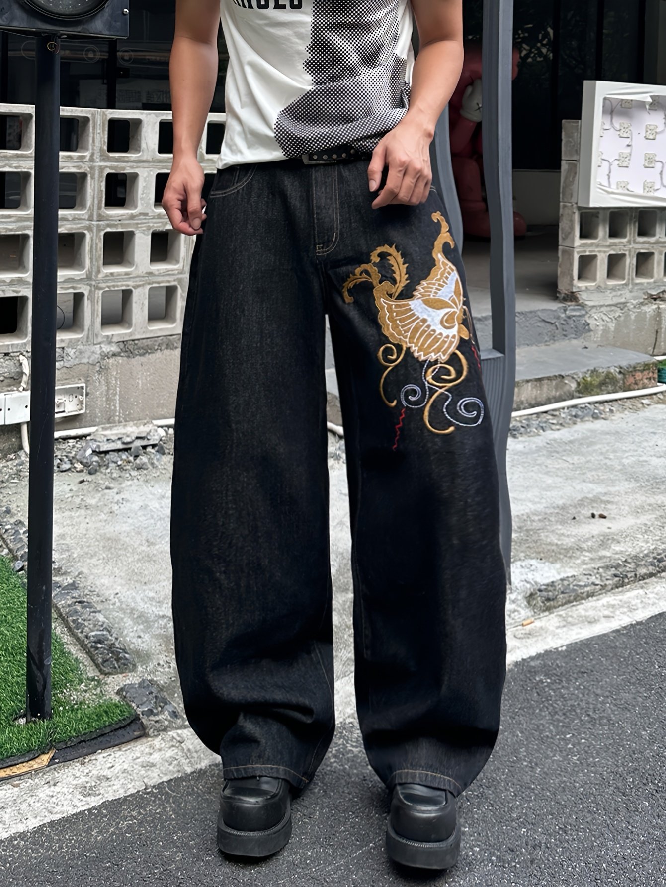 1pc Black Loose Faux Denim Streetwear Pants with Golden Embroidery – Unisex Wide-Leg Trousers, All-Season Casual & Formal Wear, Non-Stretch Fabric