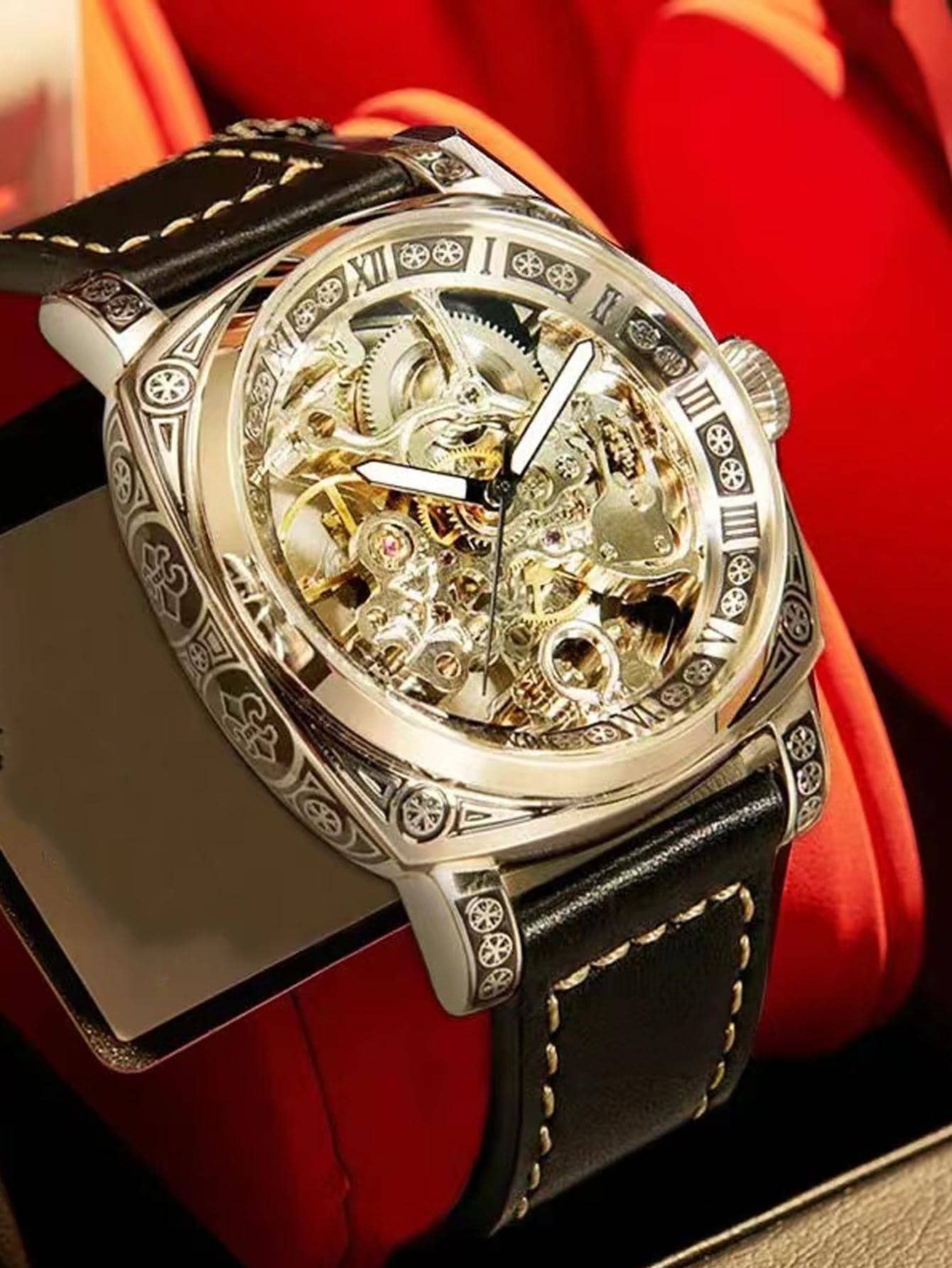 1pc Black PU Polyurethane Strap Business Glow In The Dark Round Dial Mechanical Watch, For Daily Life Father