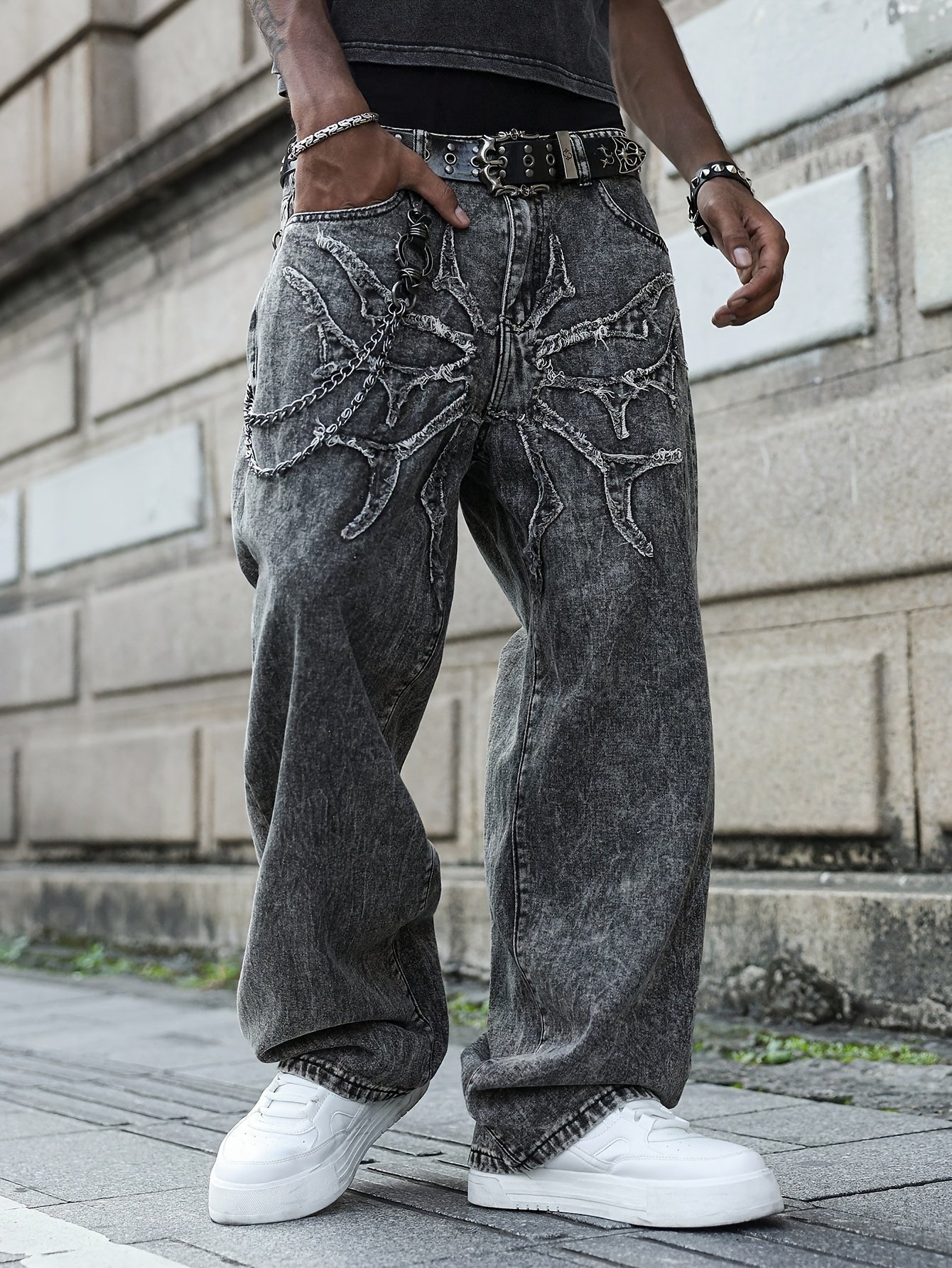 American Retro Jacquard Cross Star Print Men's Jeans, Light Luxury Niche Streetwear Loose Fit Straight Leg Pants, Jeans Special for Men, White Strech Jeans Regular Fit for Men, Cool Jeans, Mens Drawstring Jeans, Jeans for Men Plus Size, Cargo Jeans Pants