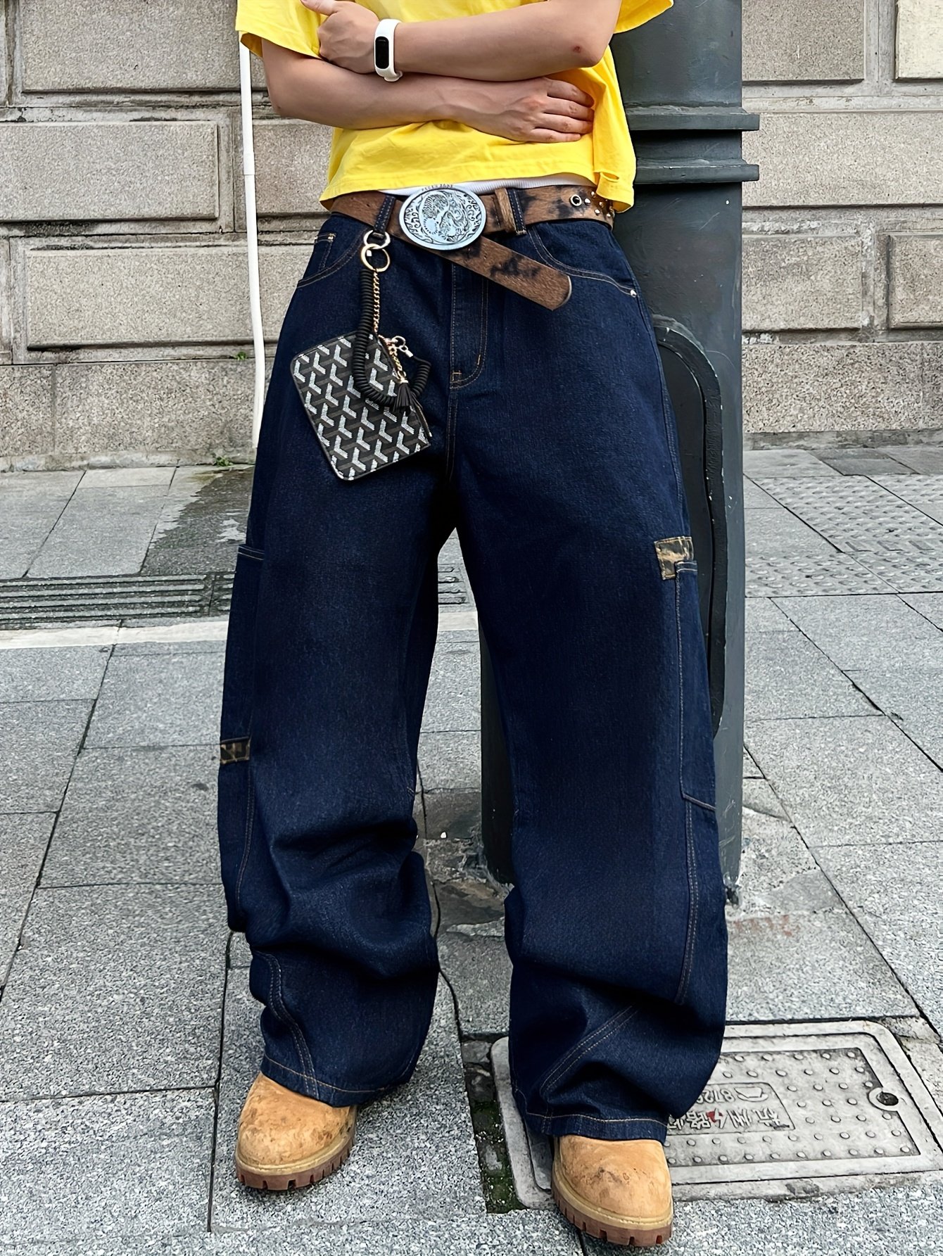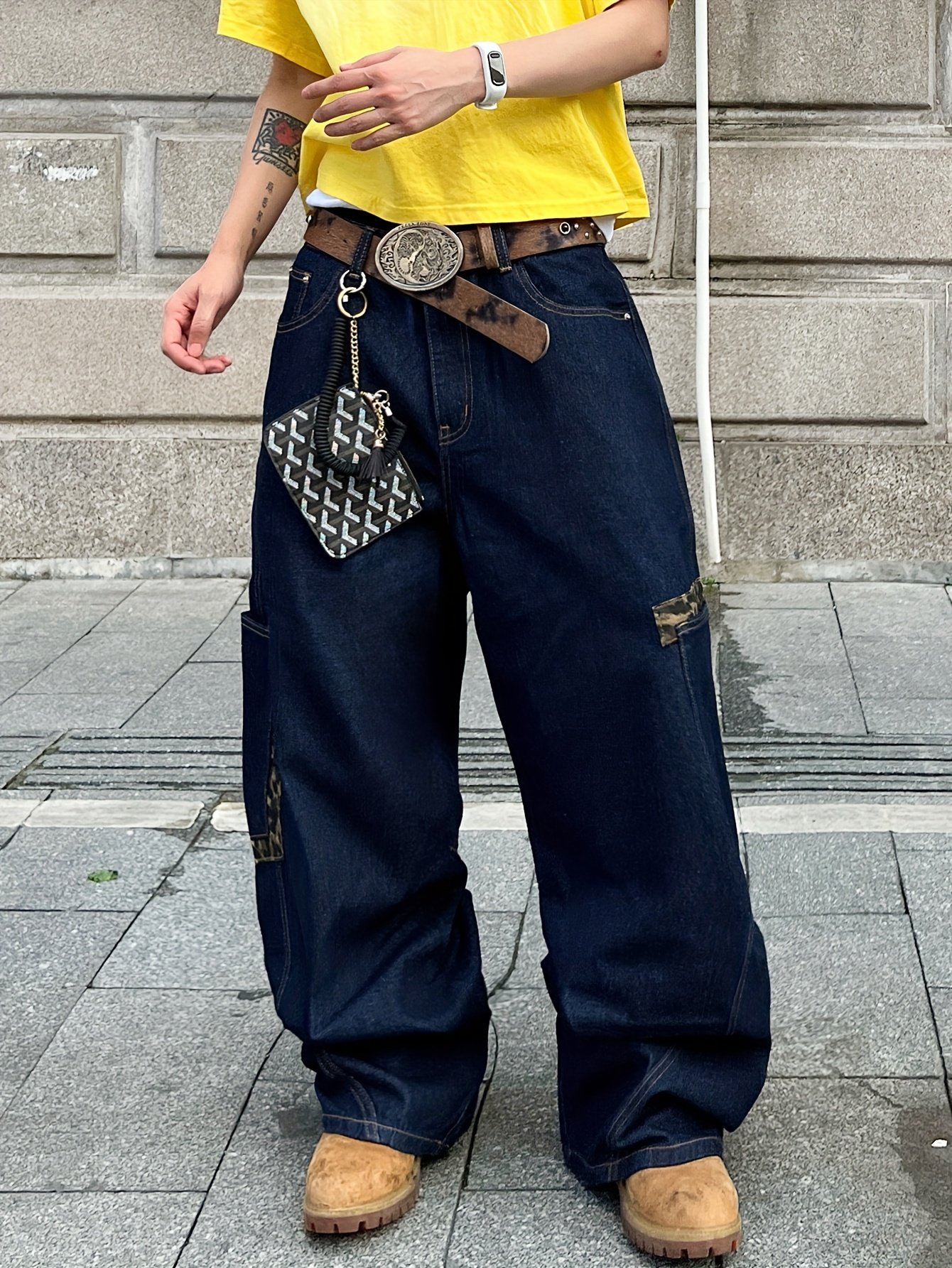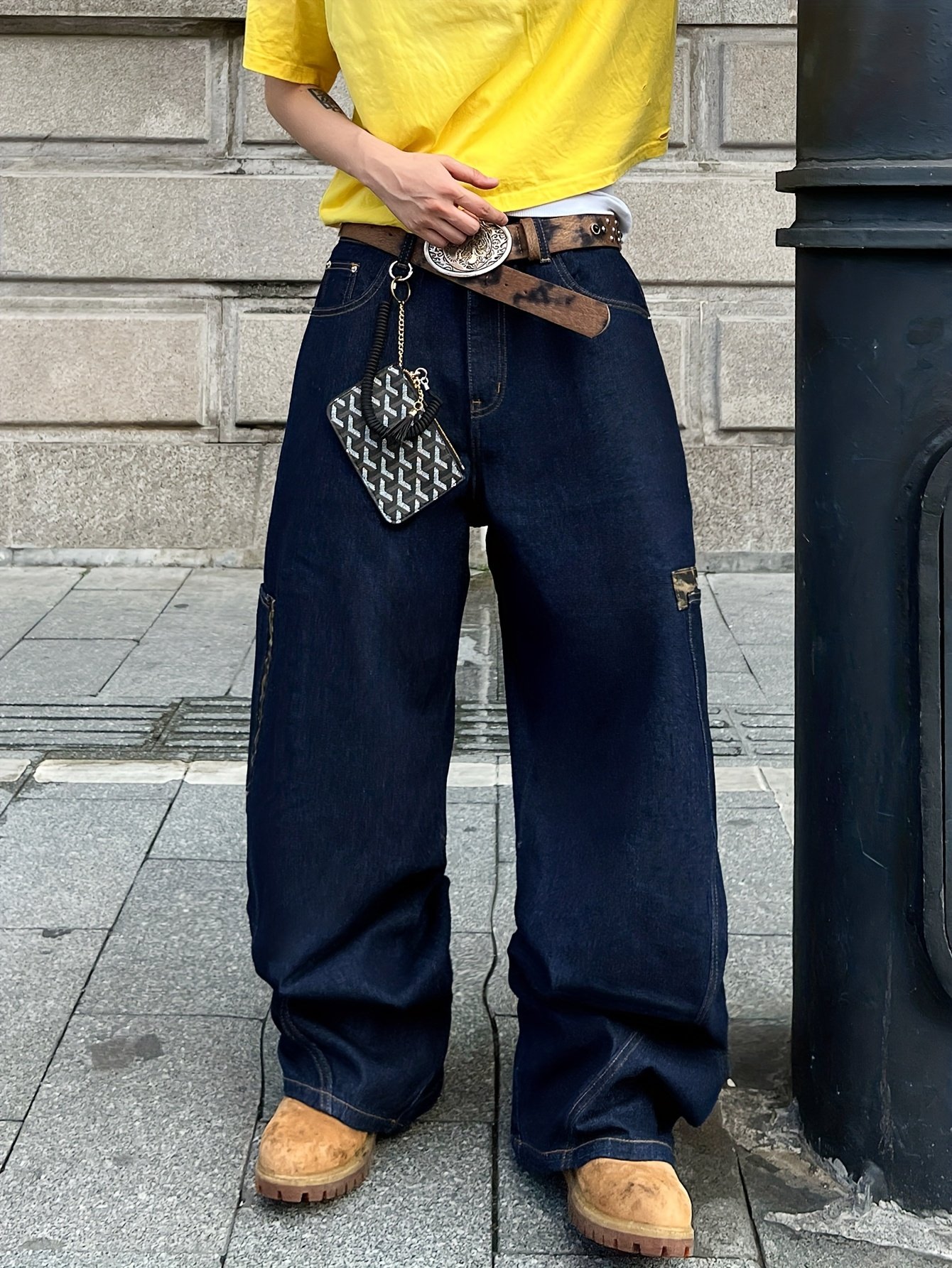 1pc Men'S Vintage Washed Patchwork Cargo Jeans, Loose Fit Denim Wide Leg Pants with Multiple Pockets, Street Style All-Season Trousers – No Belt/No Pendant Included, Casual Wear Jeans|Vintage Jeans Style|Stylish Casual Wear, Jeans for Adults
