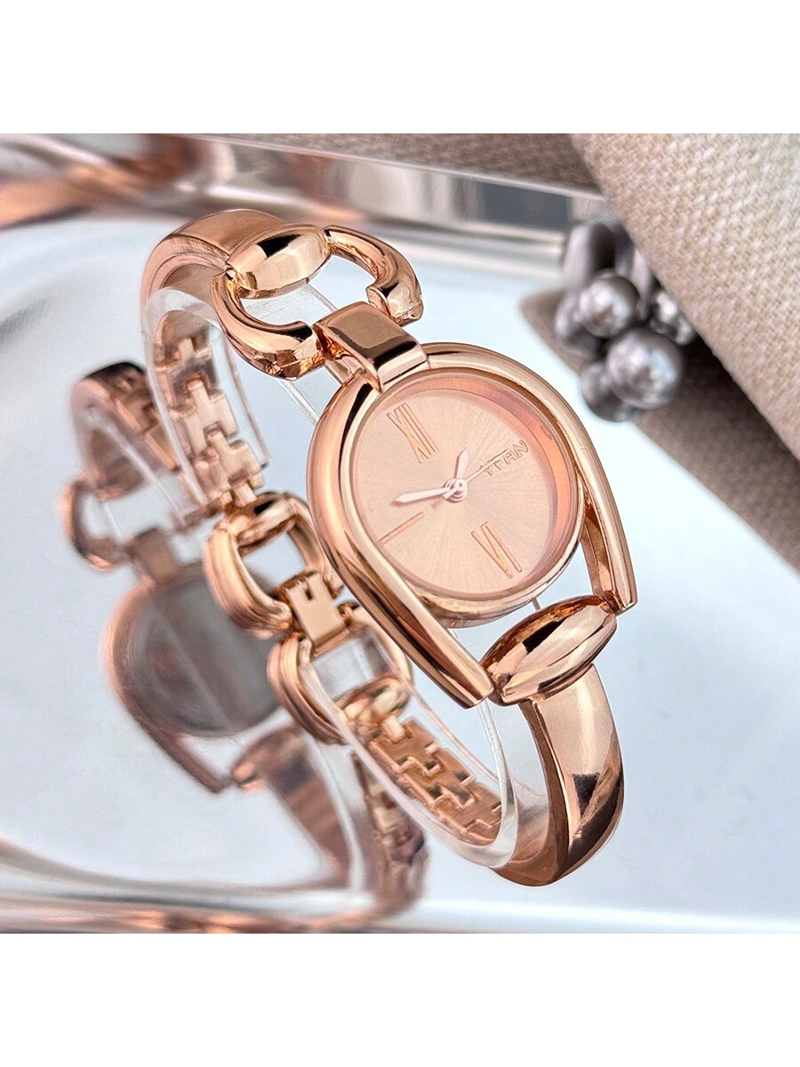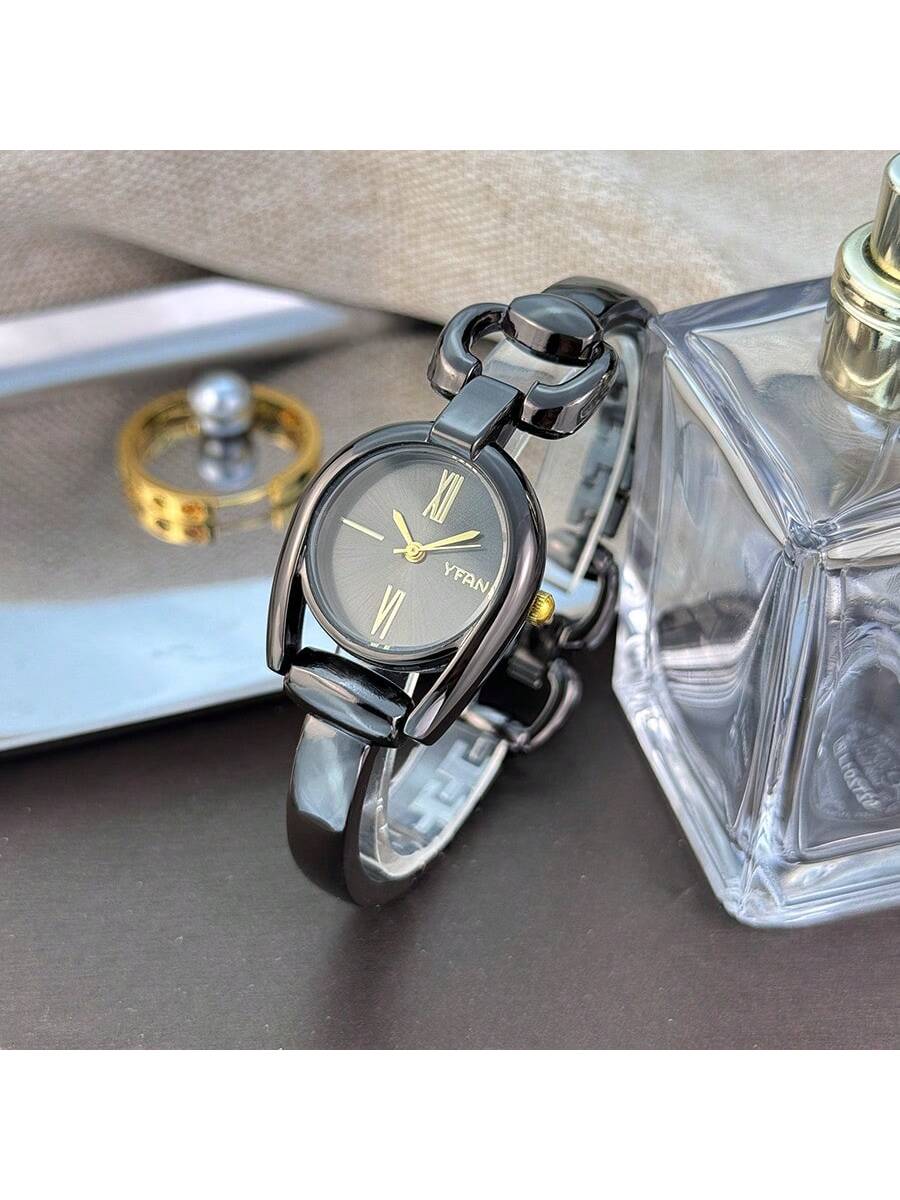 1pc Green Women's Horseshoe Shaped Case Simple Colored Dial & Metallic Alloy Strap Stylish Quartz Watch, Suitable For Daily Wear