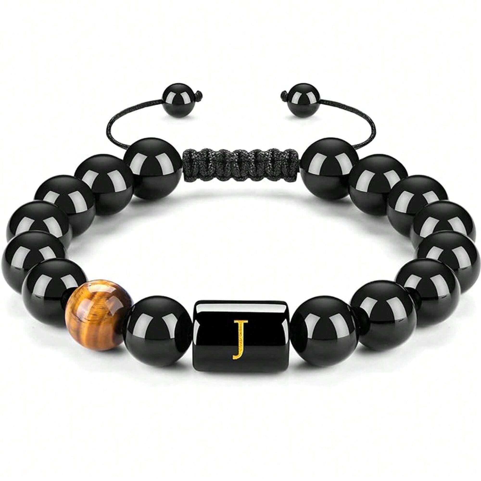 1pc Initial Men's Beaded Woven Bracelet Natural Black Agate Tiger Eye Stone Bead Woven Rope With Meaningful Bracelet