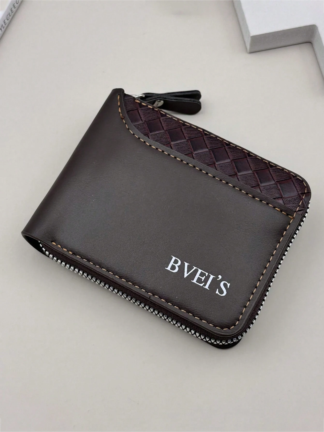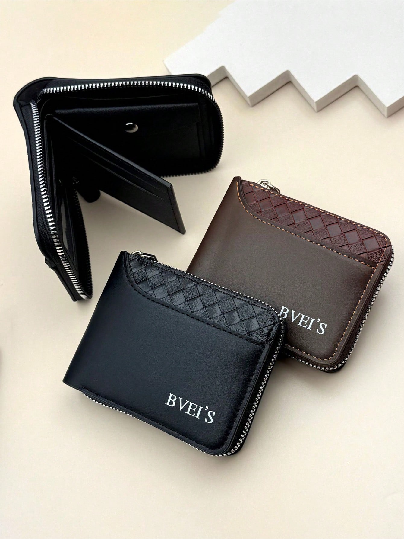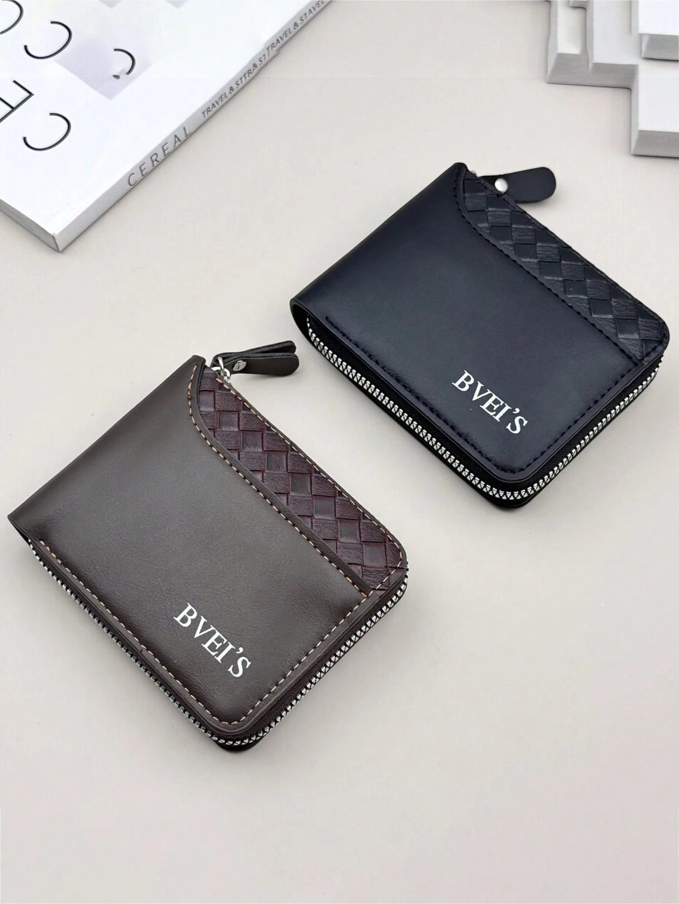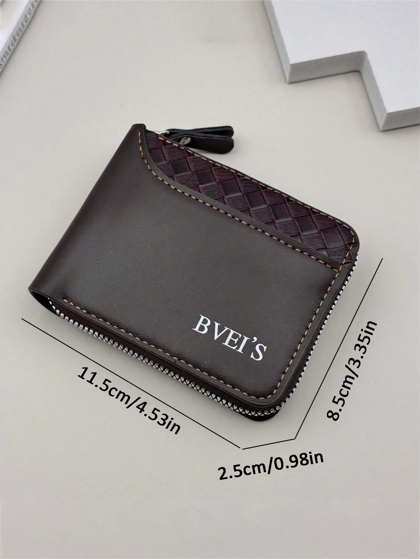 1pc Men's Short PU Leather Wallet, Fashionable Plaid Soft Wallet, Horizontal Zipper Wallet Bifold Coin Purse, Woven Pattern Patchwork Wallet, Large Capacity Multi-Card Slots, Can Hold Large Bills, ID Photo Slot, Letter Decor, Simple Coin Pocket, Credit/Ba