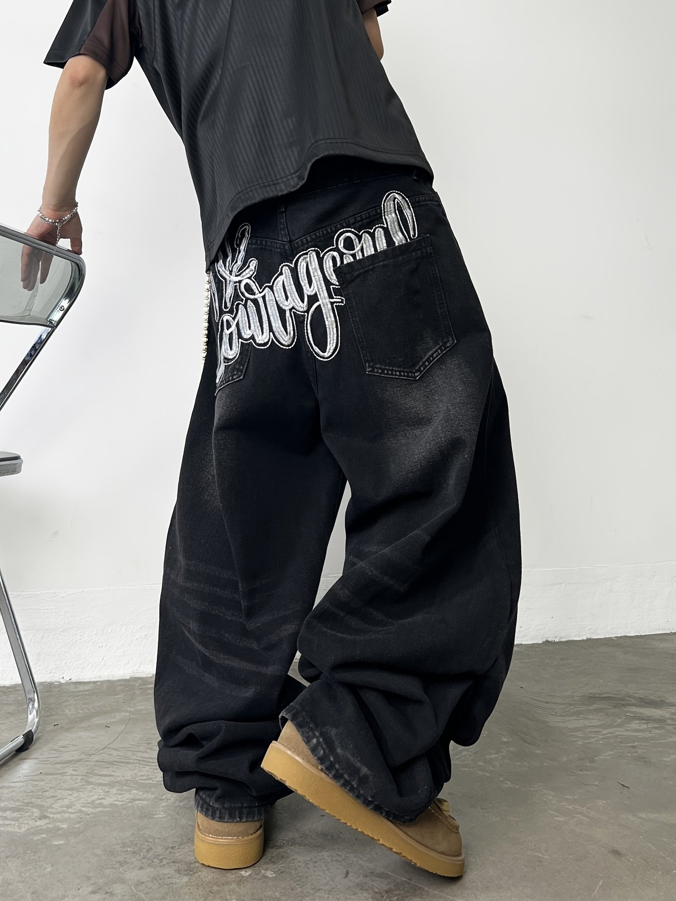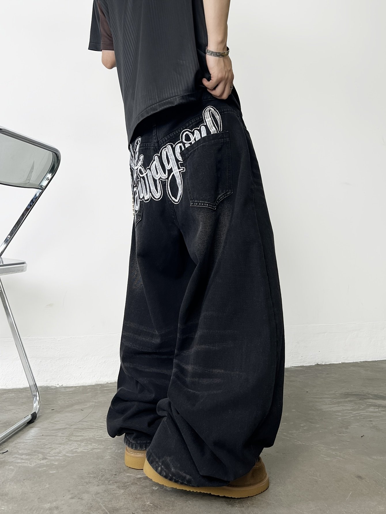 1pc Men's & Women's High-Waisted Distressed Jumbo Jeans – Heavy-Duty Wide-Leg Streetwear Pants with Belt Loop Holes, Machine Washable, All-Season Comfort, Loose-Fit Tapered Leg & Cuffed Hem No Belt/No Accessories – Bold Lettering & Embellished Detailing