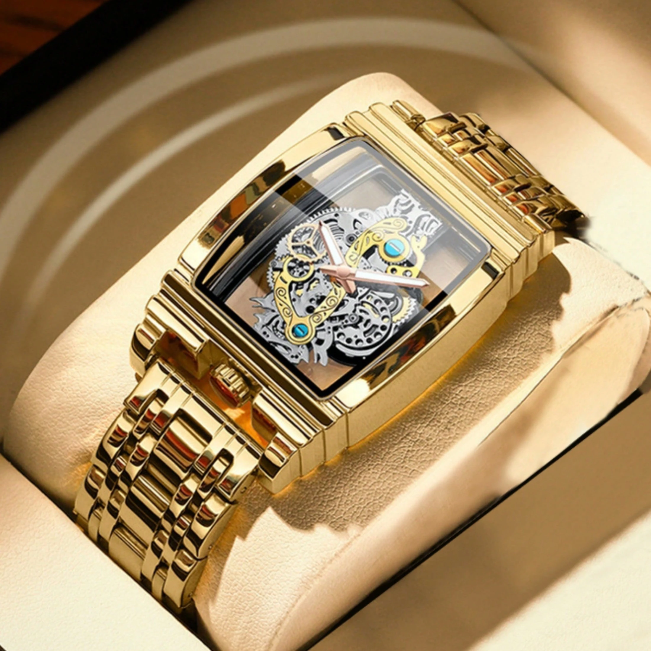 1PC Men's Wristwatch, Luminous Hands, 30-Meter Water Resistance, Mineral Glass Crystal, 316 Stainless Steel Strap, Barrel-Shaped Three-Dimensional Dial, Tourbillon Design, Locomotive Gear Skeleton Watch, Luxury Gold Men's Watch, Casual Sports Watch, For D