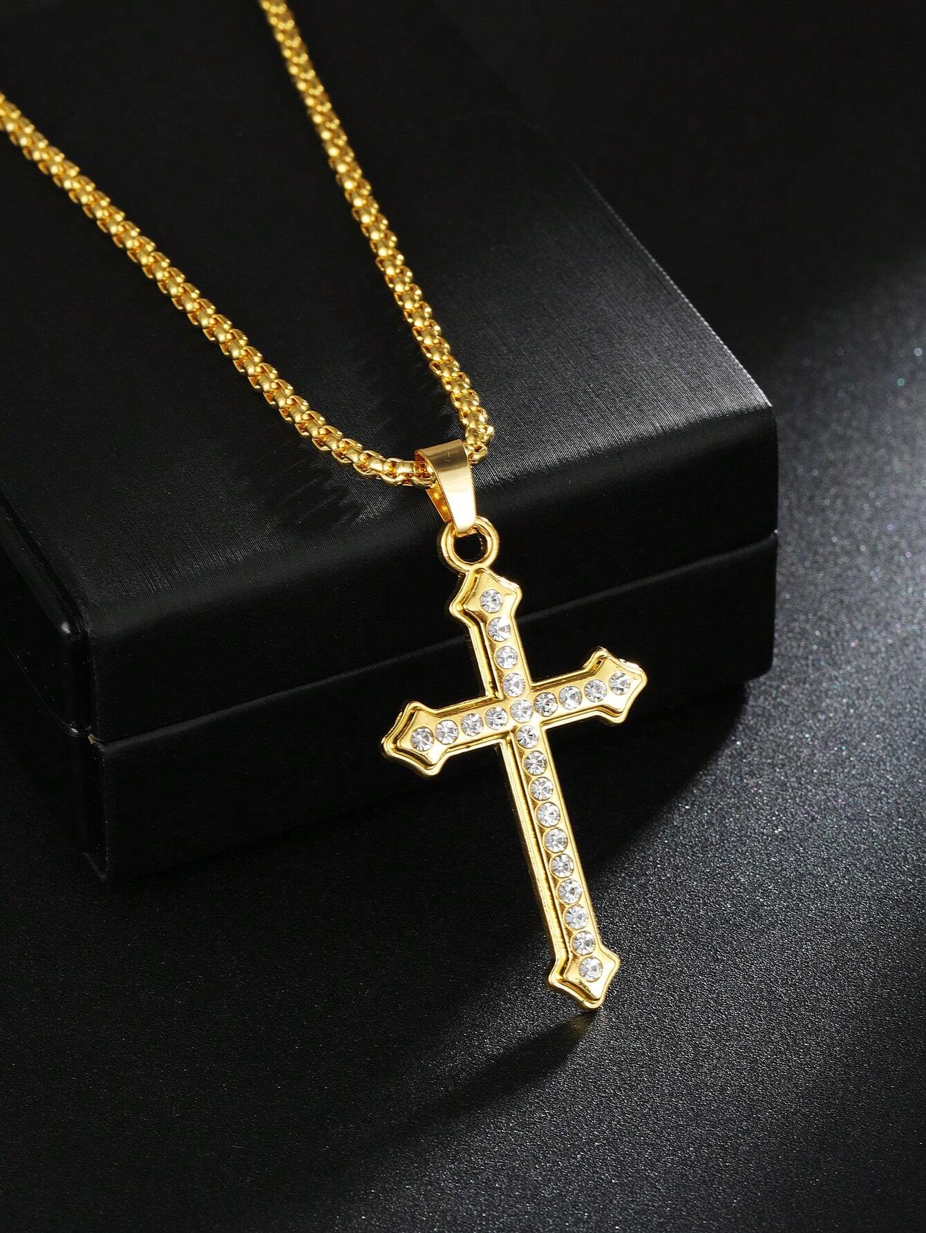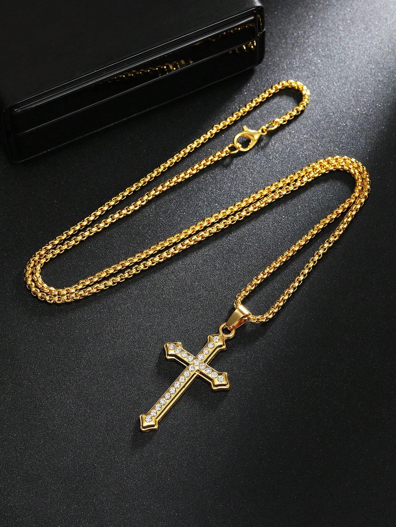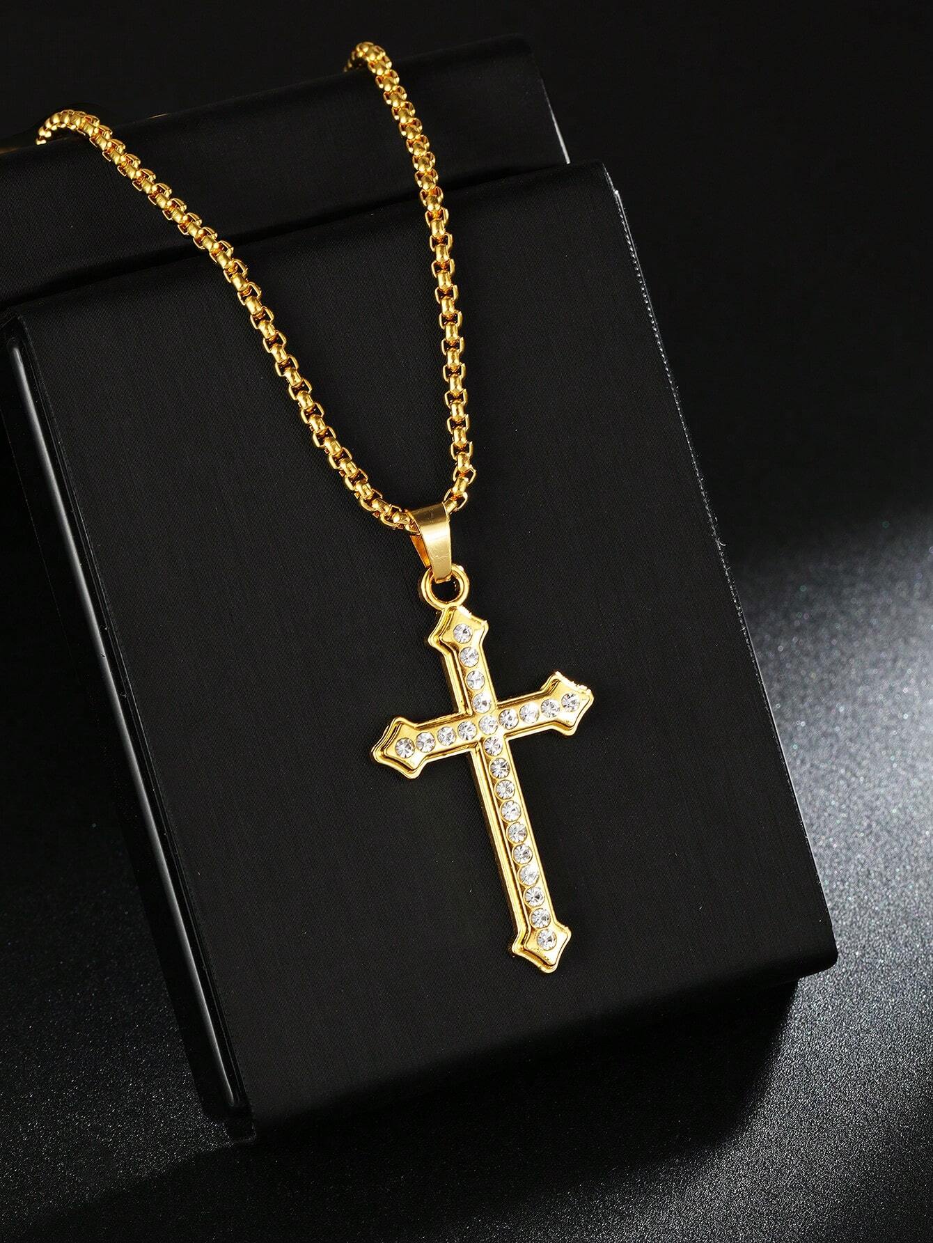 1pc New Minimalist Personalized Rhinestone Inlaid Stainless Steel Cross Necklace, Gift, Wholesale, Cross-Border, High-End, Long Sweater Chain, Gold-Plated, Rhinestone Cross Pendant Necklace, Birthday Jewelry, European And American Fashion, Hip-Hop Pendant