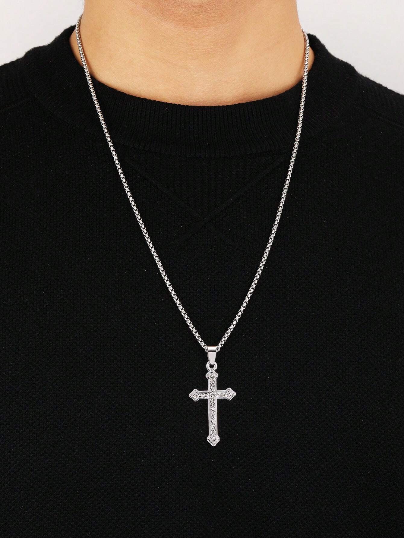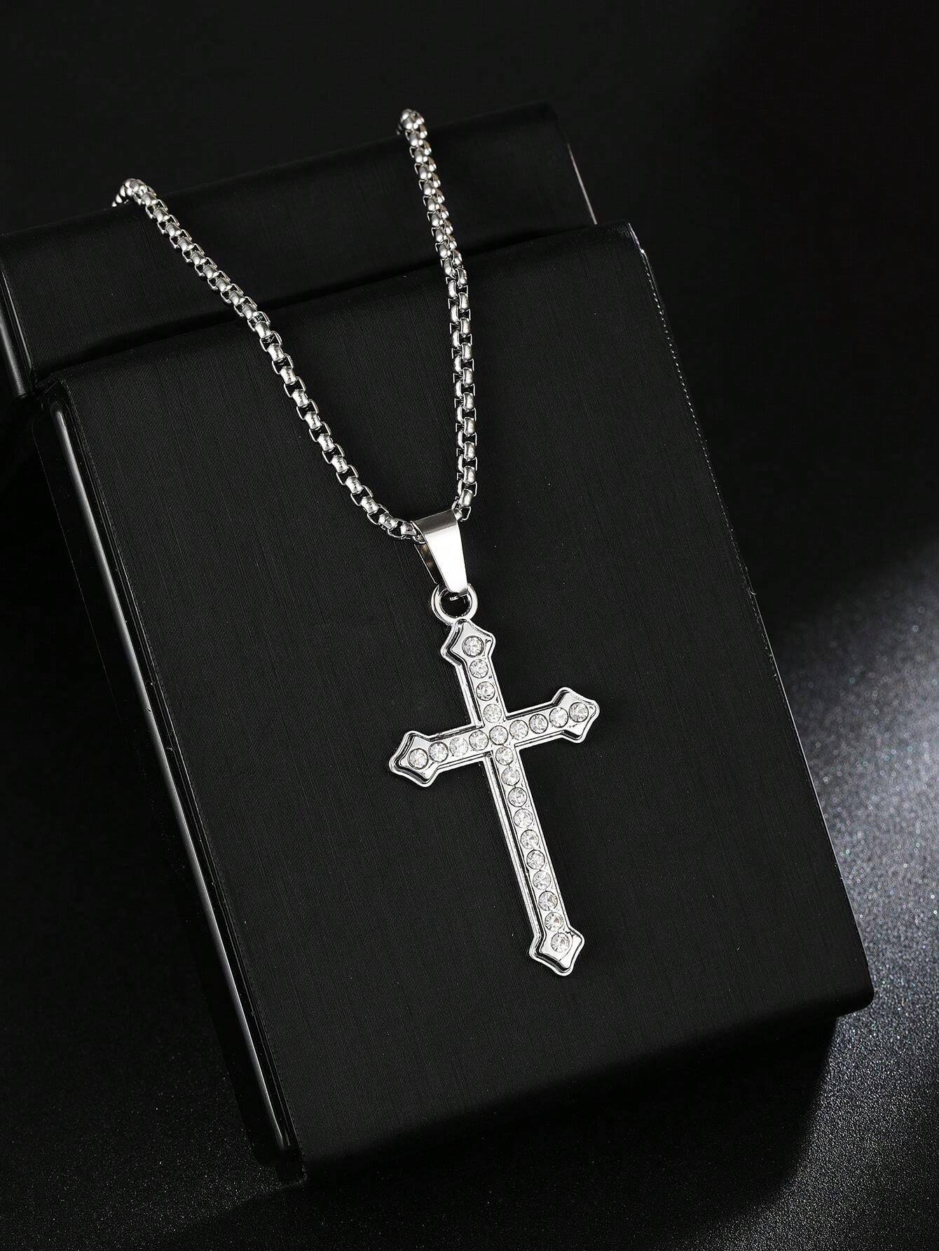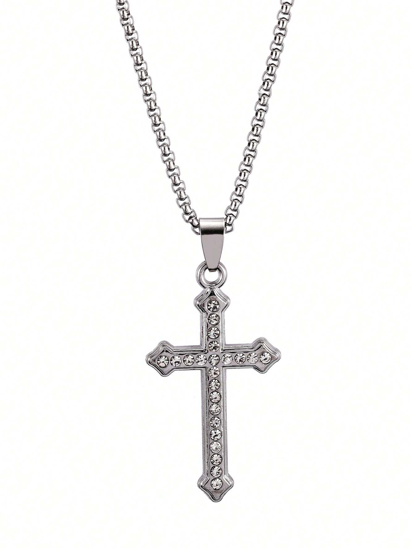 1pc New Minimalist Personalized Rhinestone Inlaid Stainless Steel Cross Necklace, Gift, Wholesale, Cross-Border, High-End, Long Sweater Chain, Gold-Plated, Rhinestone Cross Pendant Necklace, Birthday Jewelry, European And American Fashion, Hip-Hop Pendant