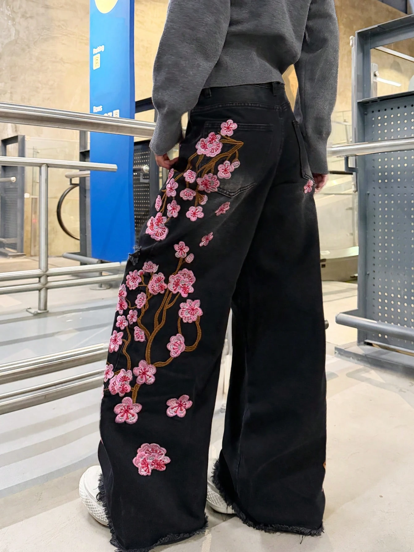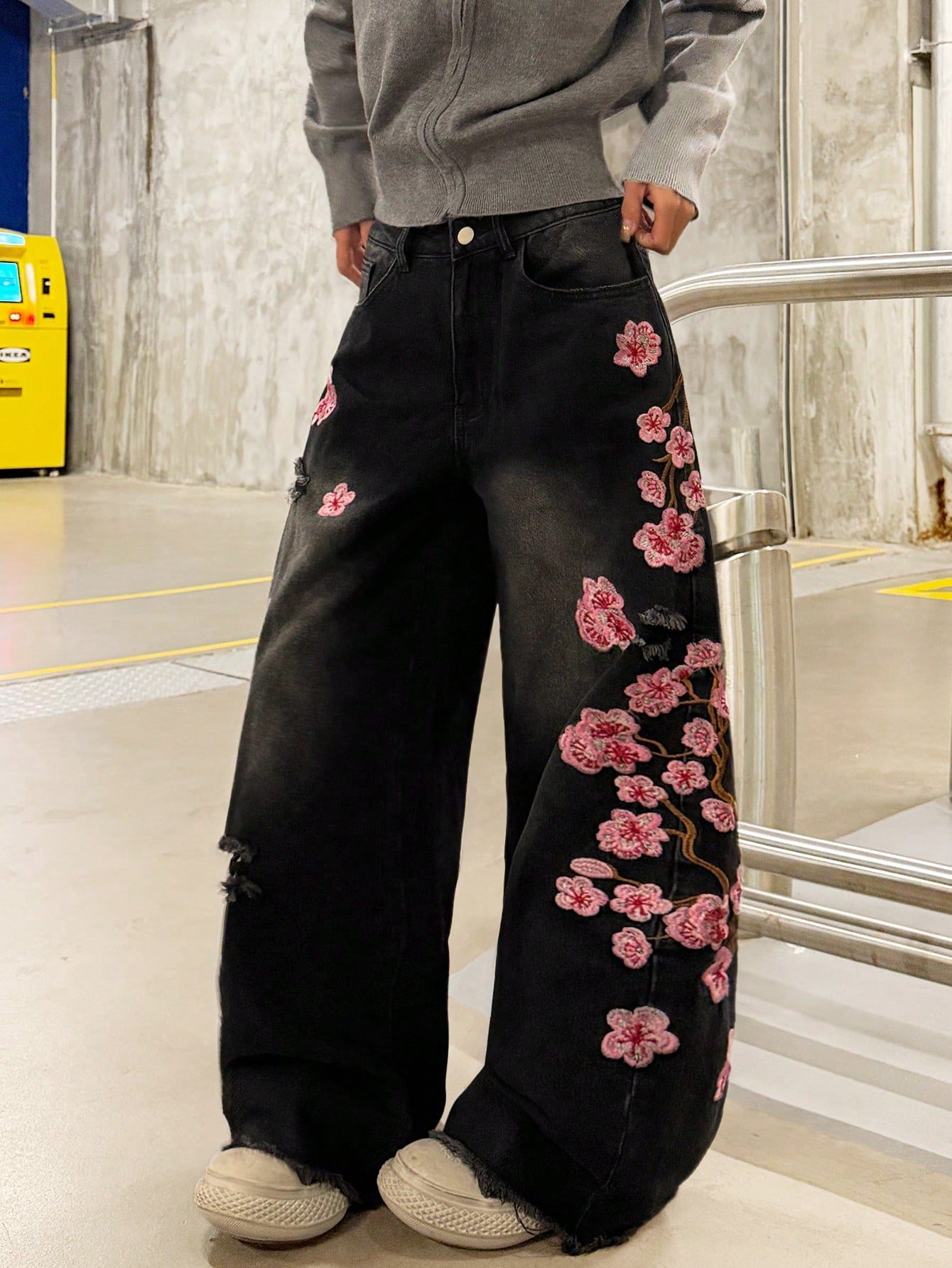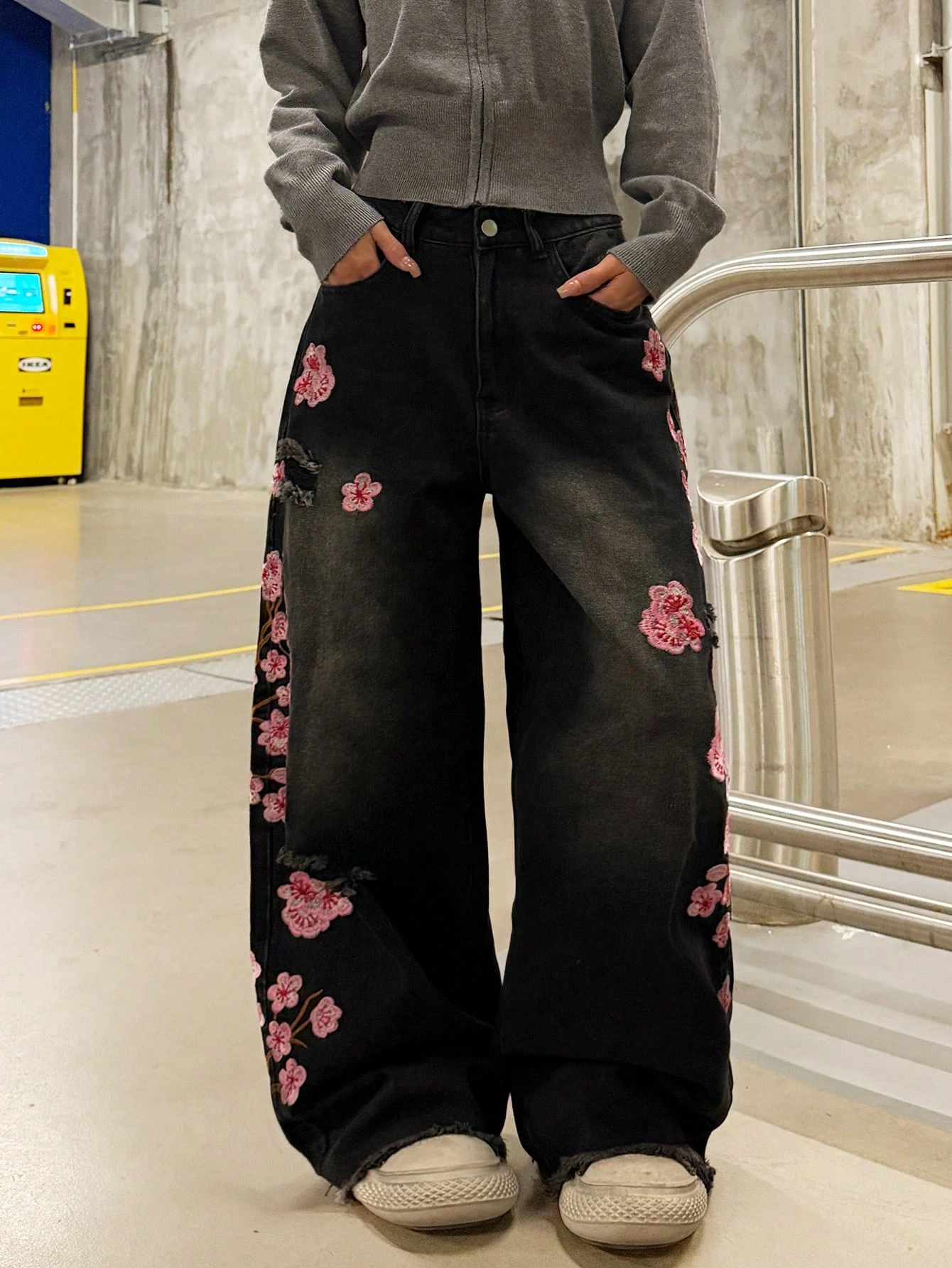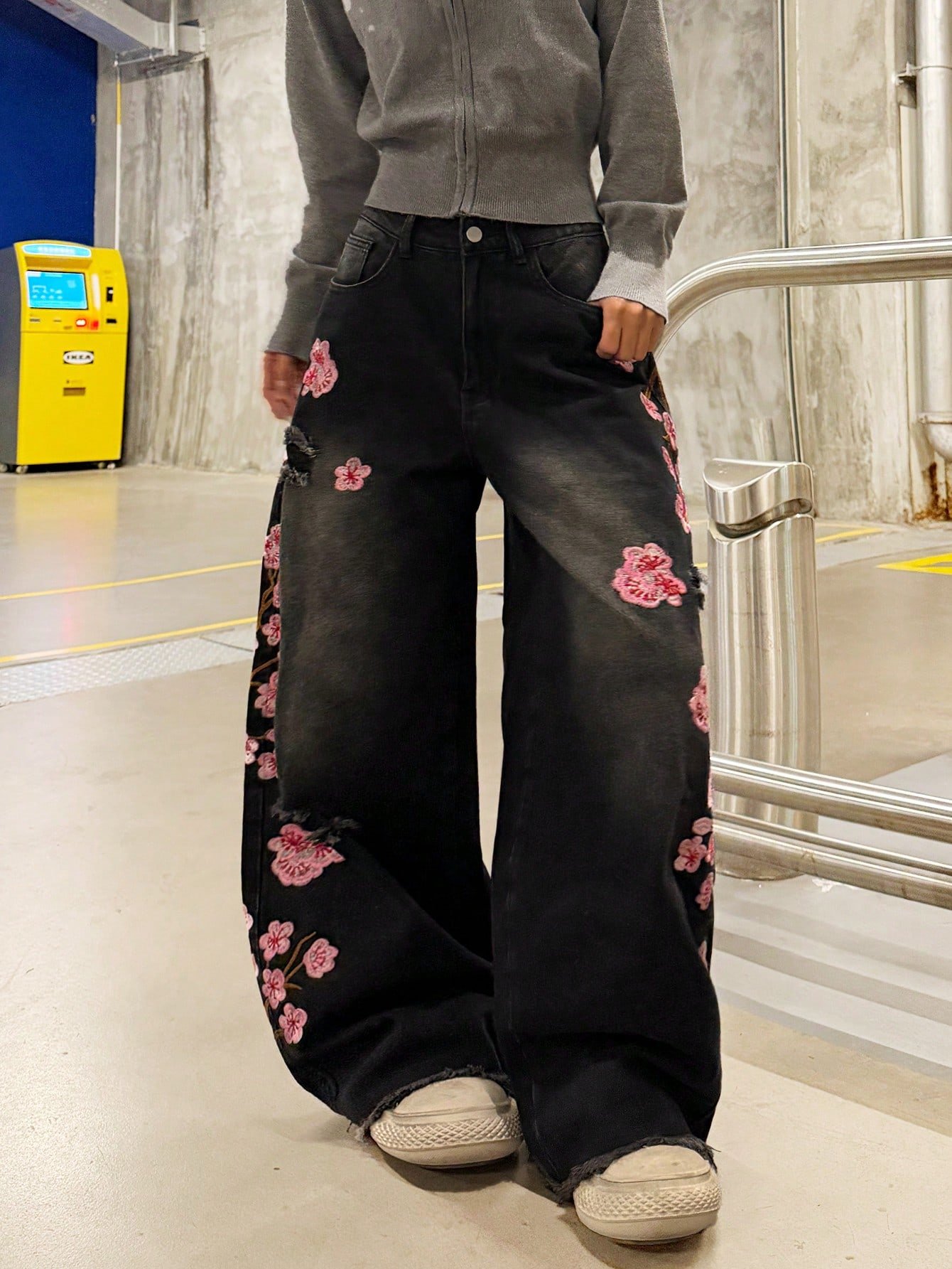 1pc Women's Distressed Embroidered Wide Leg Jeans, Loose & Comfortable, Versatile High Street Casual Pants, All Season Belt/Accessories Not Included