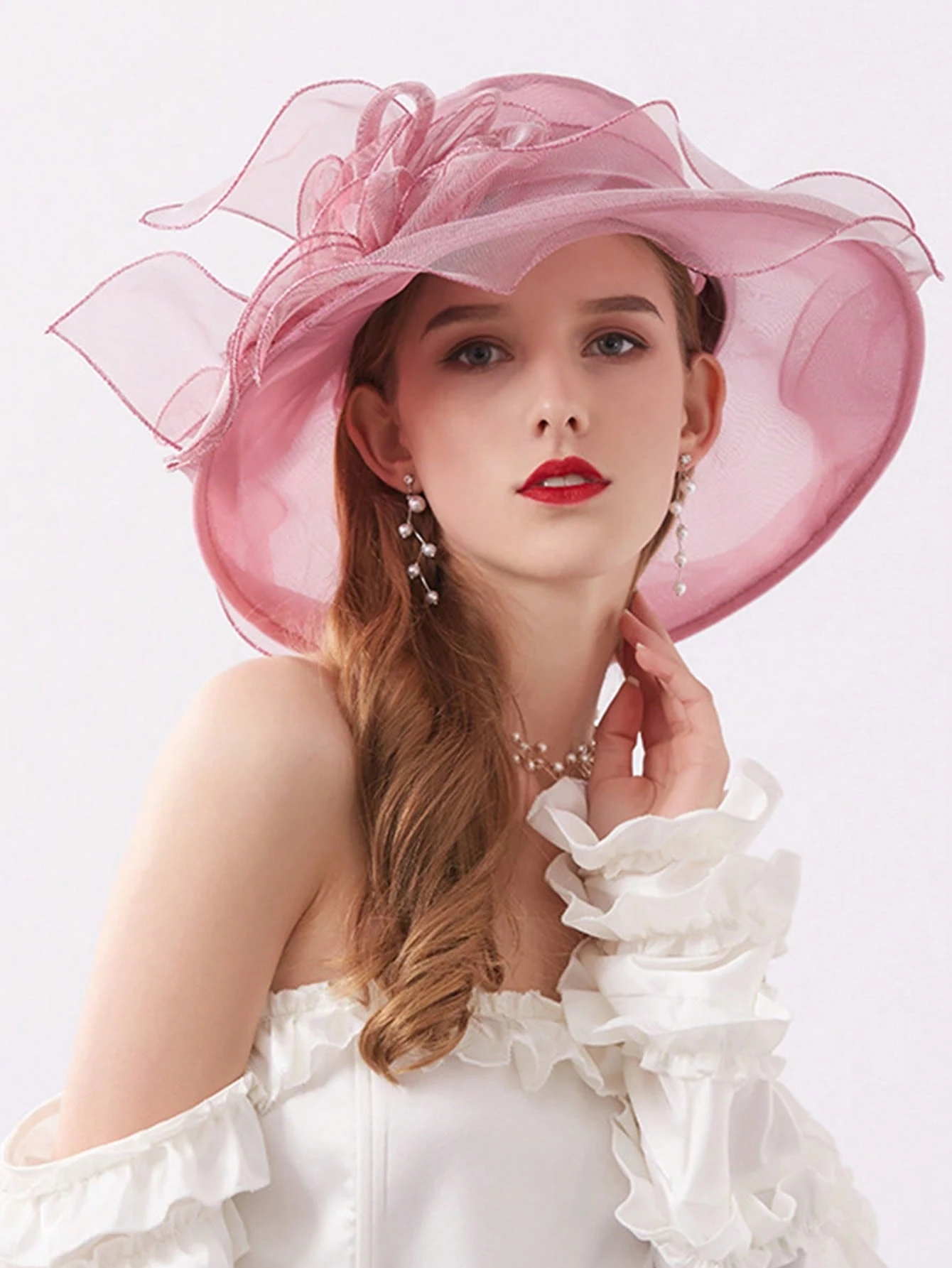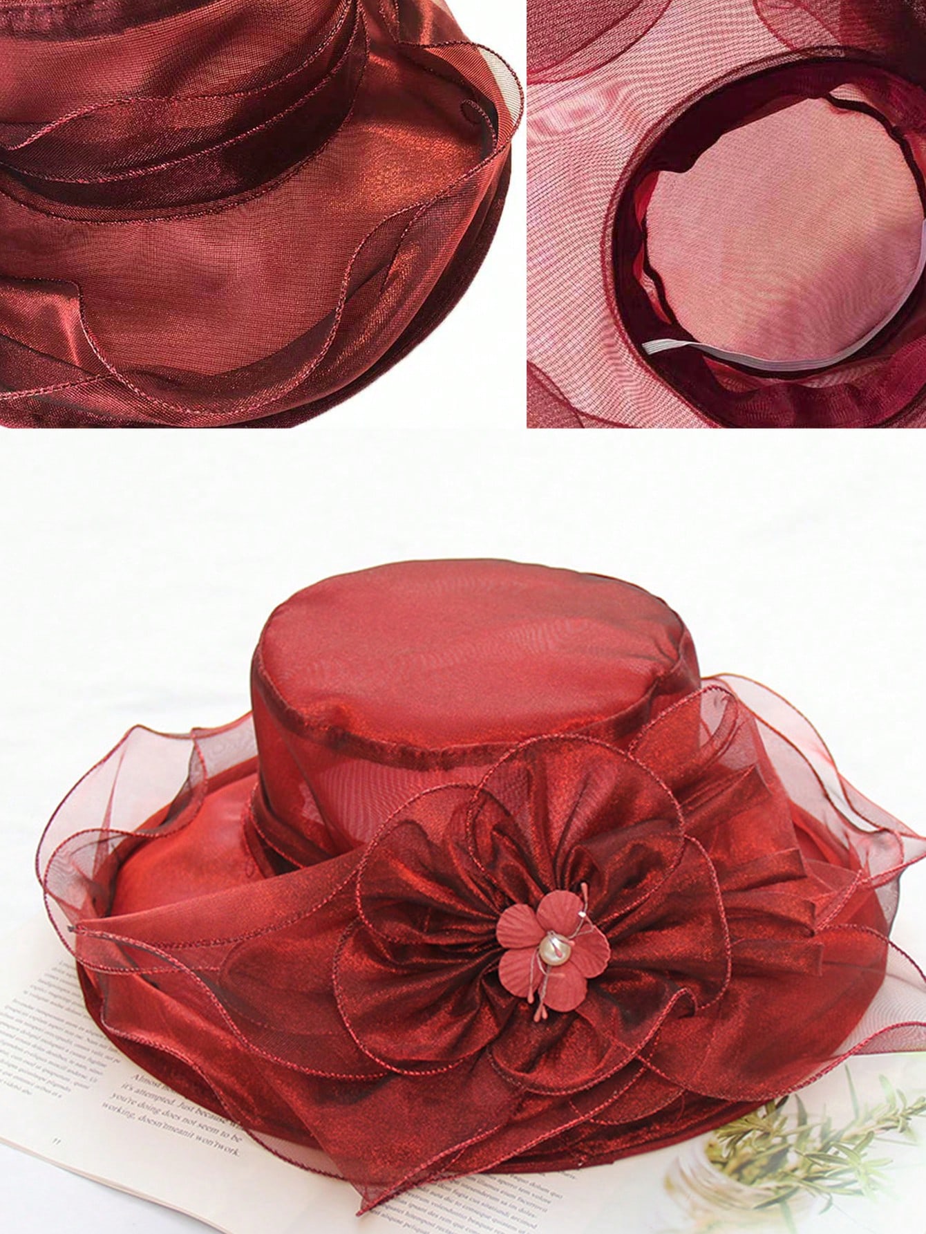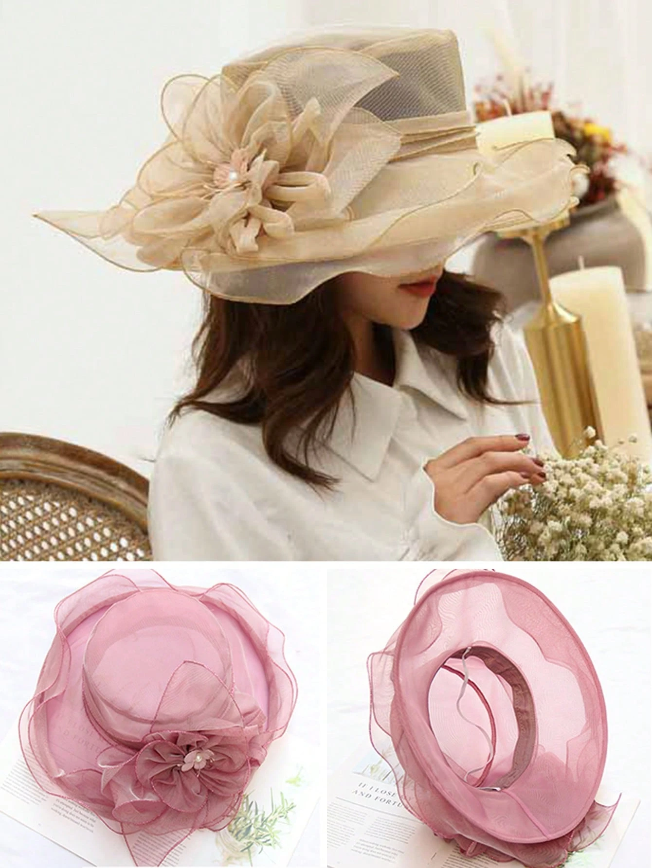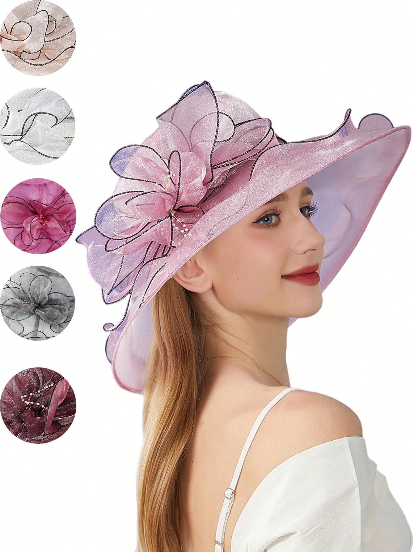 1pc Women's Organza Church Kentucky Derby Hat, Removable Flower Decor, Wide Brim Lace Organza Floral Sun Hat For Bride Tea Party Wedding