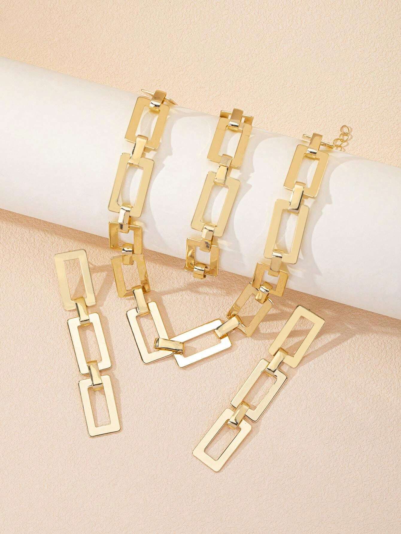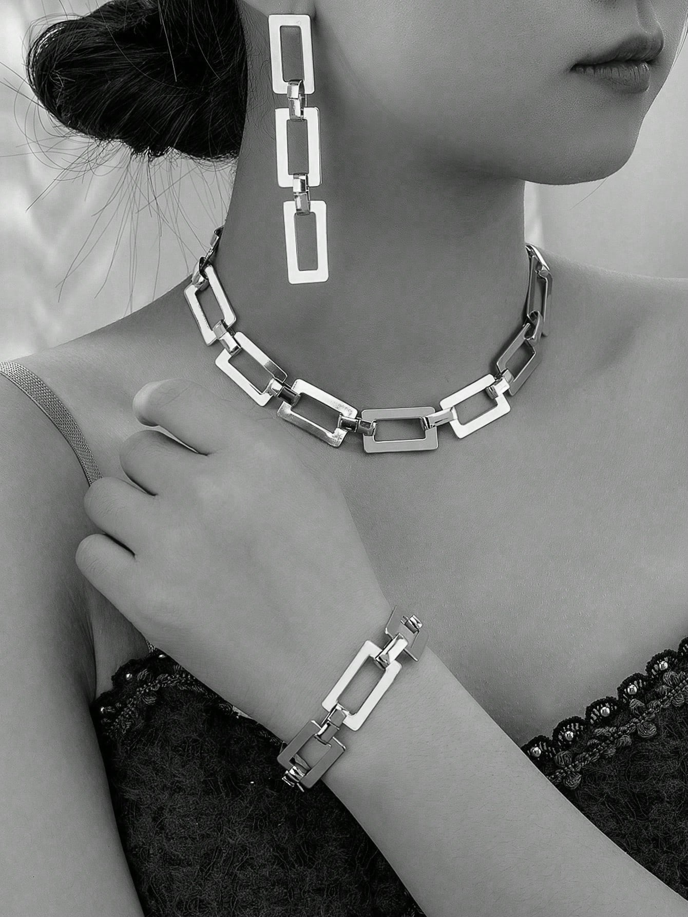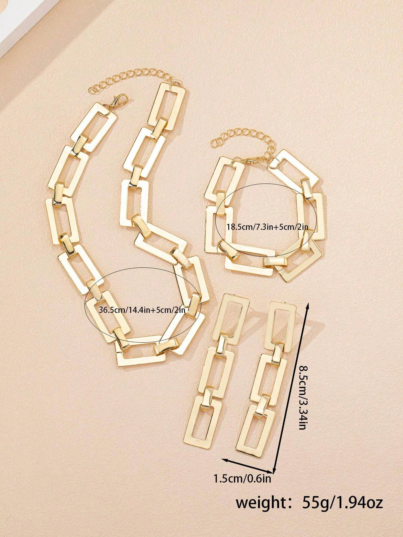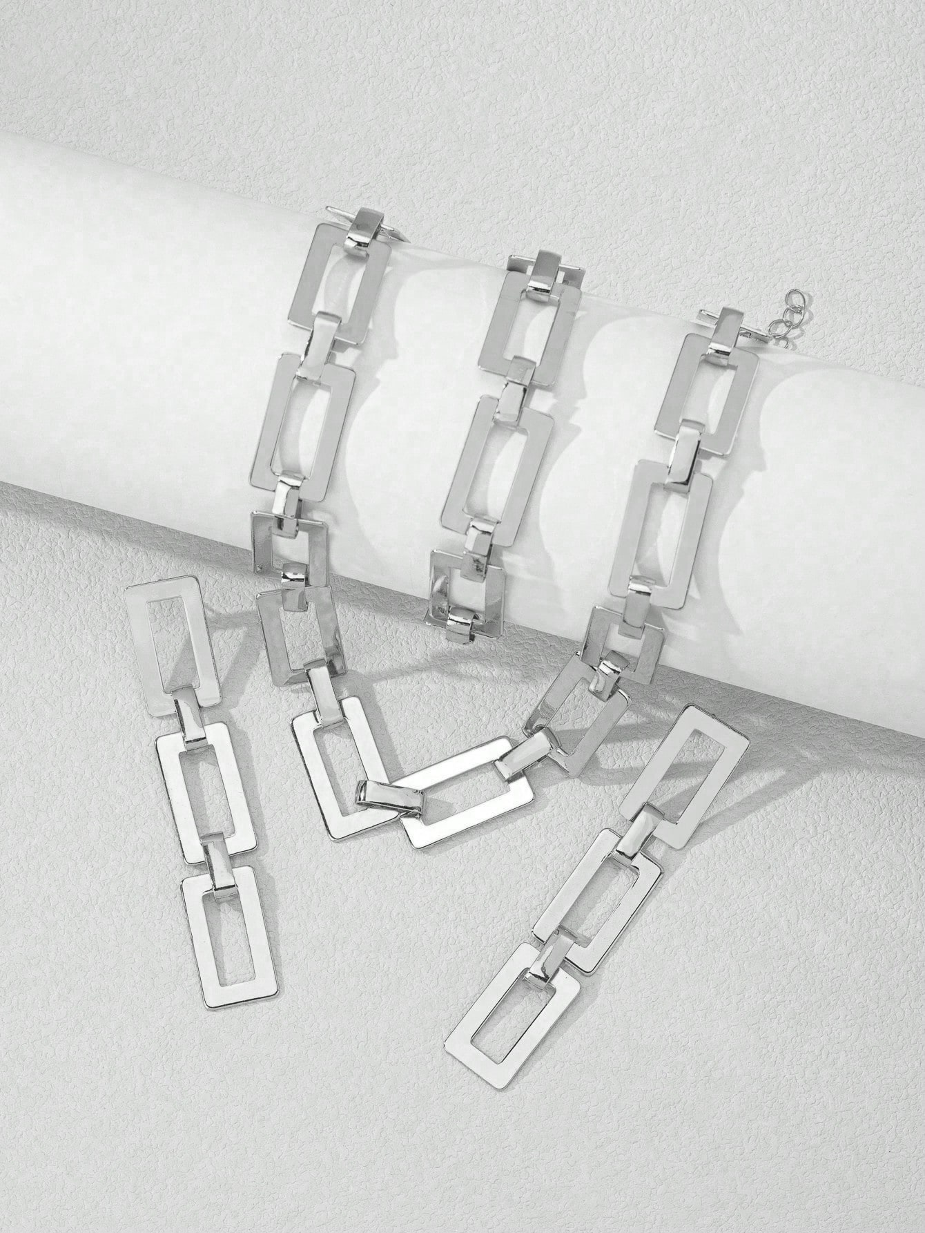 1set Exaggerated Geometric Rectangle Chain Necklace, Earrings And Bracelet Set For Women, Suitable For Vacation And Daily Wear In Europe And America