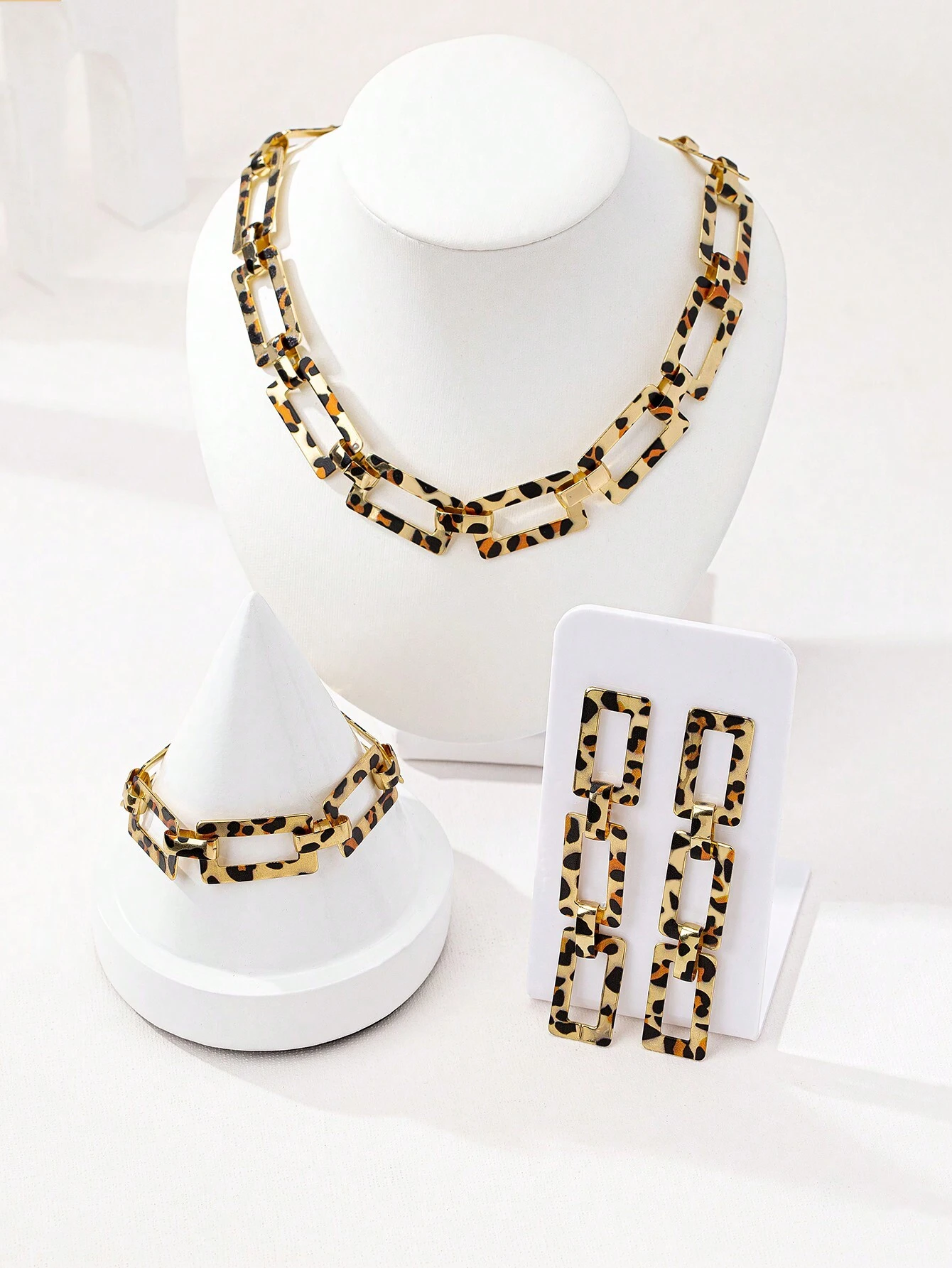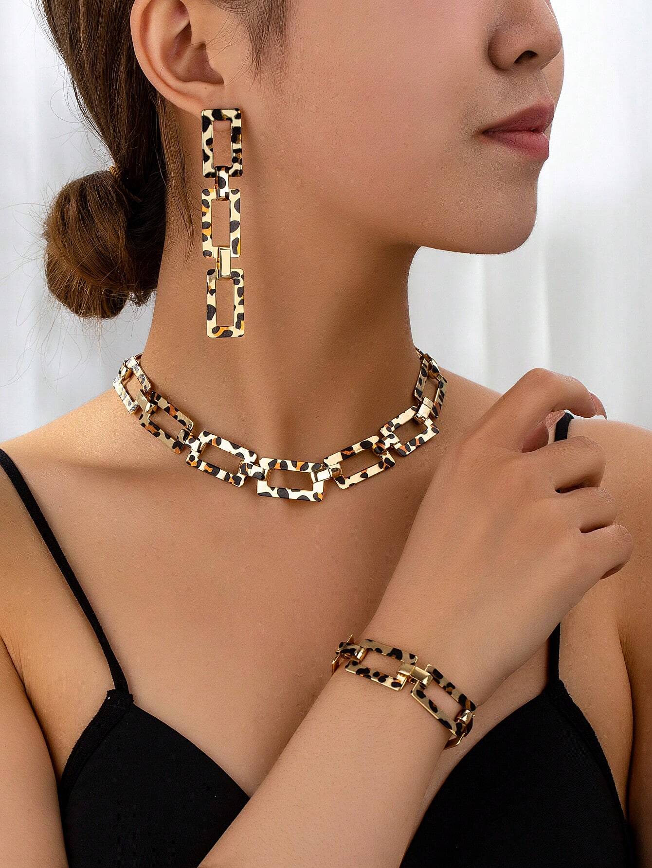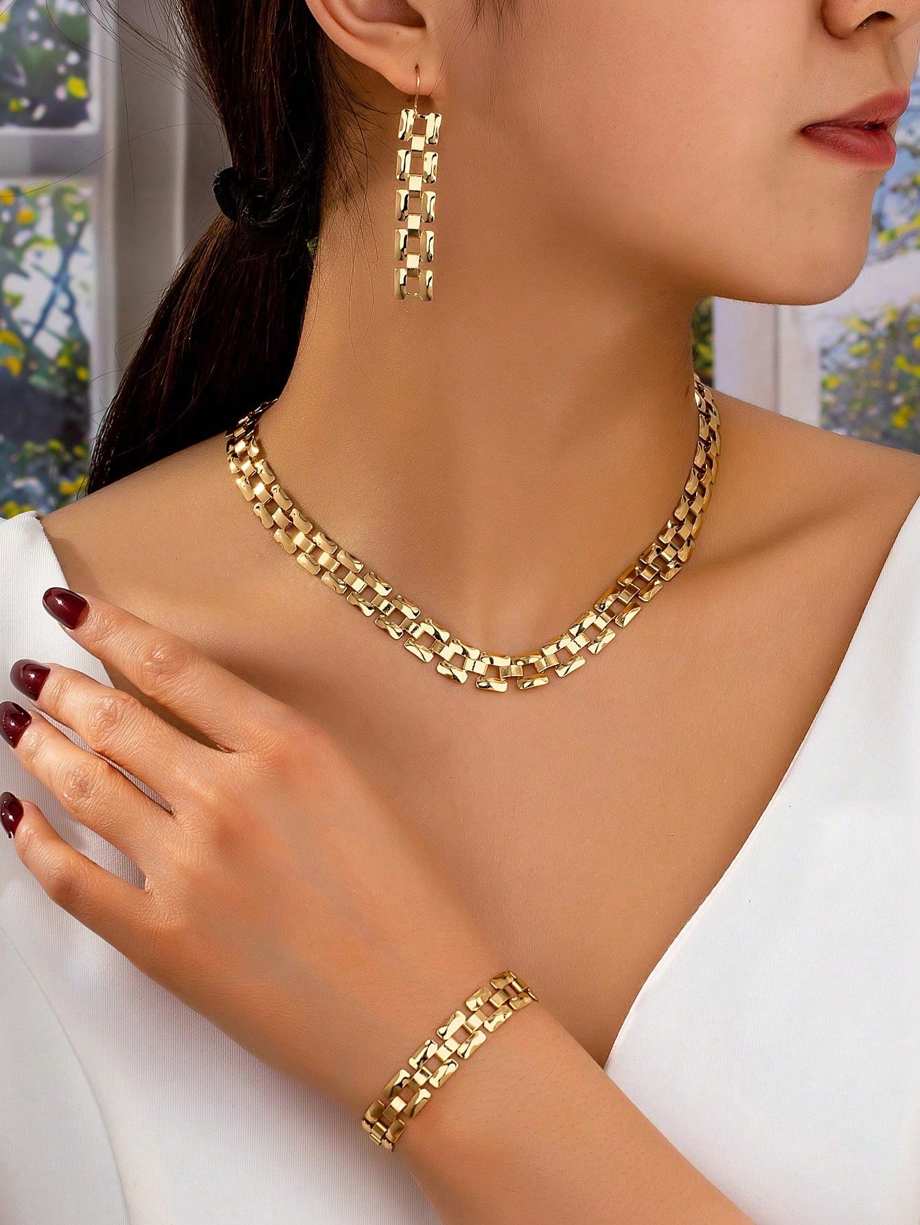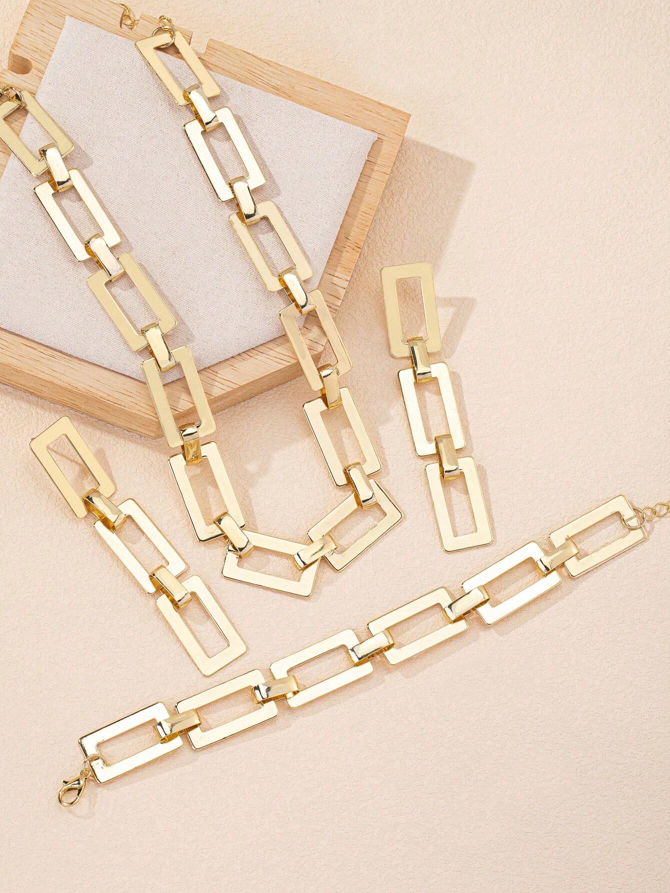 1set Exaggerated Geometric Rectangle Chain Necklace, Earrings And Bracelet Set For Women, Suitable For Vacation And Daily Wear In Europe And America