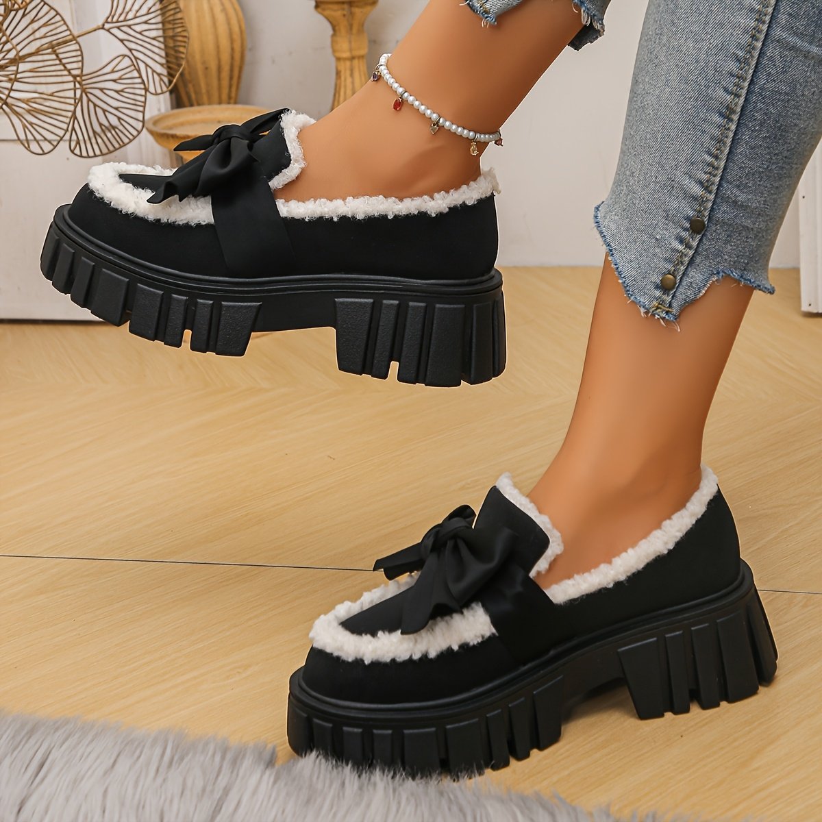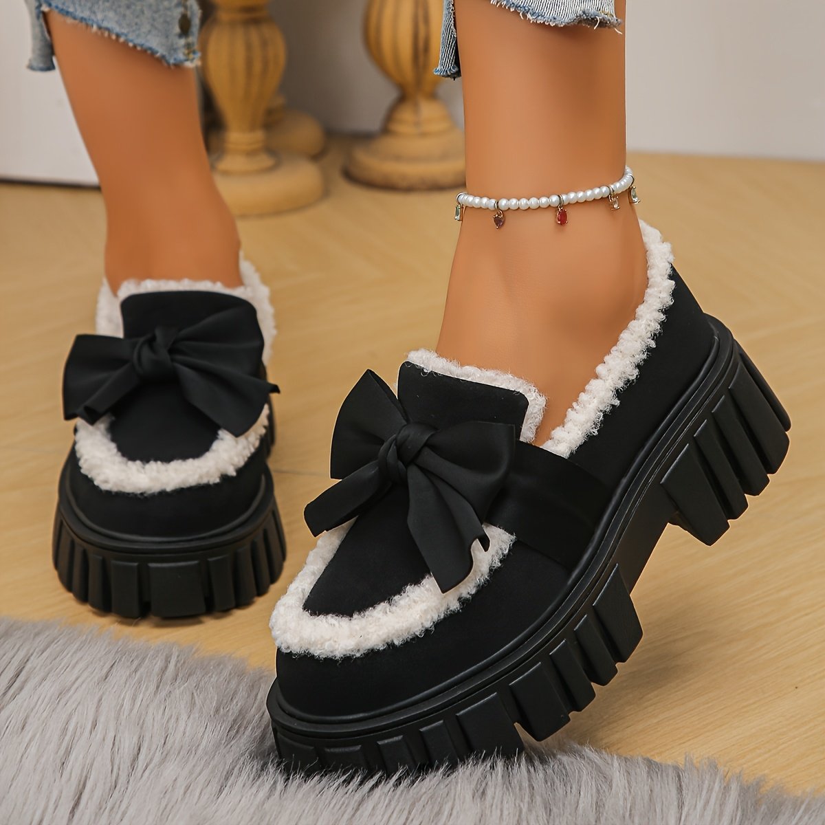2025 Autumn Winter Newest Round Toe Thick Sole Chunky Heel Slip-On Bow Women'S Fleece-Lined Thickened Warm and Cold-Resistant Loafers, Classic Versatile Casual Fashionable Elegant Outdoor Home Style Single Shoes, Women Chunky Slip On Shoe, Chunky Women, C