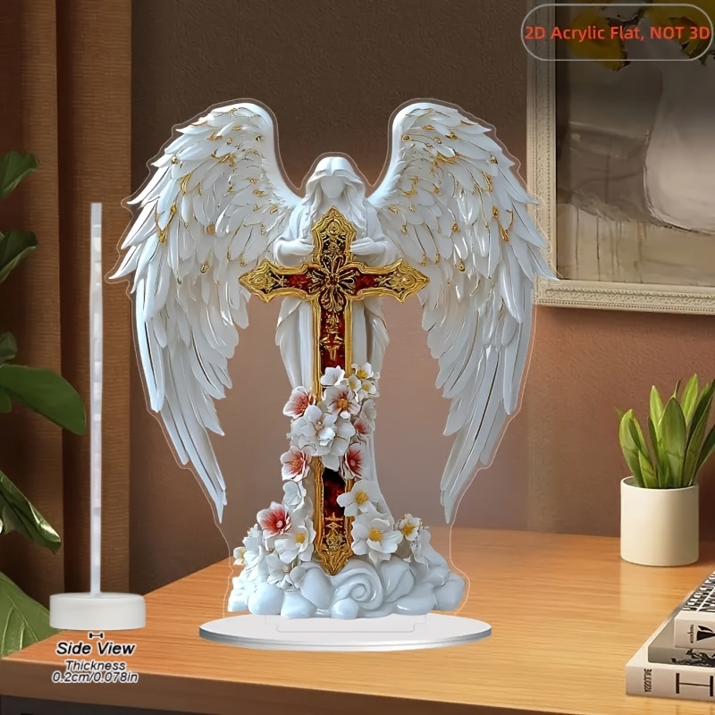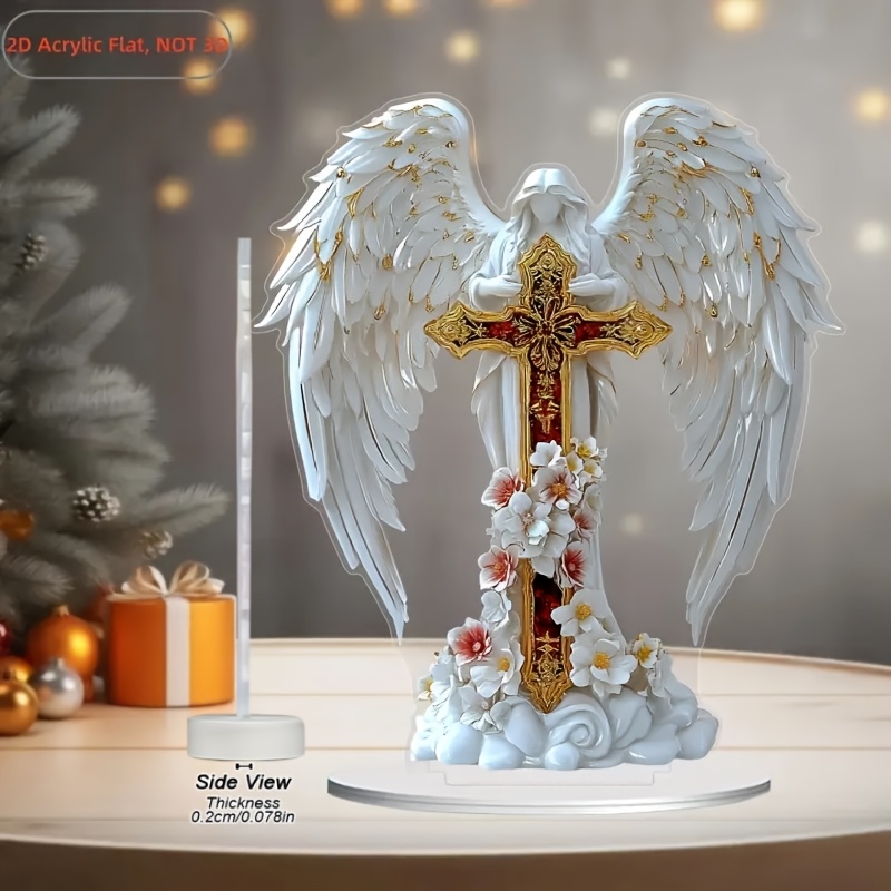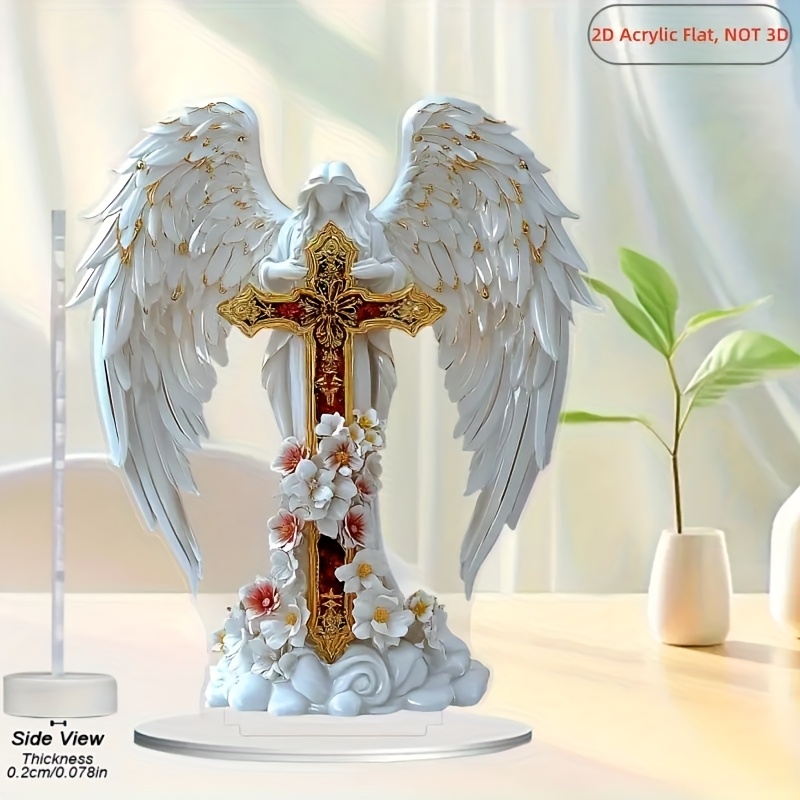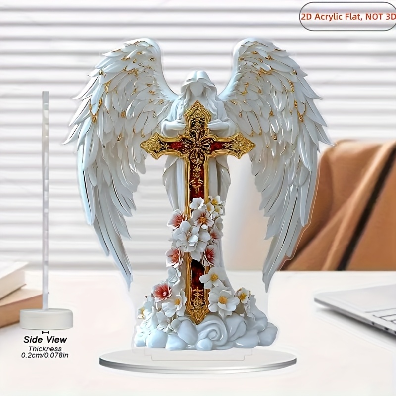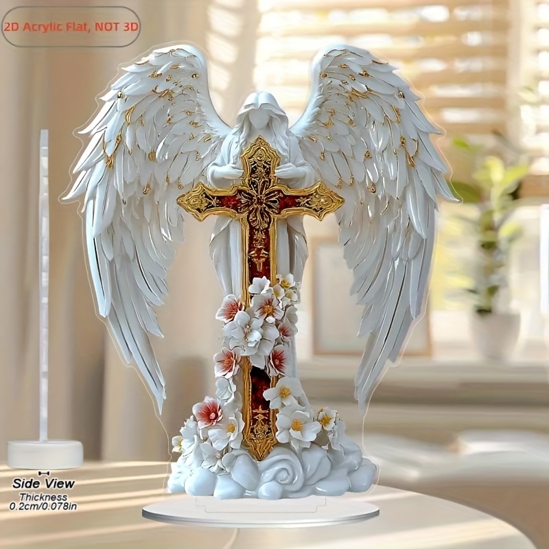 2D Flat, 2D Flat Acrylic Angel and Cross Centerpiece with Floral Decorations – Perfect for Parties, Weddings, and Special Events, Easter and Christian Celebration Gift, Religious Table Display, 2D Flat