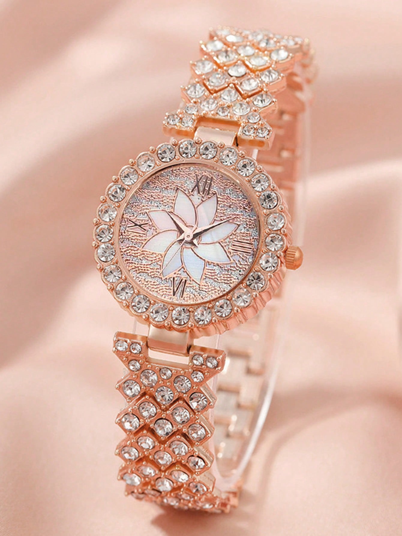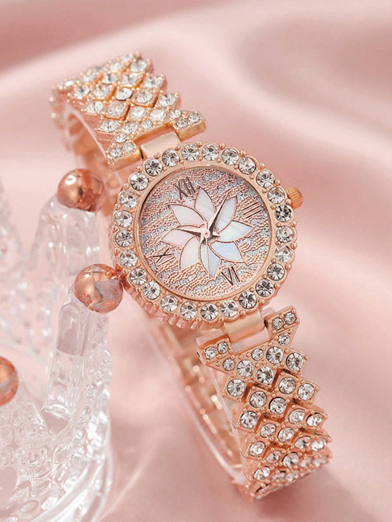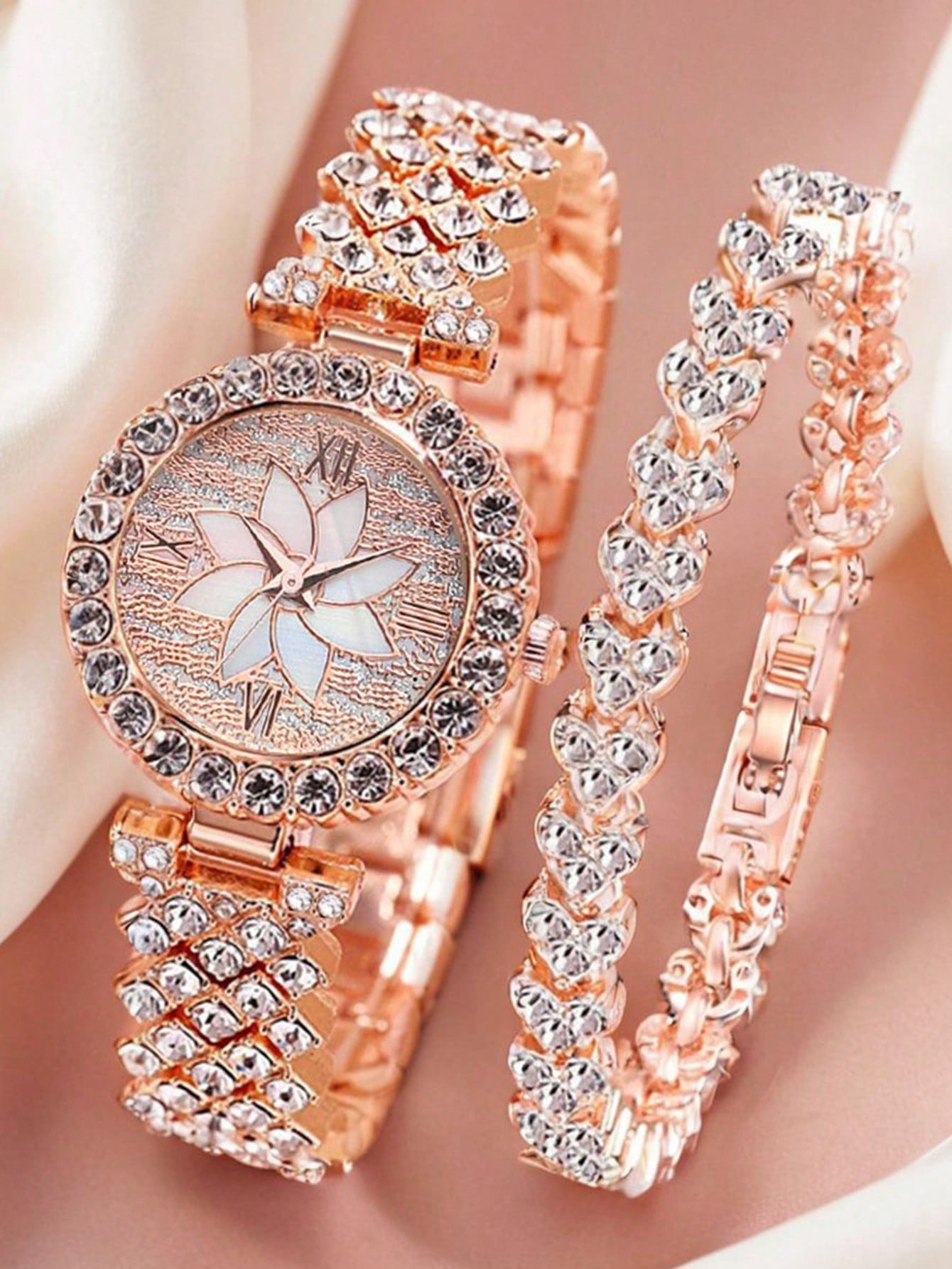2pcs Fashion Luxury Full Diamond Starry Sky Elegant Women's Watch, Round Windmill Face Quartz Watch, Paired With Love Set Diamond Bracelet Jewelry Set, Suitable For Festivals, Parties, Weddings, And Daily Wear, A Valentine's Day And Easter Gift For Moms.