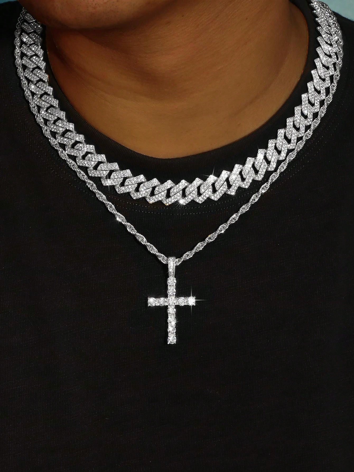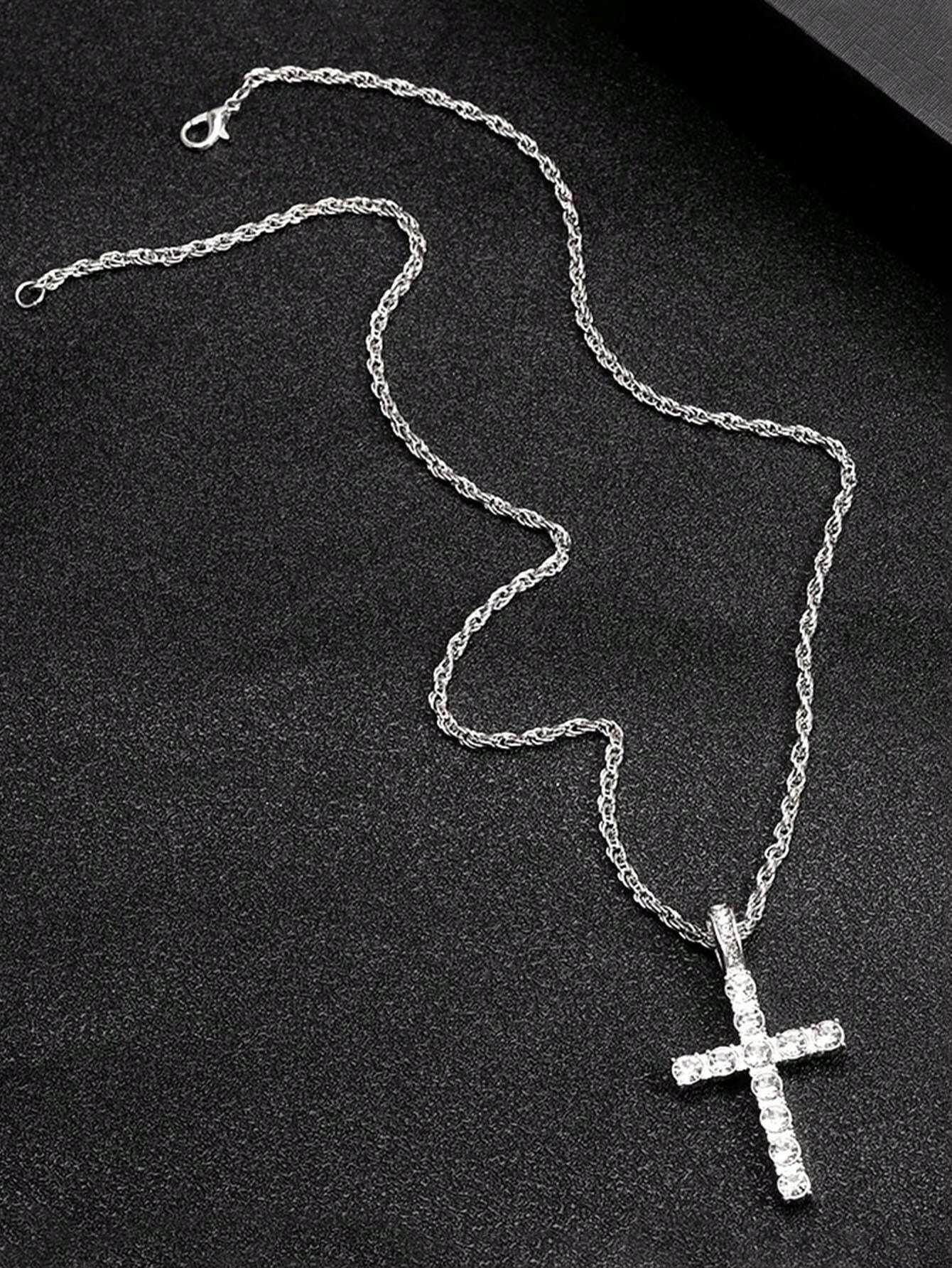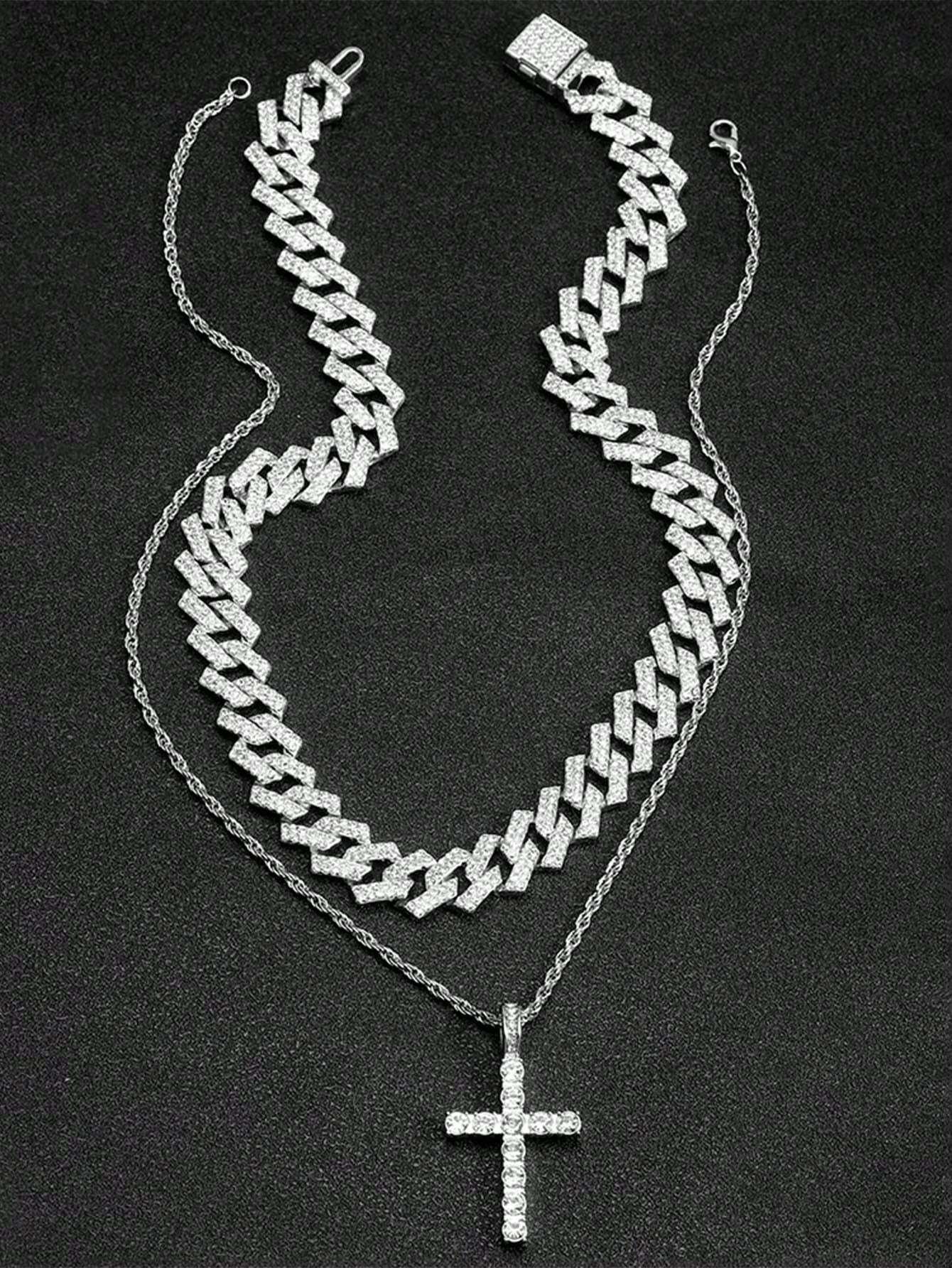 2PCS Necklace Paired With Vintage Cross Pendant Necklace Made Of Rhinestone Material Fashionable Vintage Set Birthday Gift For Men