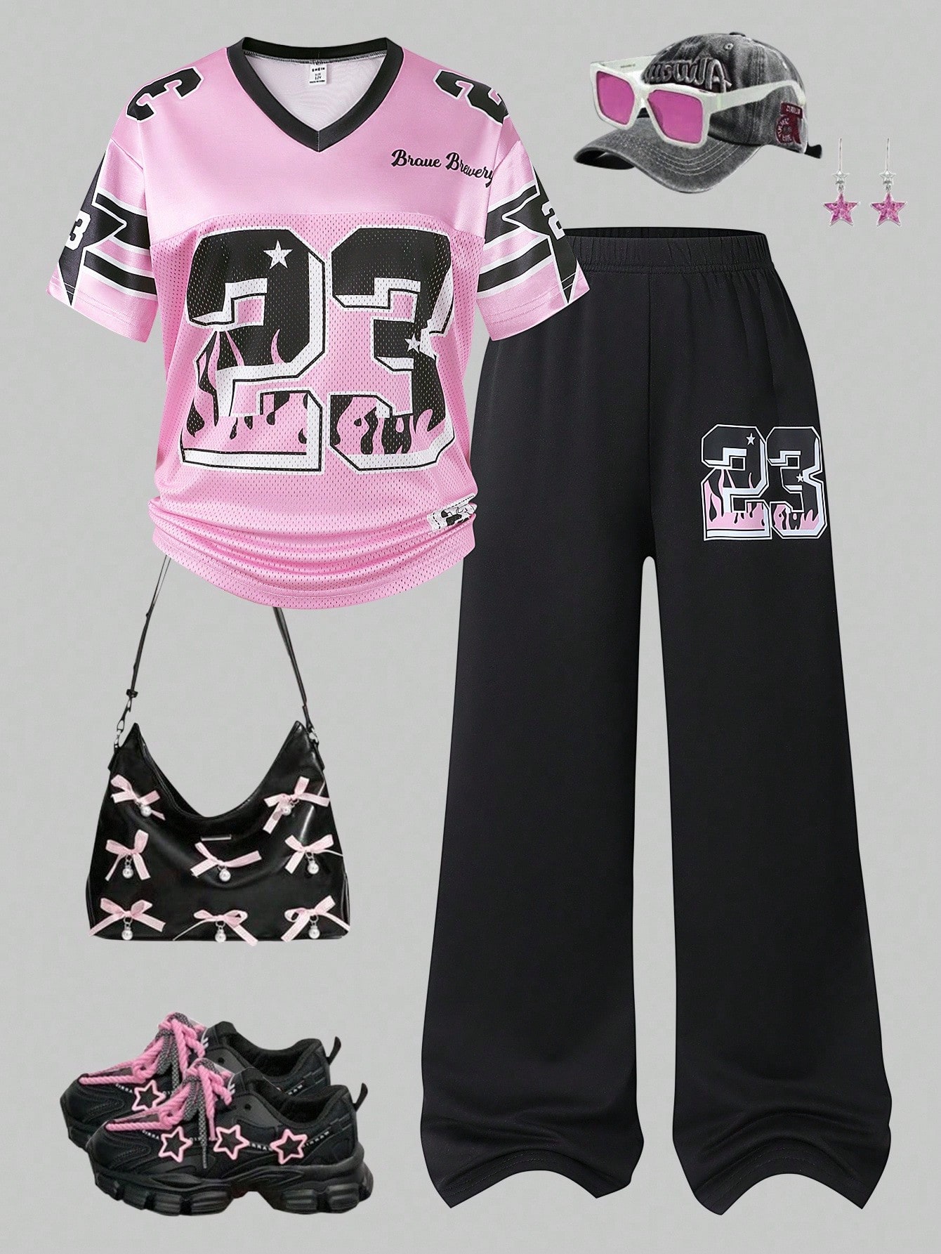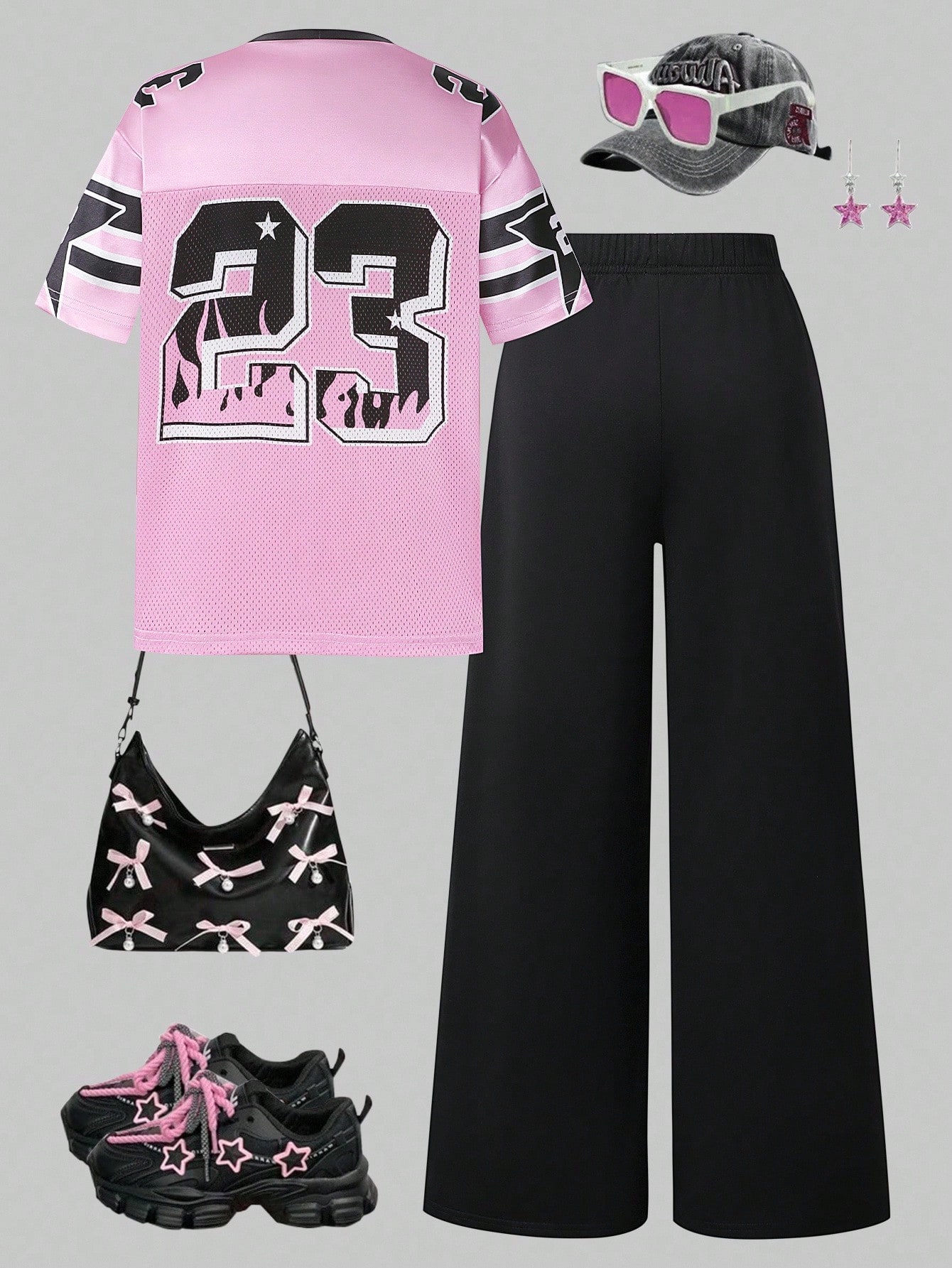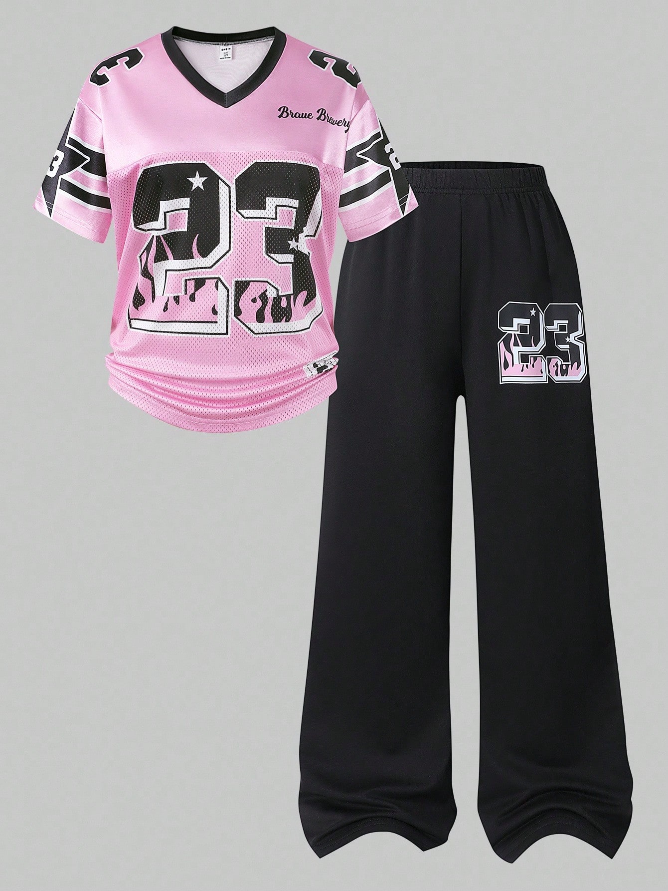 2pcs/Set Tween Girl Fashion Loose V-Neck Short Sleeve Mesh Gloss T-Shirt With 5-Pointed Star & Stripe Pattern And Wide Leg Knit Pants Sports Suit, Casual Wear