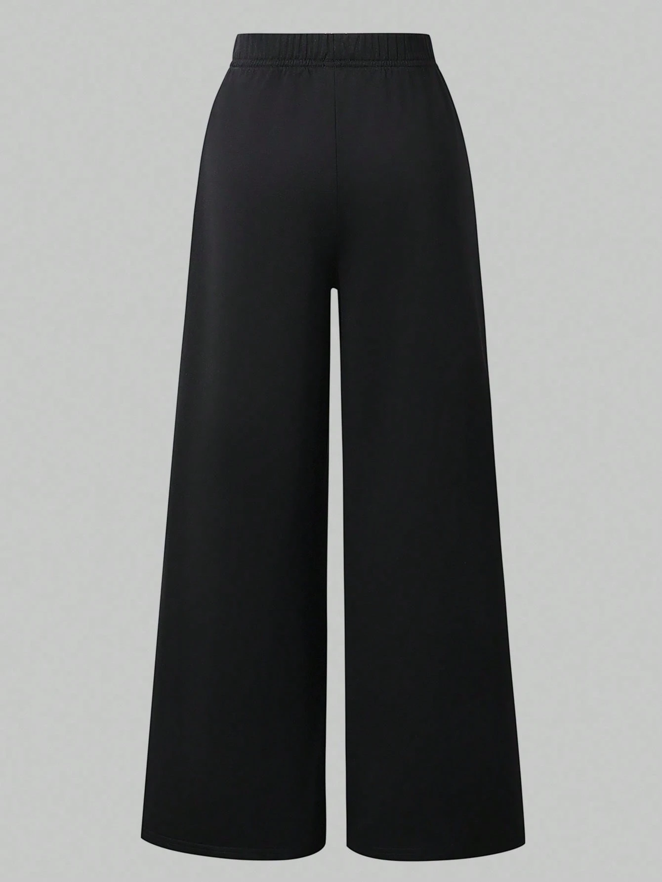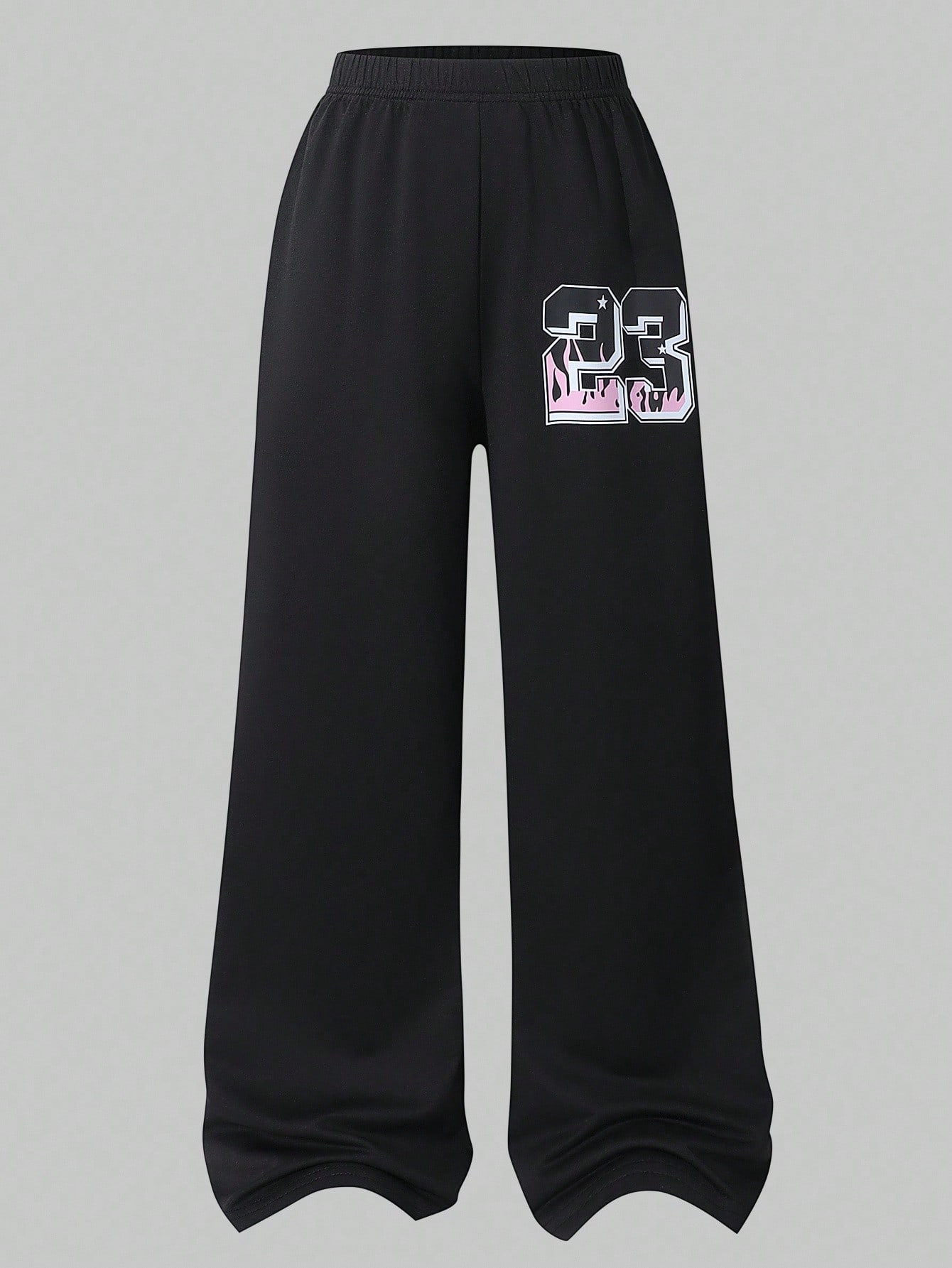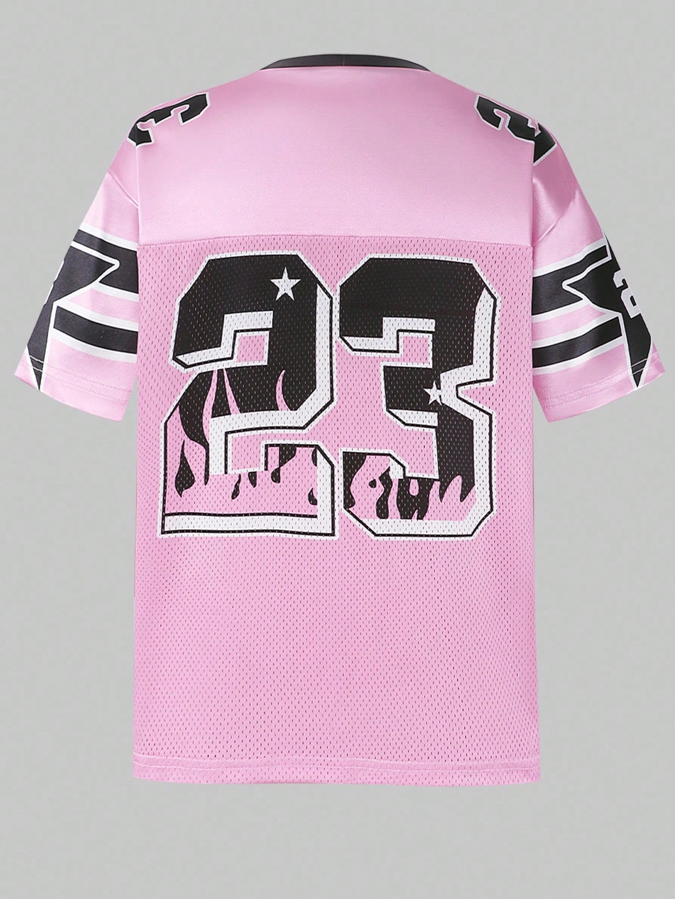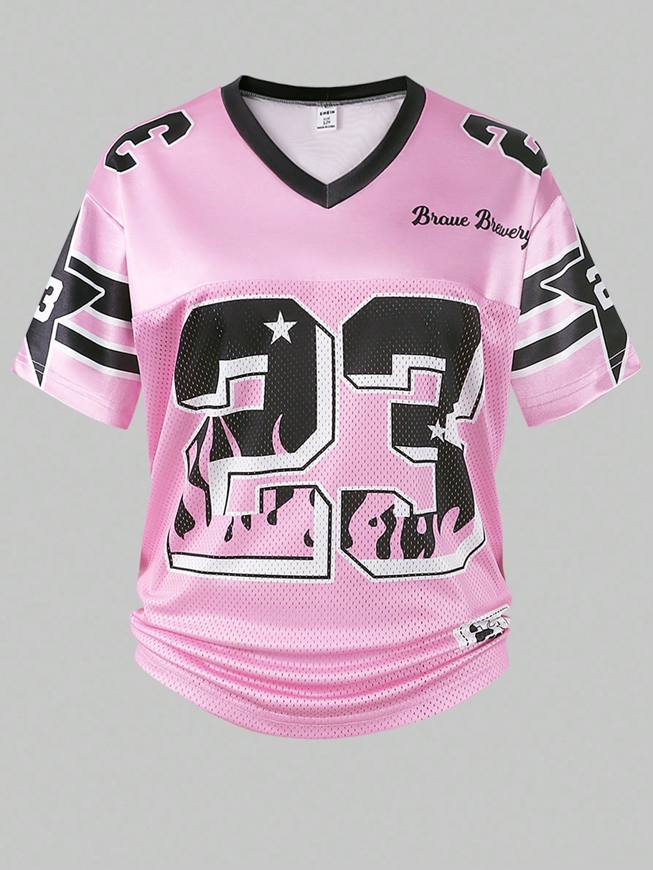 2pcs/Set Tween Girl Fashion Loose V-Neck Short Sleeve Mesh Gloss T-Shirt With 5-Pointed Star & Stripe Pattern And Wide Leg Knit Pants Sports Suit, Casual Wear