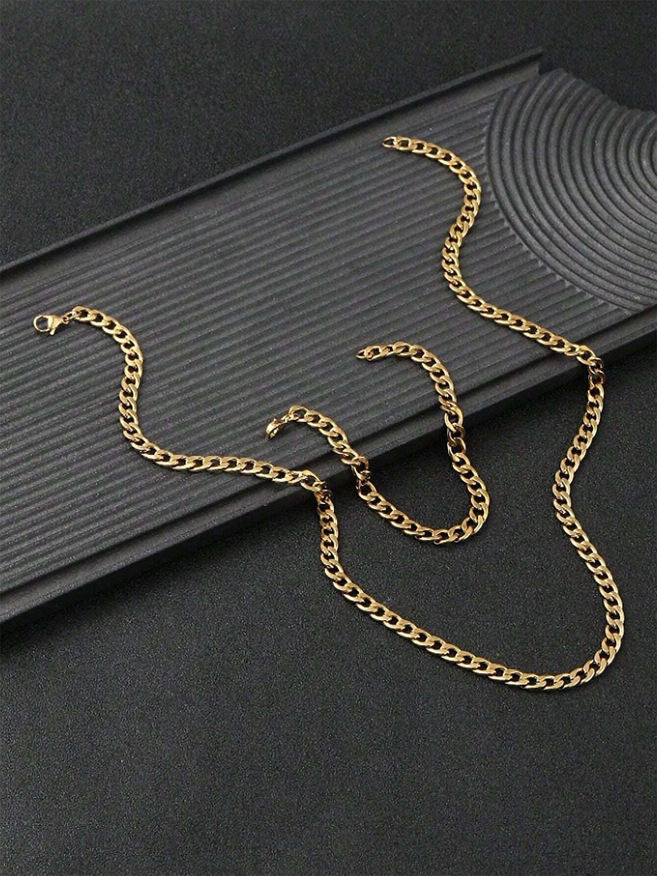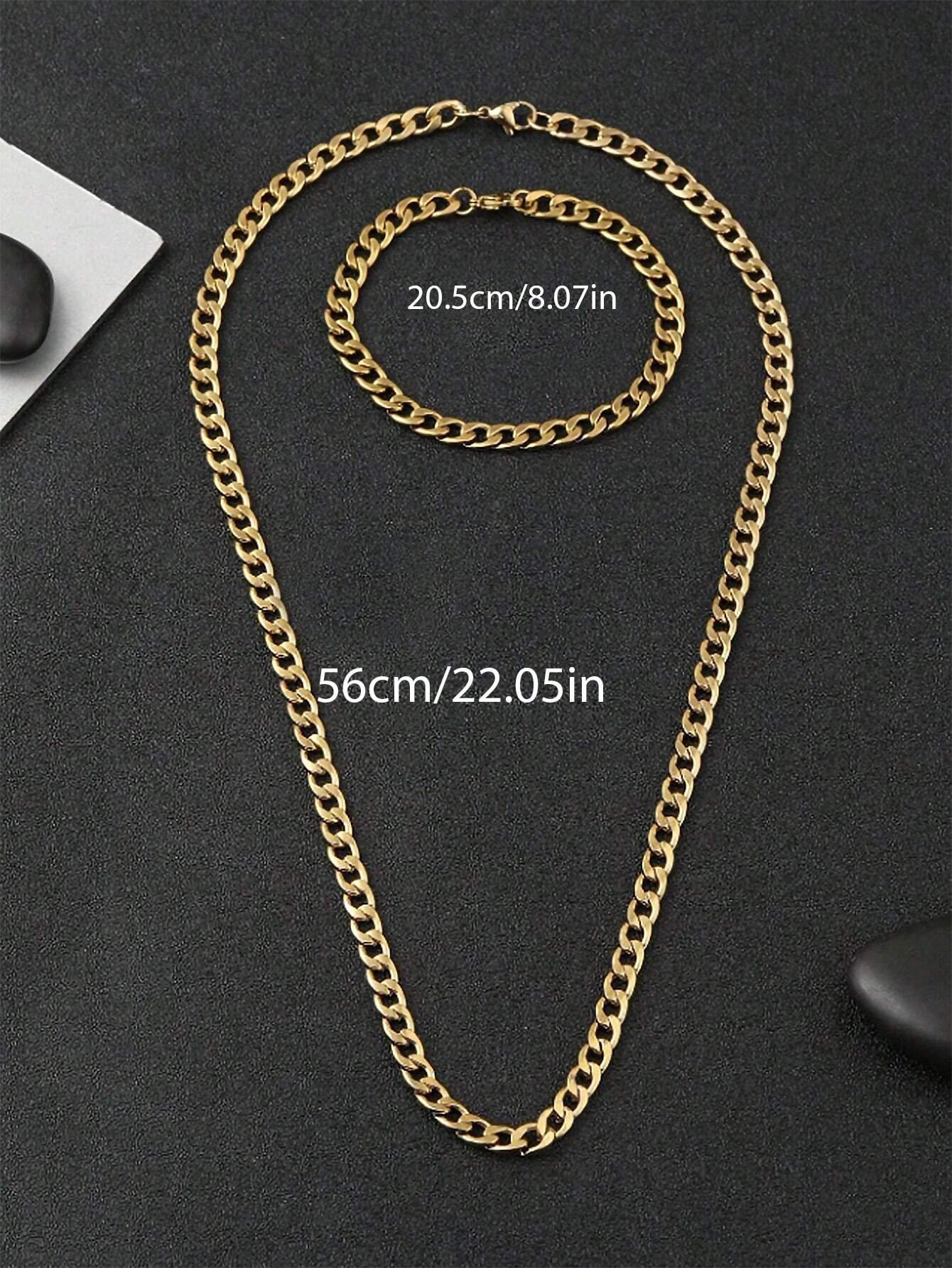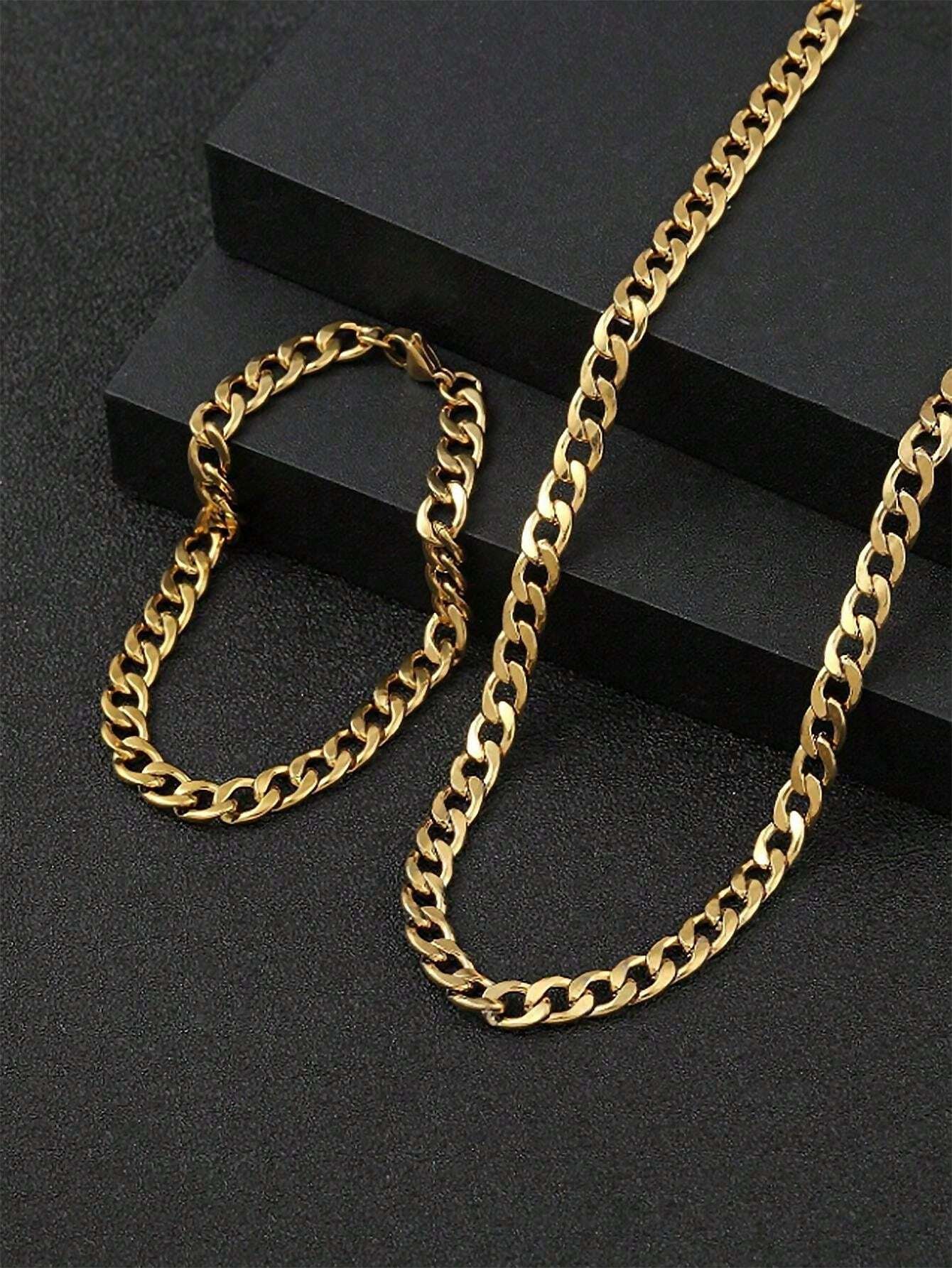 2pcs Stainless Steel Gold-Tone Thick Chain Hexagonal Polished Necklace & Bracelet Set, Fashionable Minimalist Design For Men Daily Wear & Gift