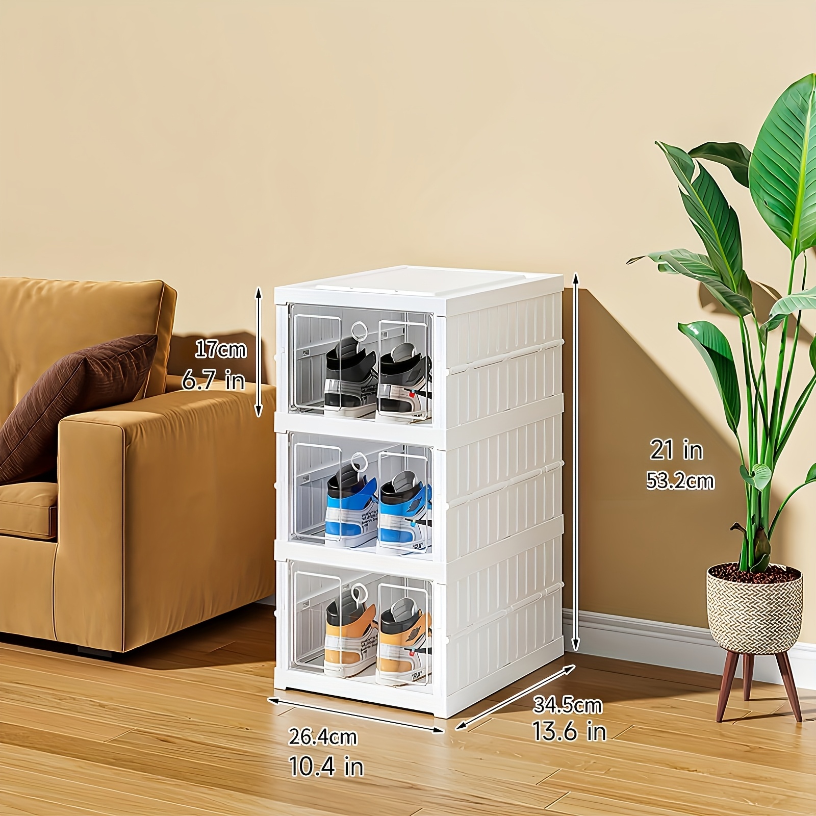 3/6/9 Tier Foldable Shoe Rack Organizer, Clear Plastic Collapsible Shelf with Storage Boxes, Freestanding Design for Closet & Living Room, White, Closet Organizer | Spacesaving Rack | Stackable Shoe Box, Shoe Storage Organizer