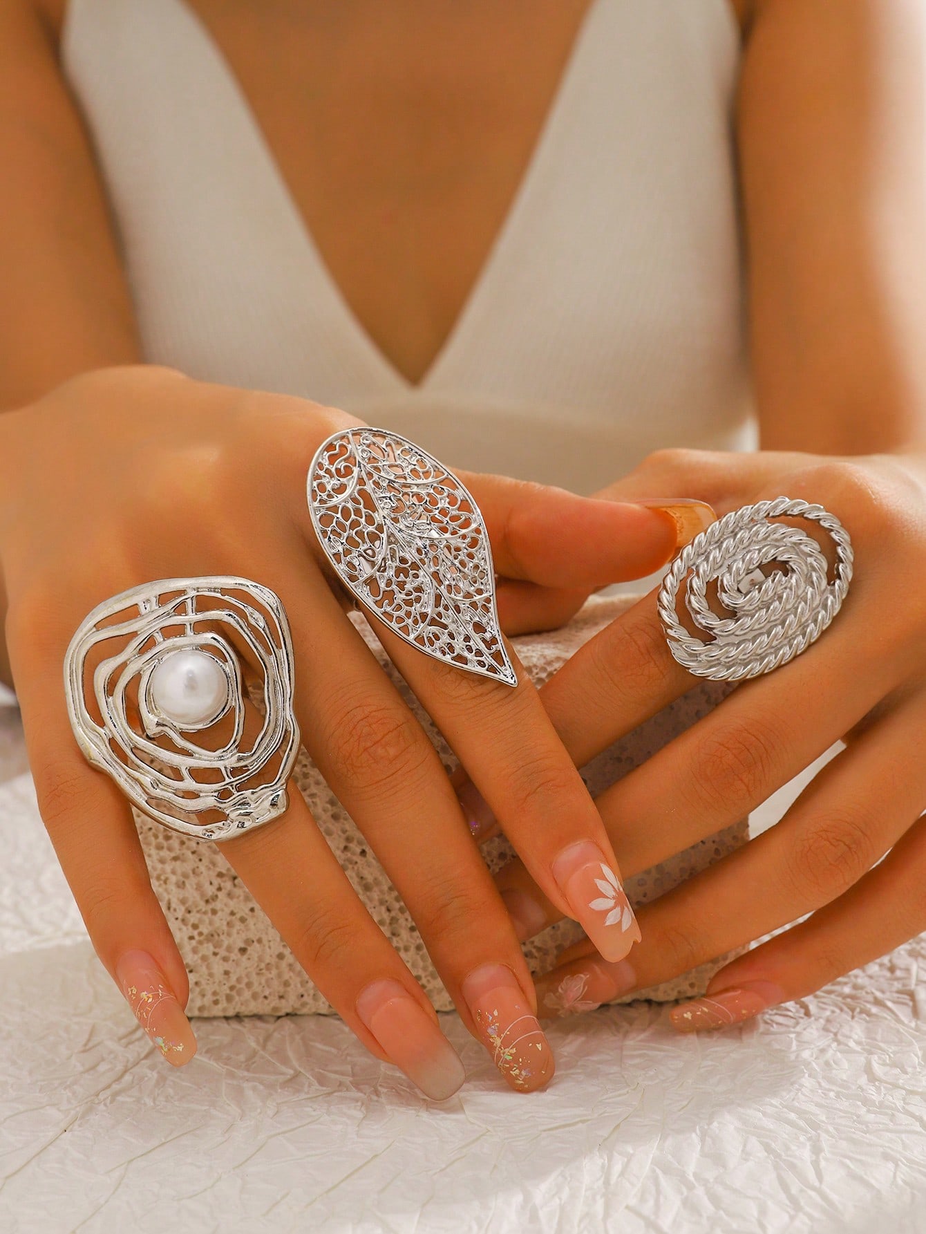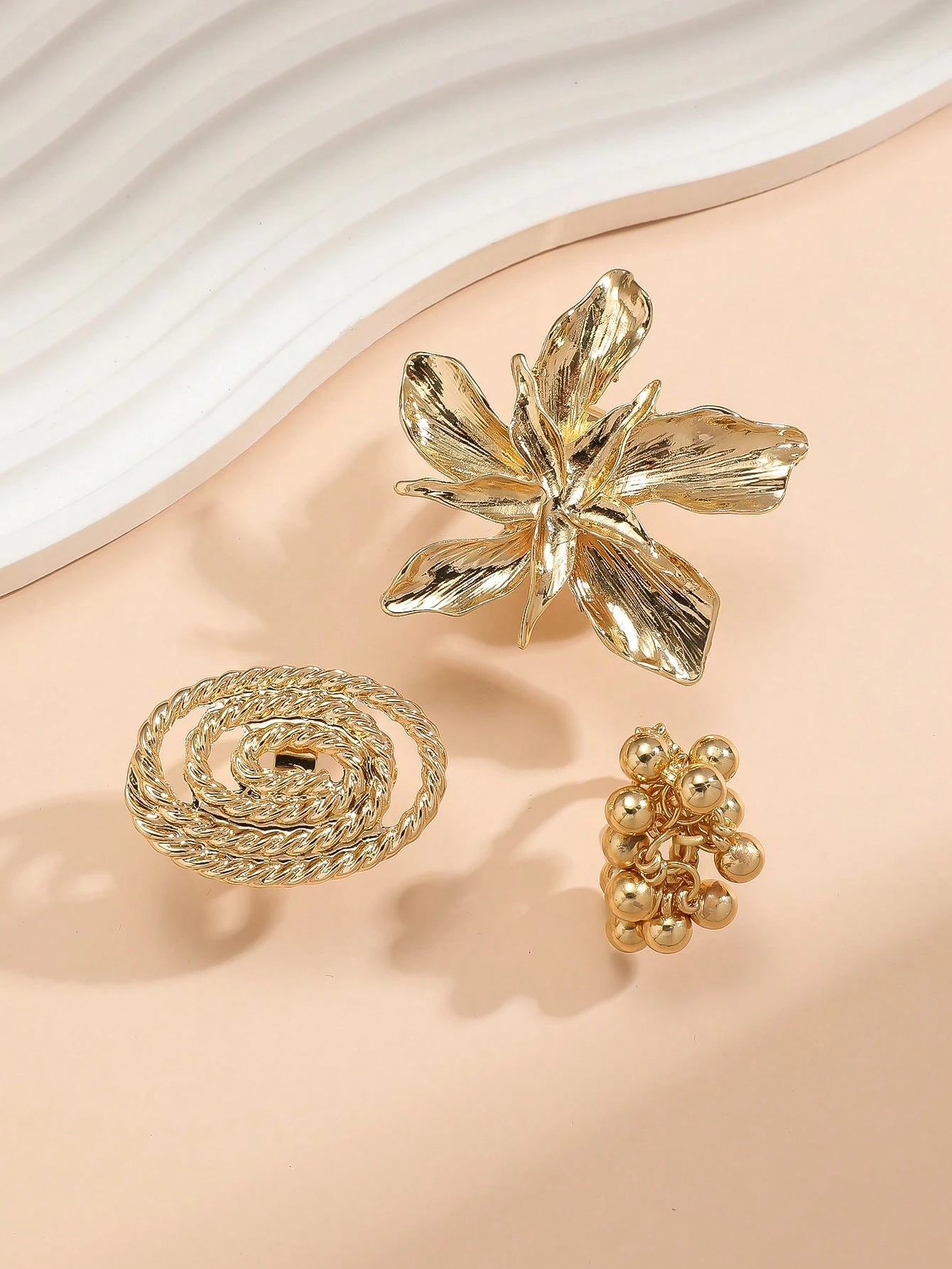 Be the first to review “3pcs Exaggerated Metal Large Floral & Bead Spiral Ring Set, Fashion Patterned Rings” Cancel reply