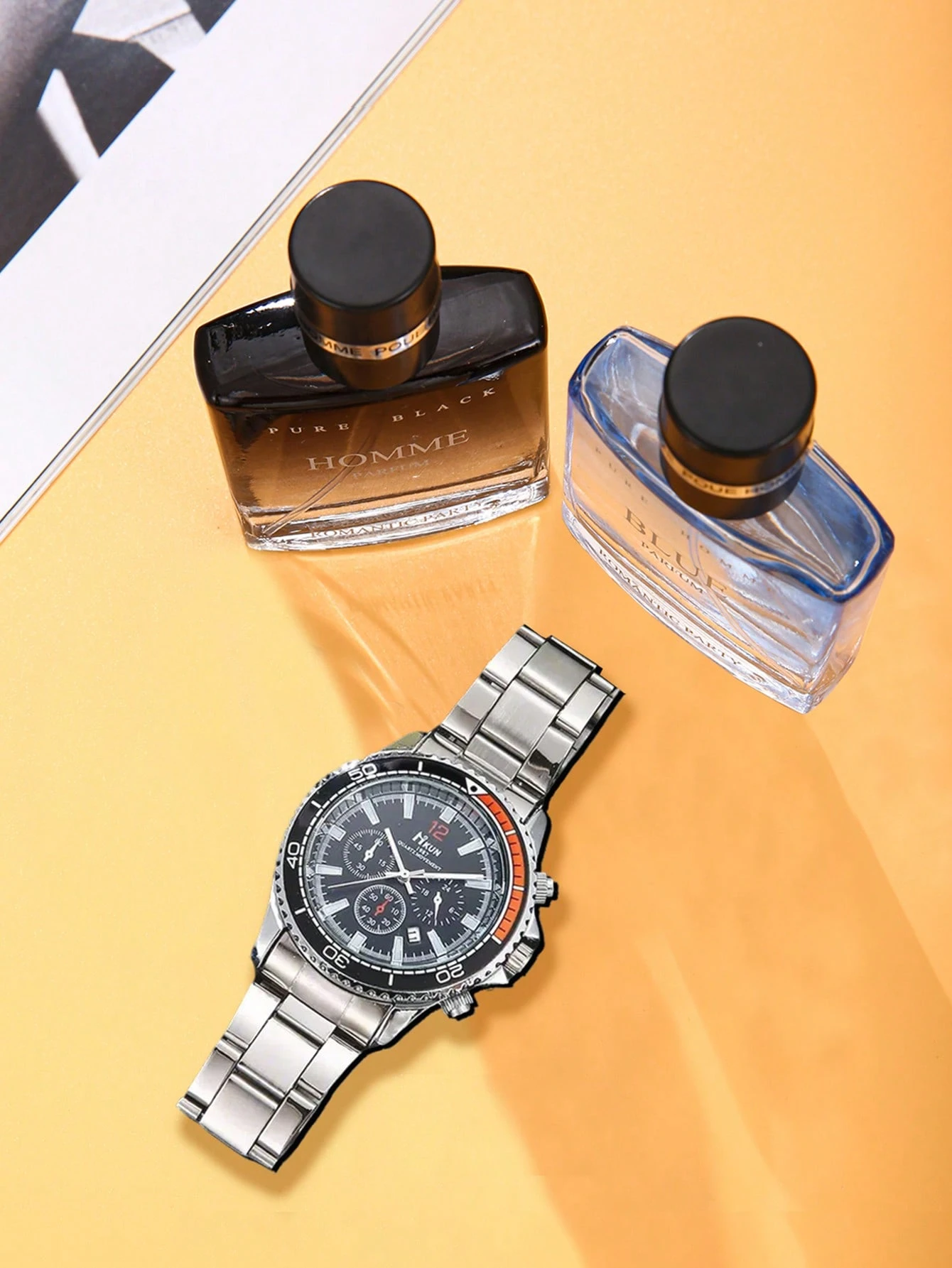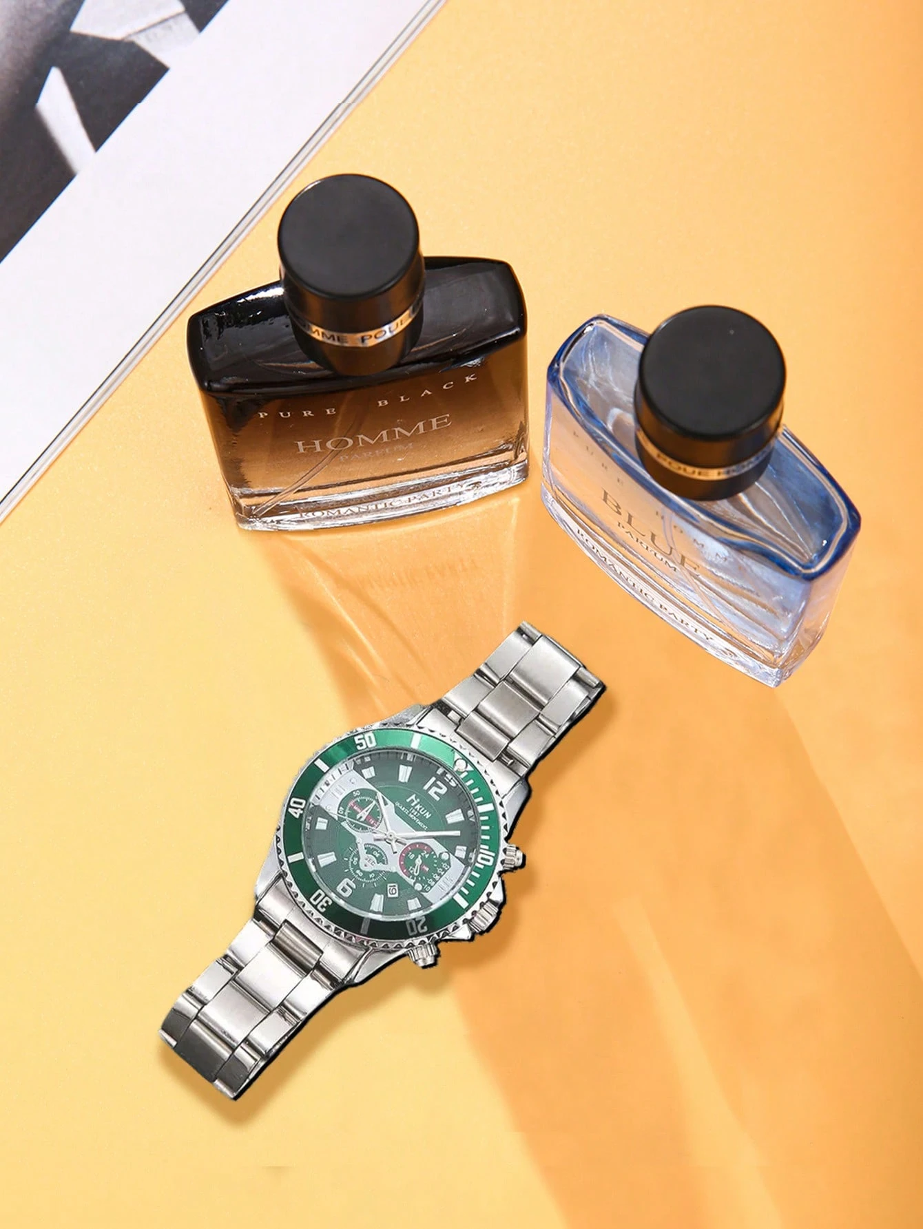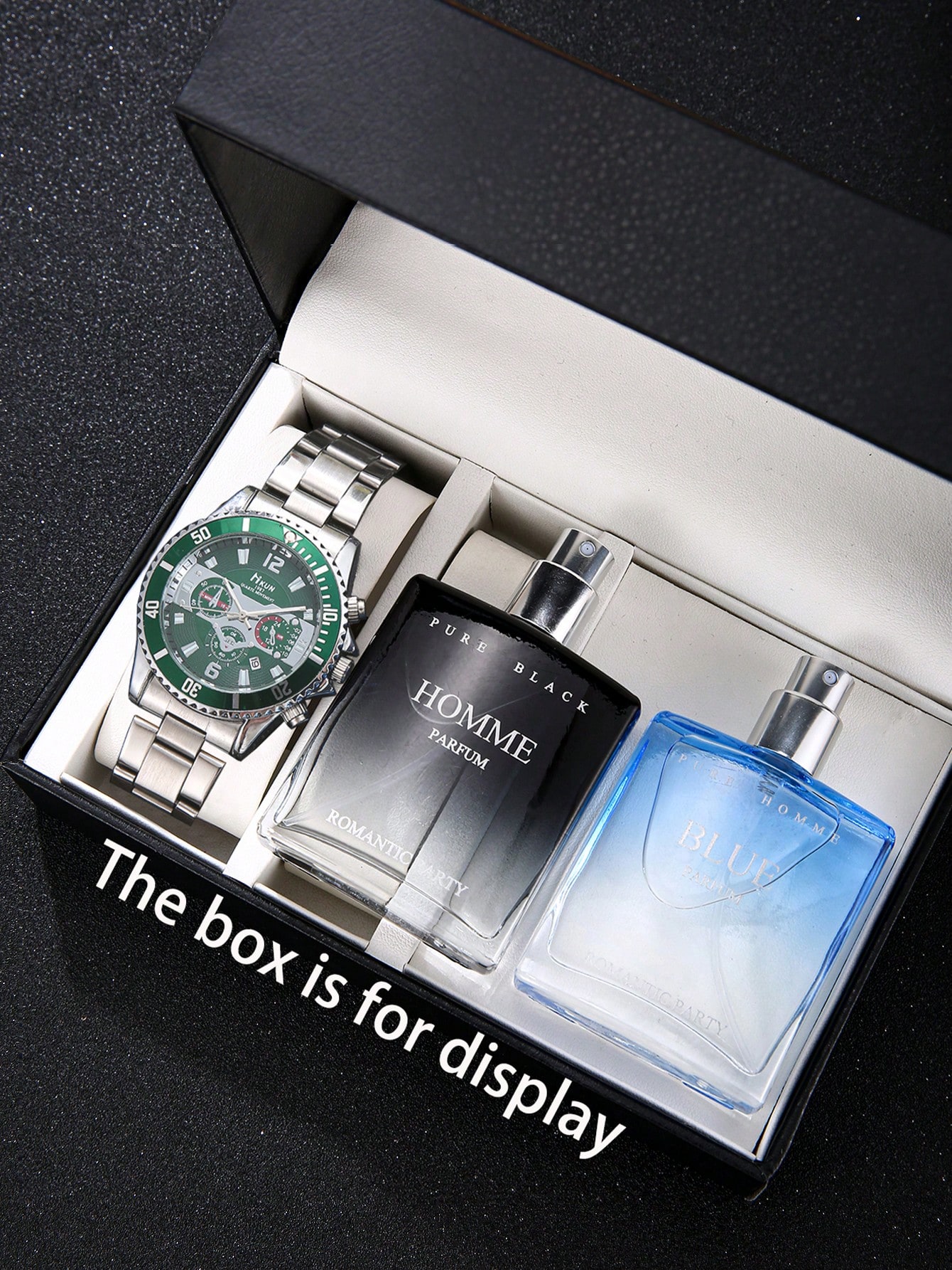 3pcs Men's Watch Set: 1pc Stainless Steel Large Dial Easy-Read Quartz Watch + 2pcs Perfume Set, Perfect Birthday/Father's Day/Valentine's Day Gift For Him