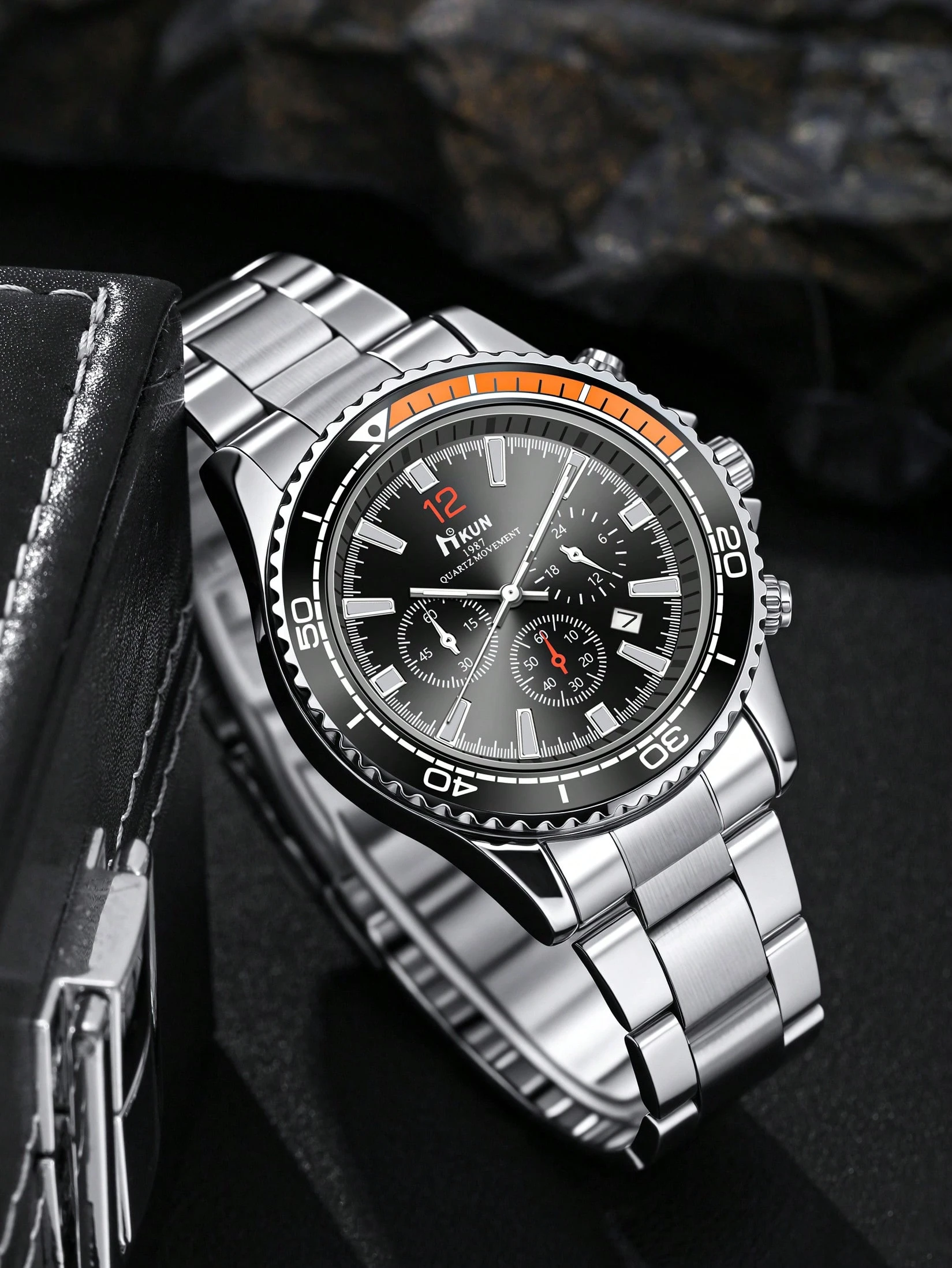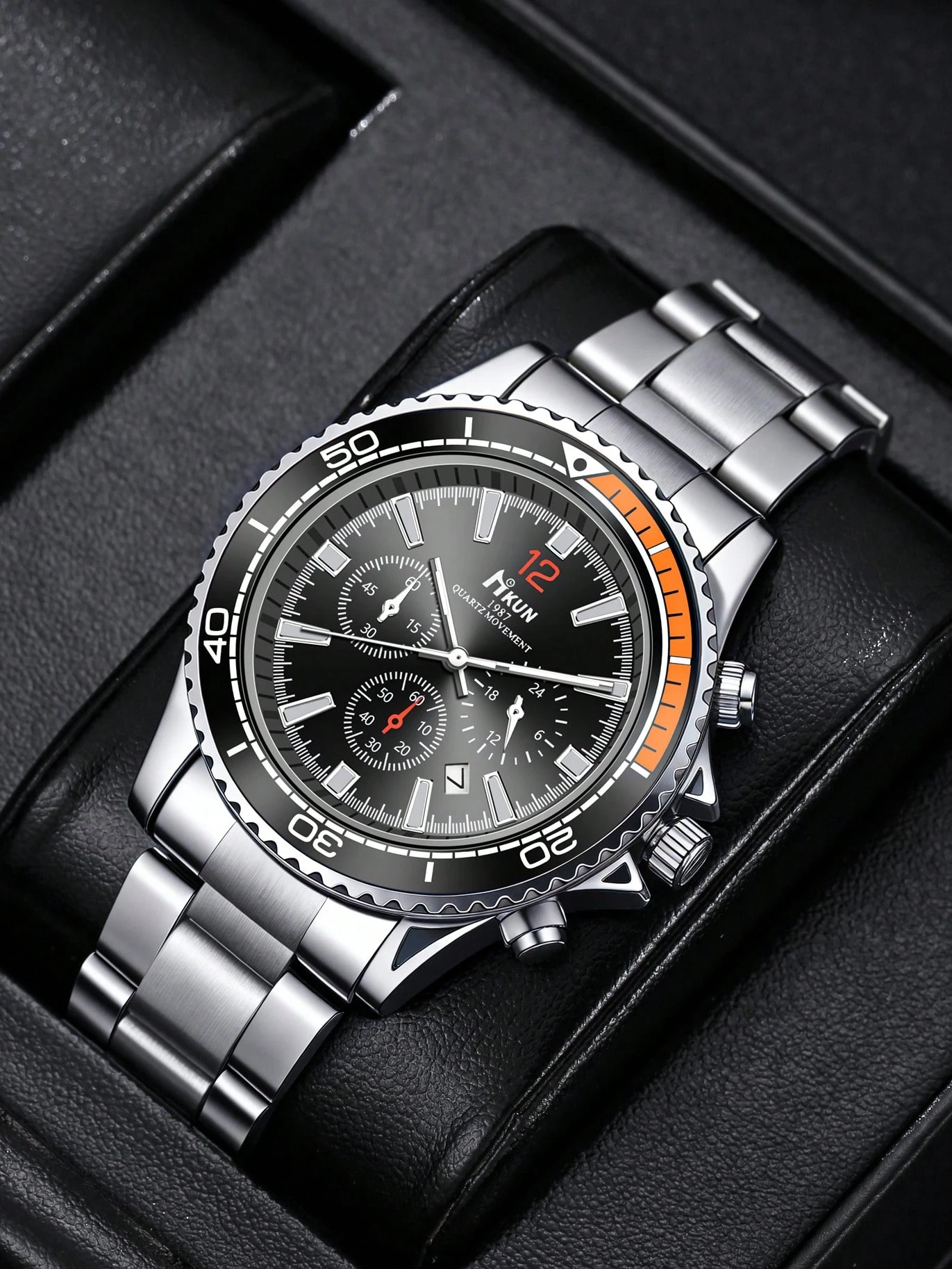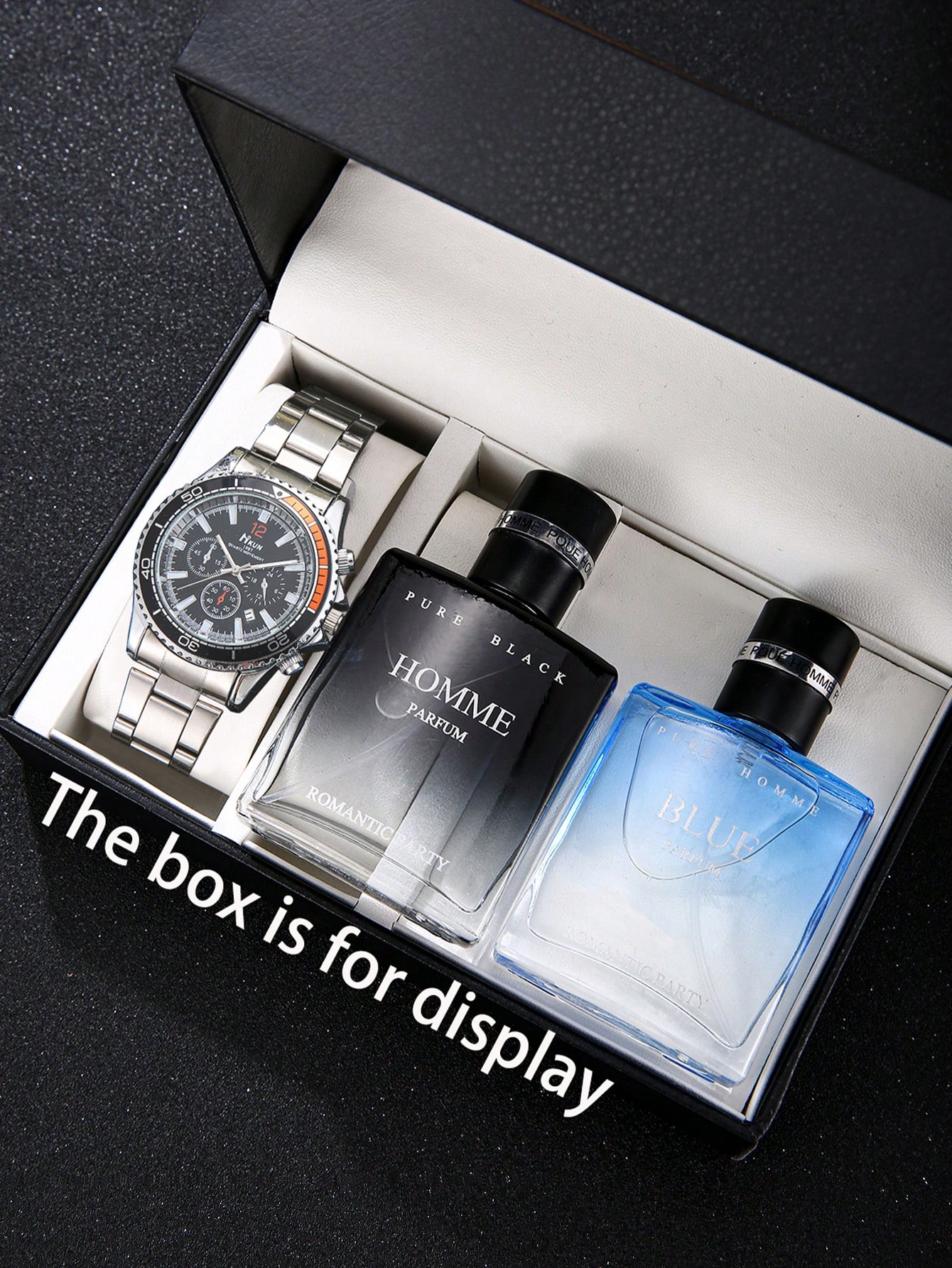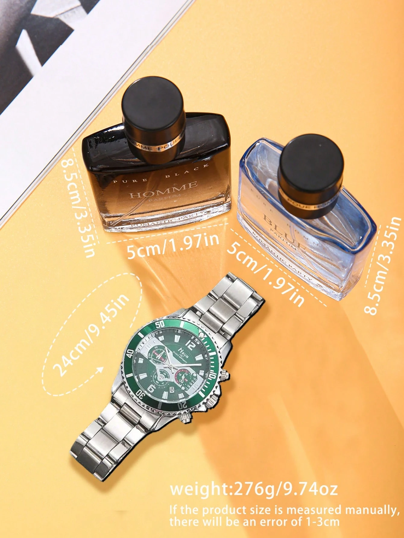 3pcs Men's Watch Set: 1pc Stainless Steel Large Dial Easy-Read Quartz Watch + 2pcs Perfume Set, Perfect Birthday/Father's Day/Valentine's Day Gift For Him