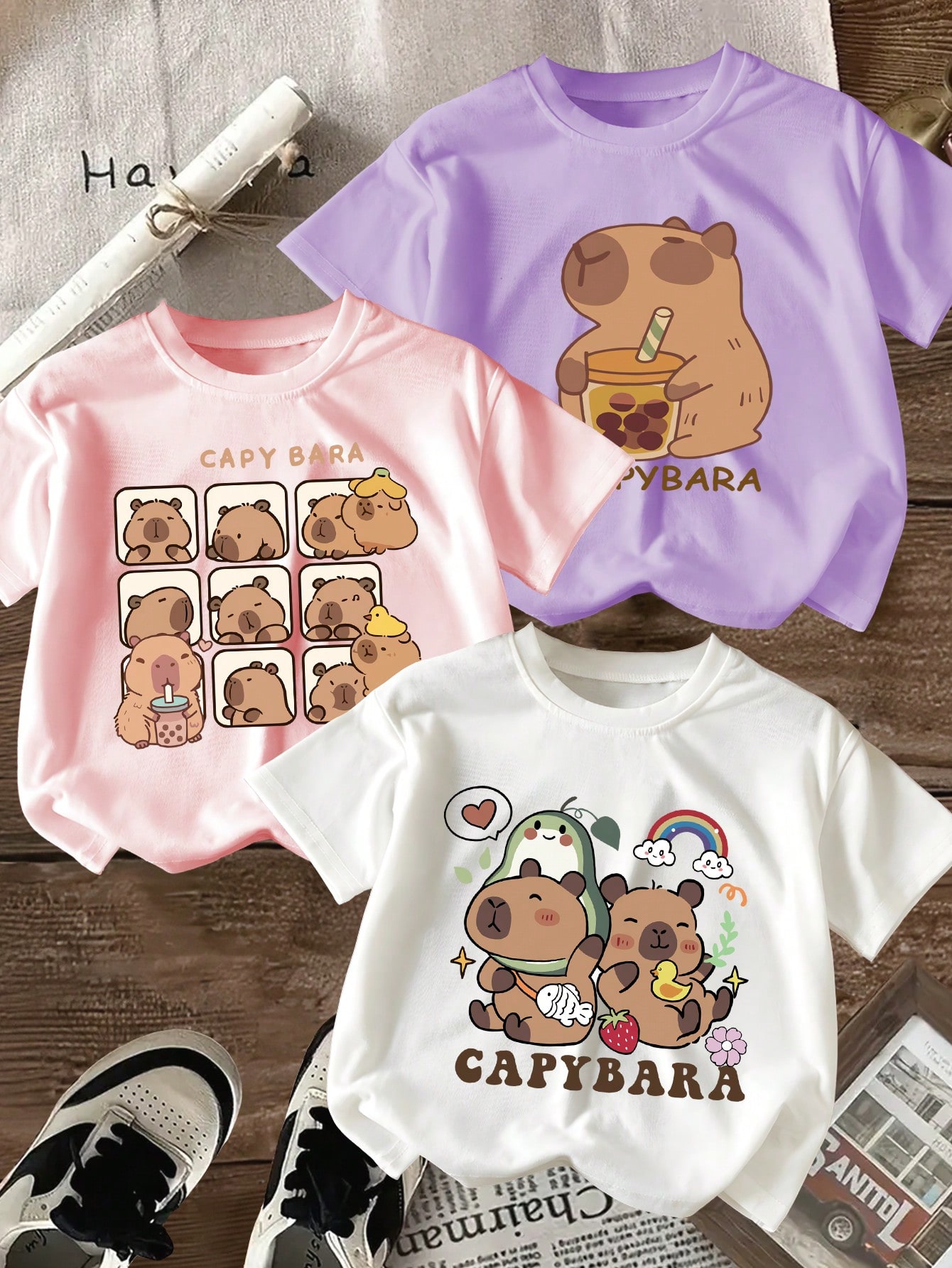 3pcs/Set Cute Girls Capybara Printed Round Neck T-Shirt, Casual Short Sleeve Soft Knit Fabric 3 Pieces Set, Suitable For All Festivals