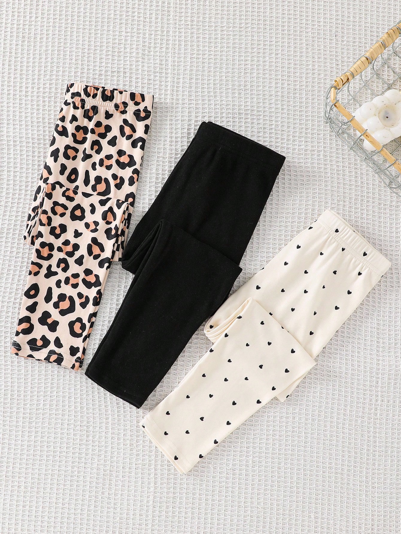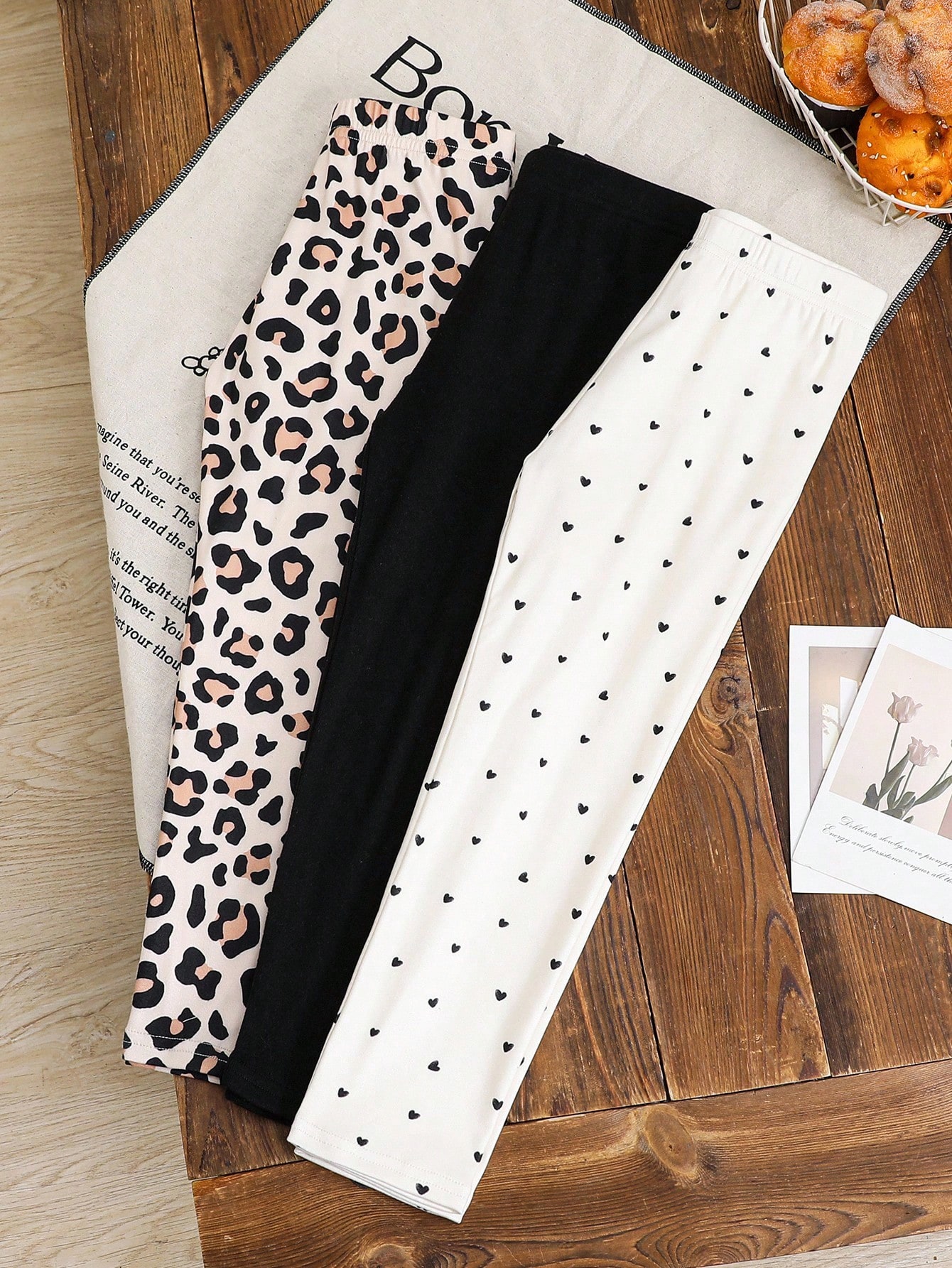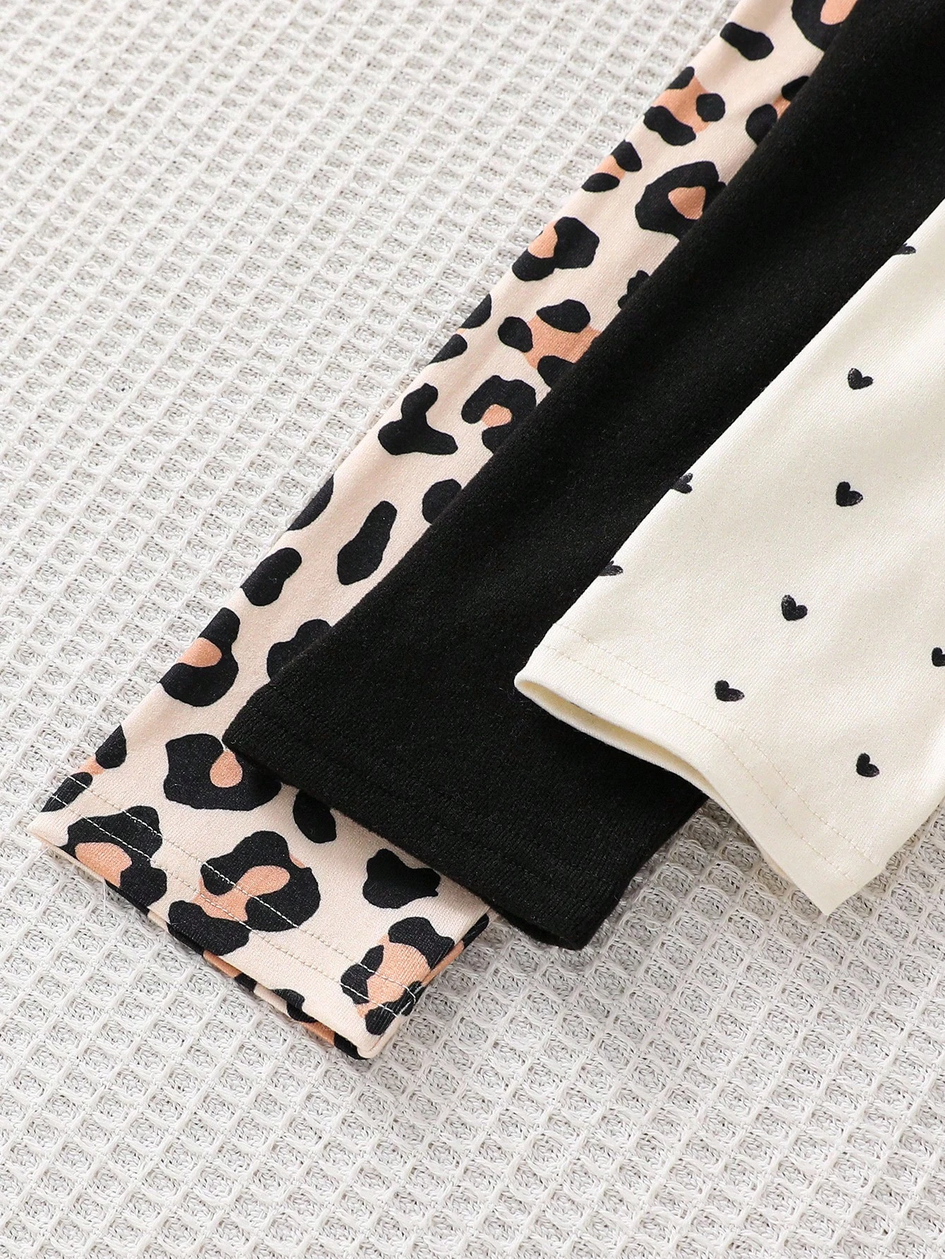 3pcs/Set Young Girl Knitted Heart & Leopard Print Base Layer Leggings Baby Girl Leggings Girls Leggings Winter Leggings For Girls Girls Tights Leopard Print Leggings Winter Leggings Girls Leopard Print Leggings Girls Heart Leggings Girls