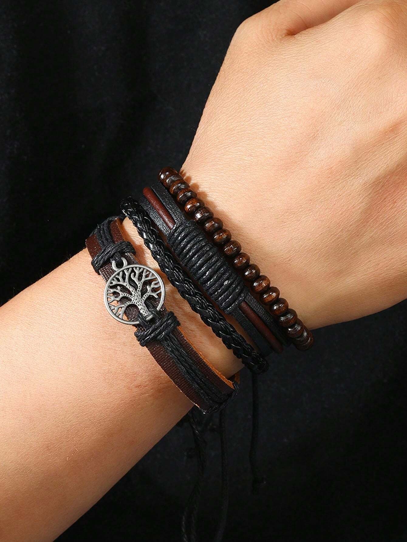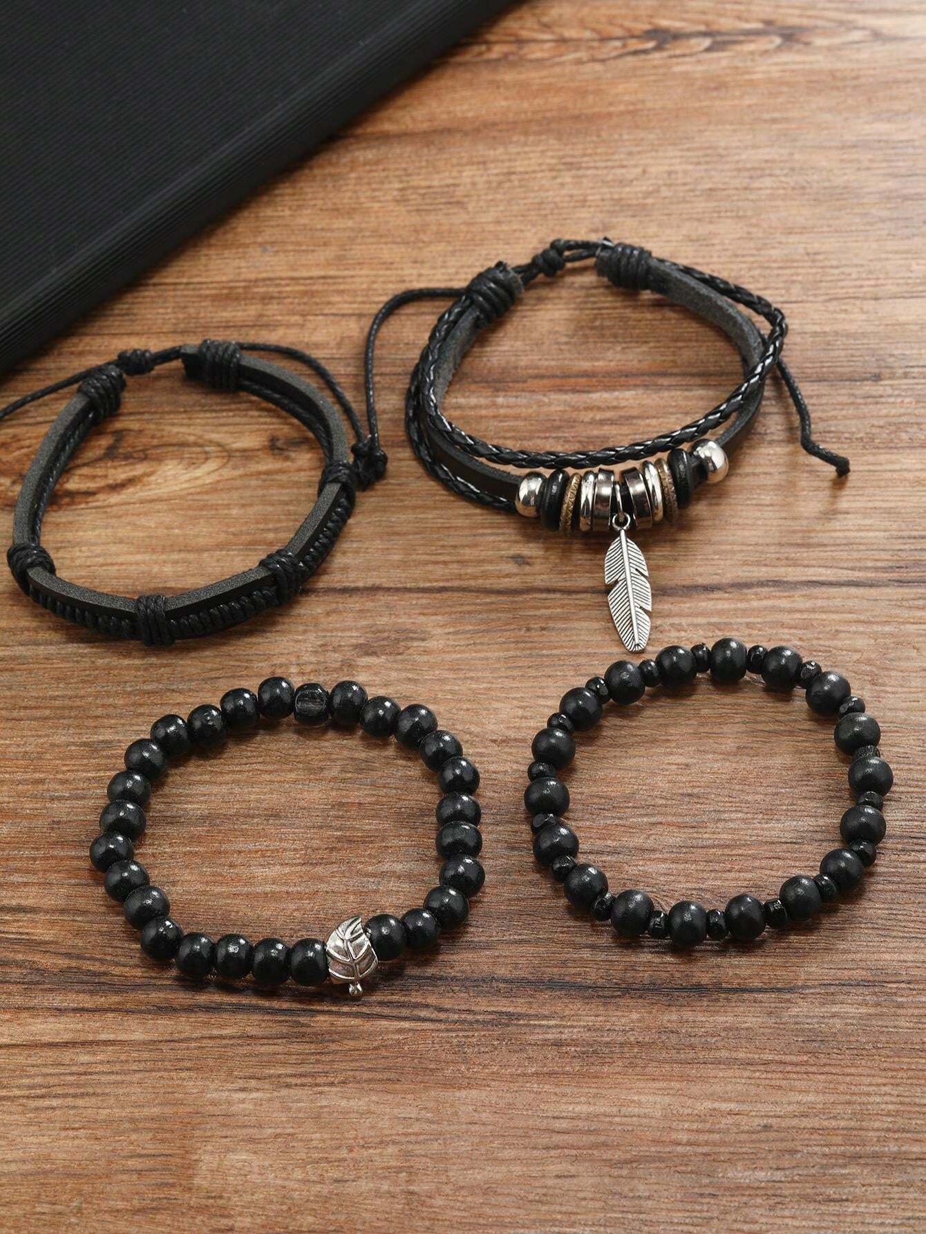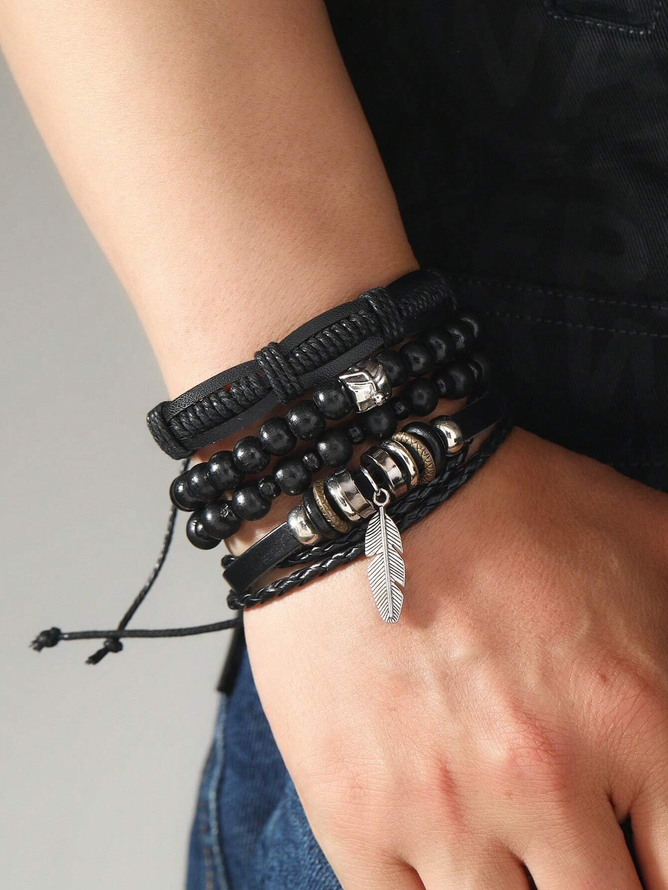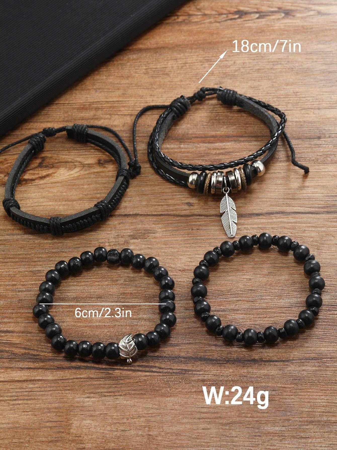 4 Men's Dark Leather Beaded Adjustable Bracelets For Daily Decorations, Jewelry Gifts And Parties