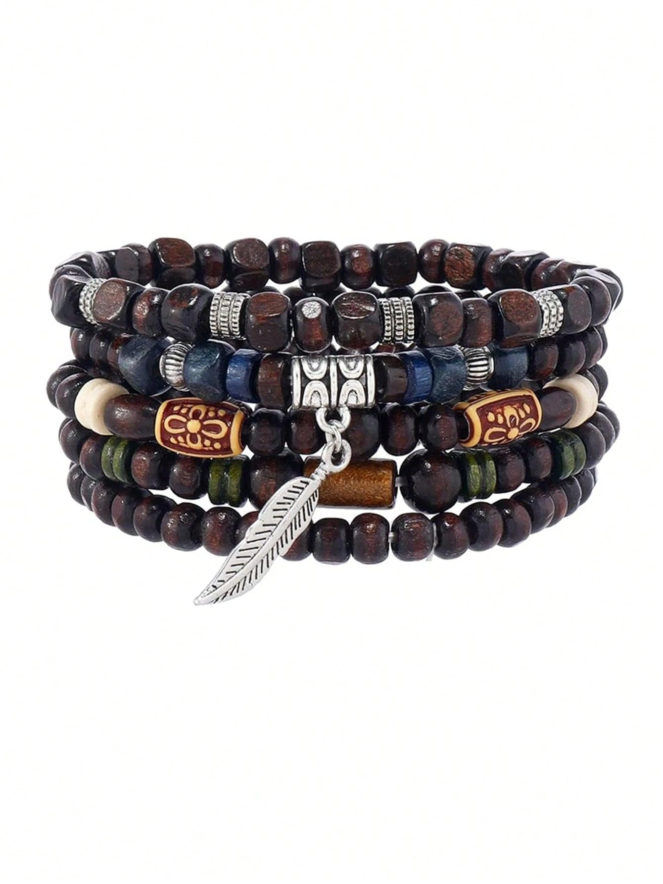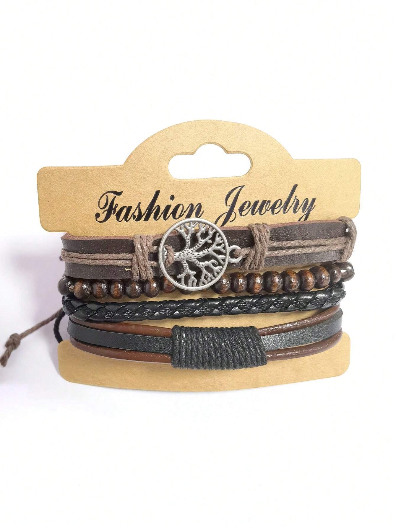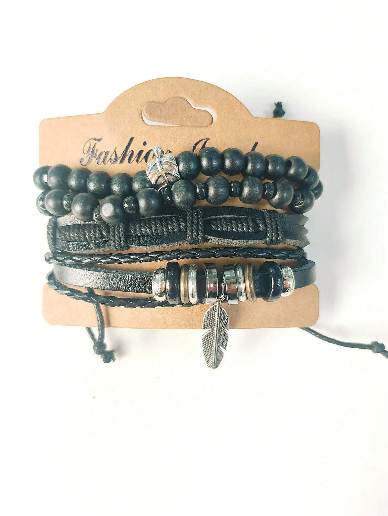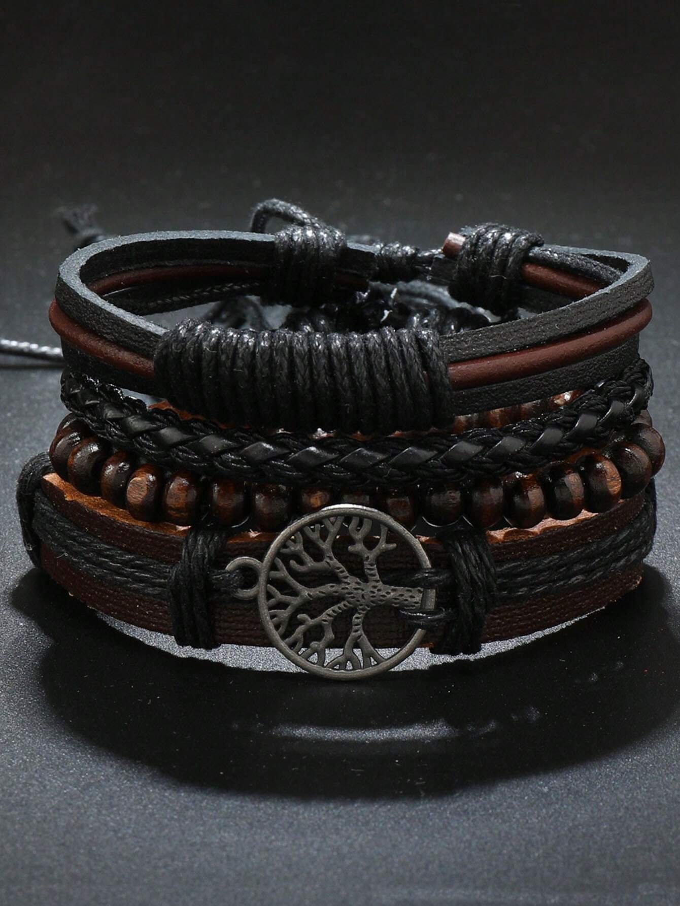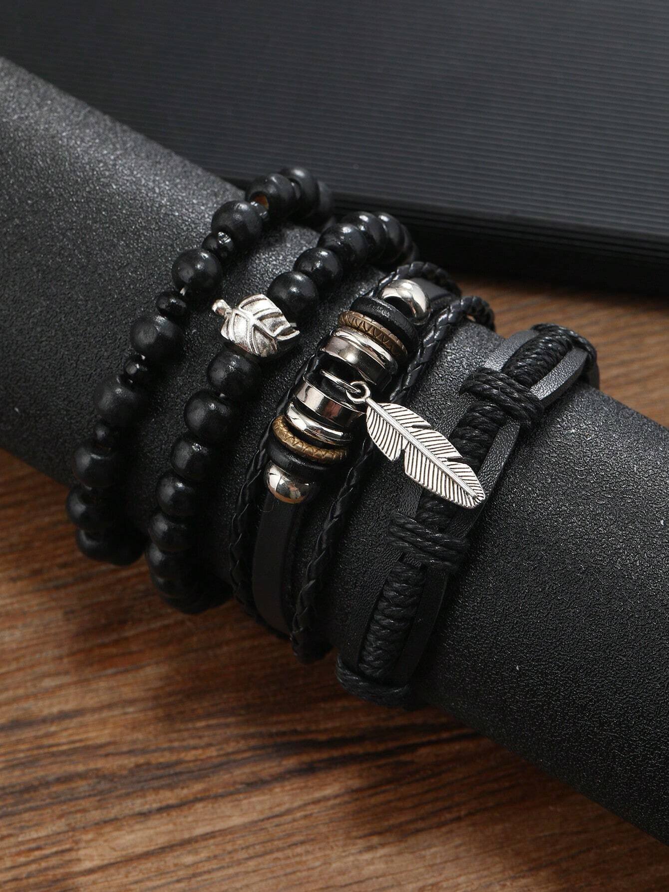 4 Men's Dark Leather Beaded Adjustable Bracelets For Daily Decorations, Jewelry Gifts And Parties