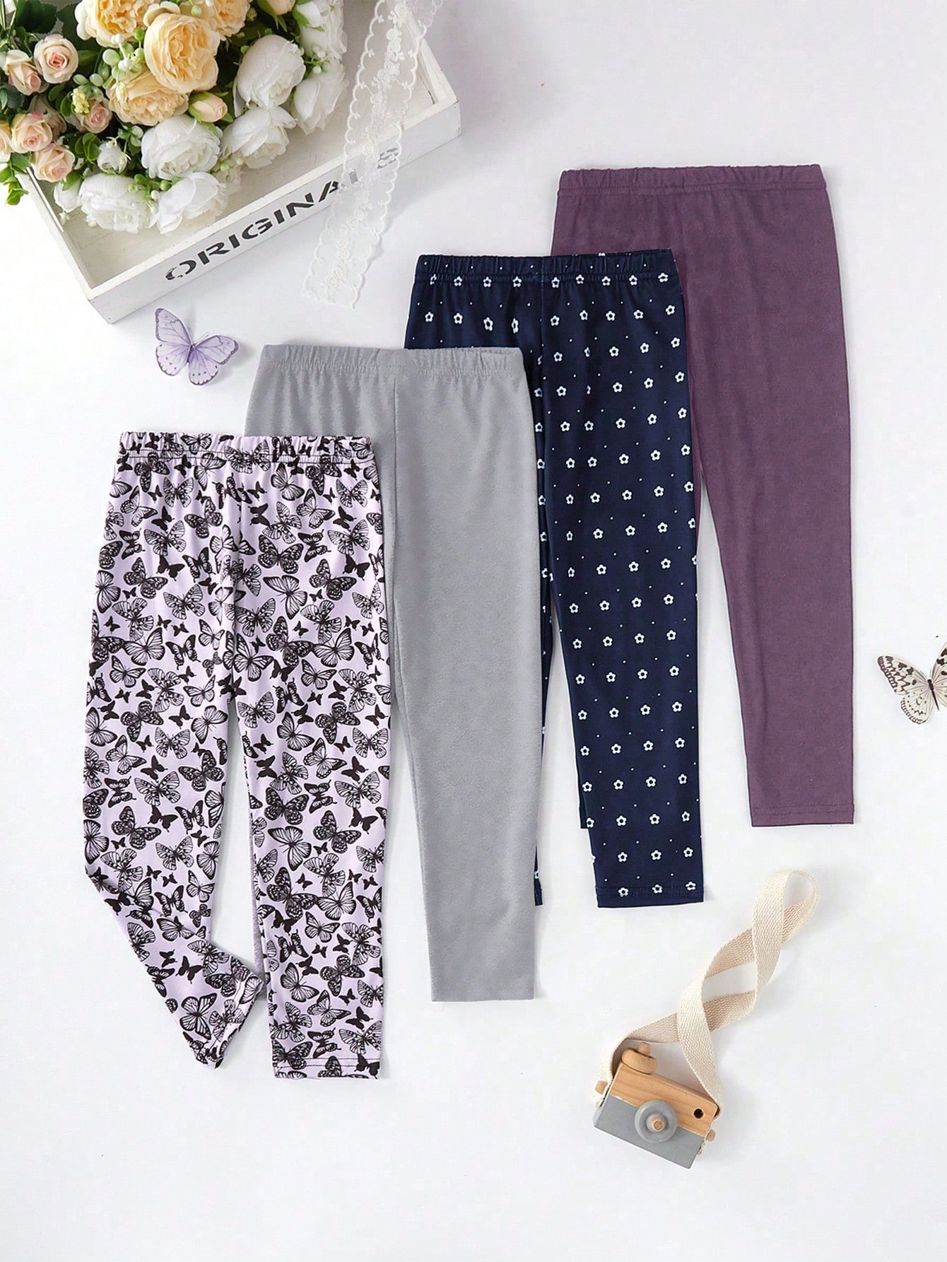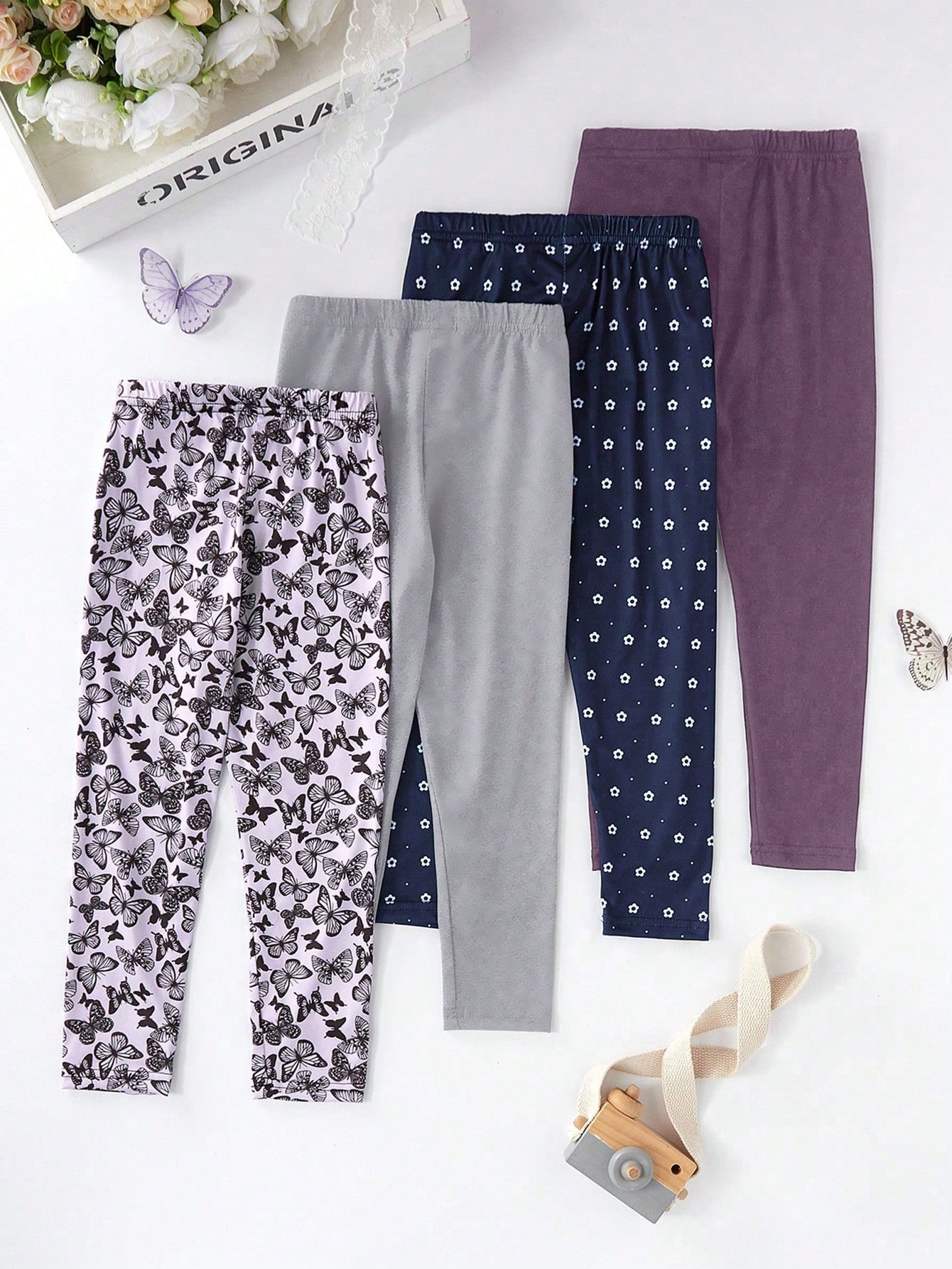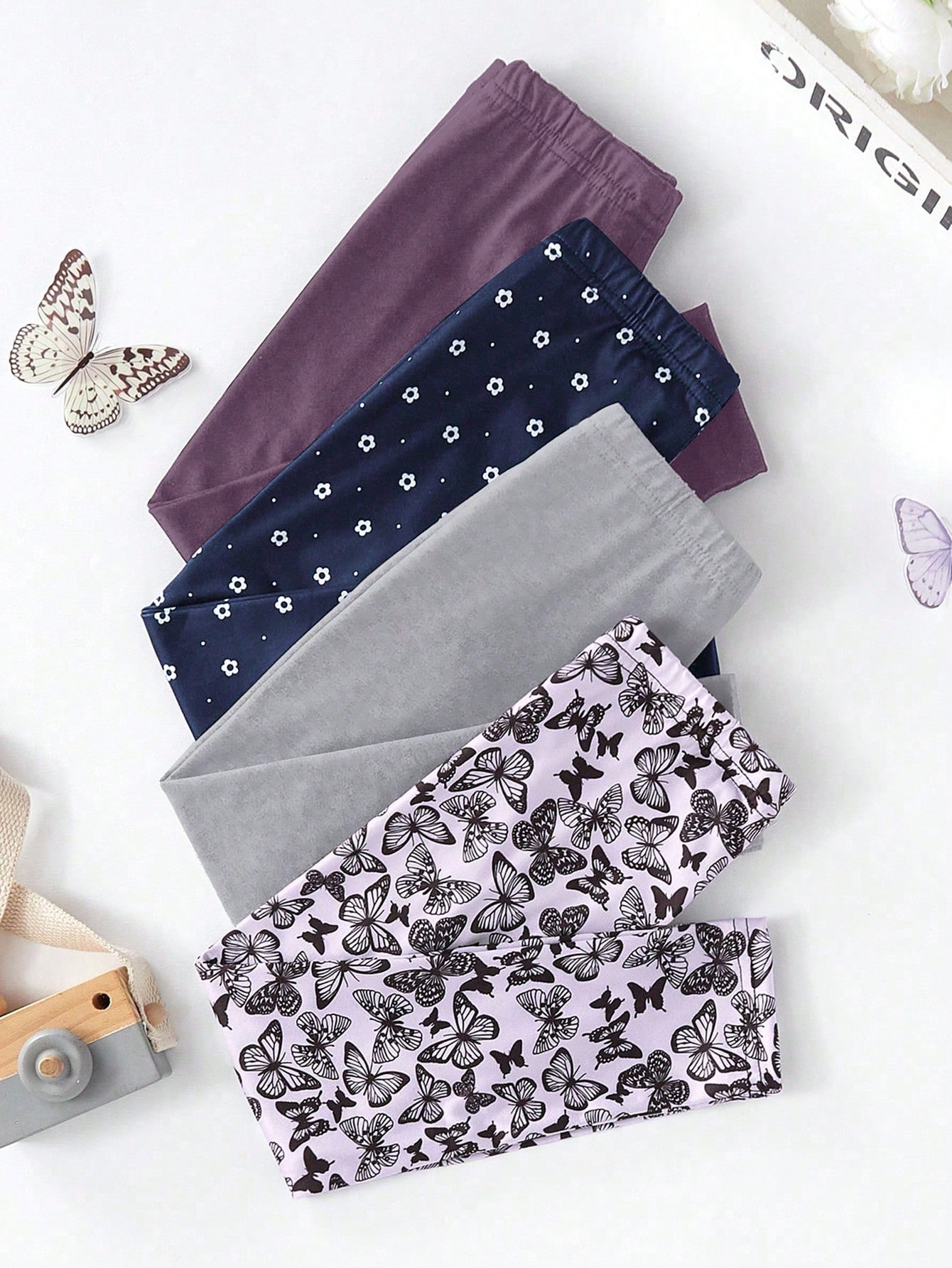 4pcs Little Girls Minimalist Butterfly & Floral Print And Solid Leggings Set