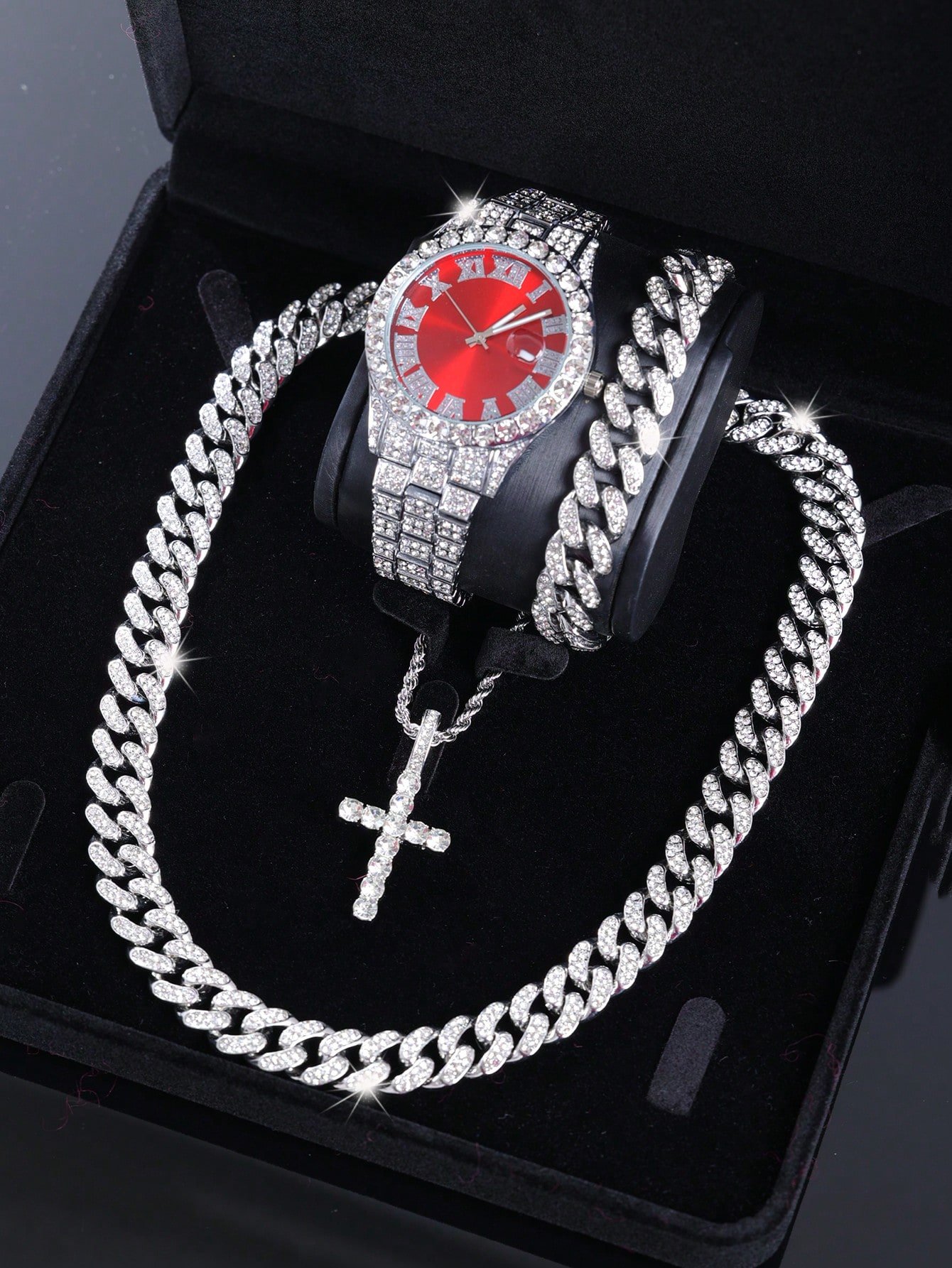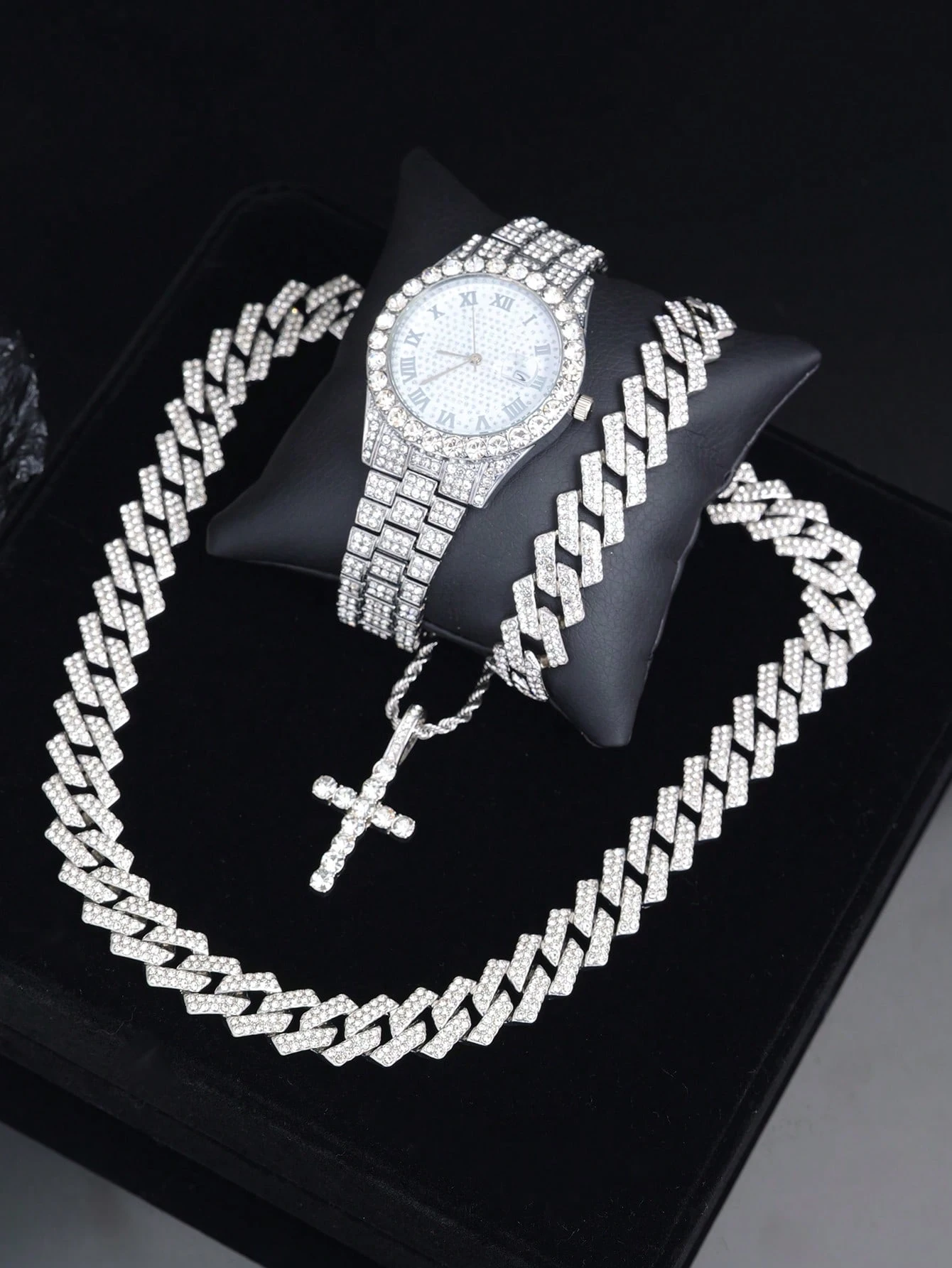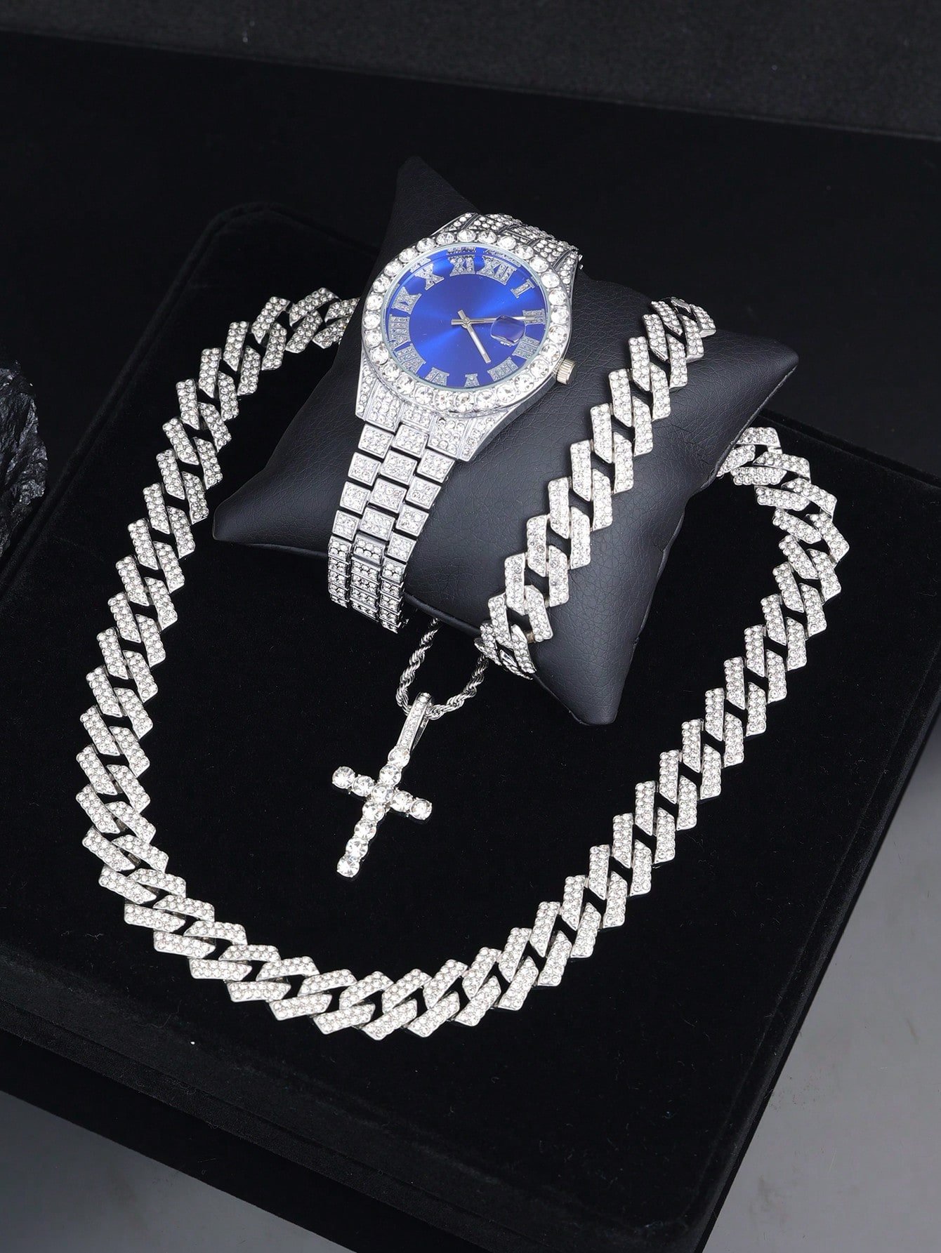 4pcs/Set Cuban Chains Necklace Bracelet Set Men's Jewelry Quartz Watch Set With Cross Pendant Necklace Hip Hop Style Cool Jewelry Gift Without Gift Box