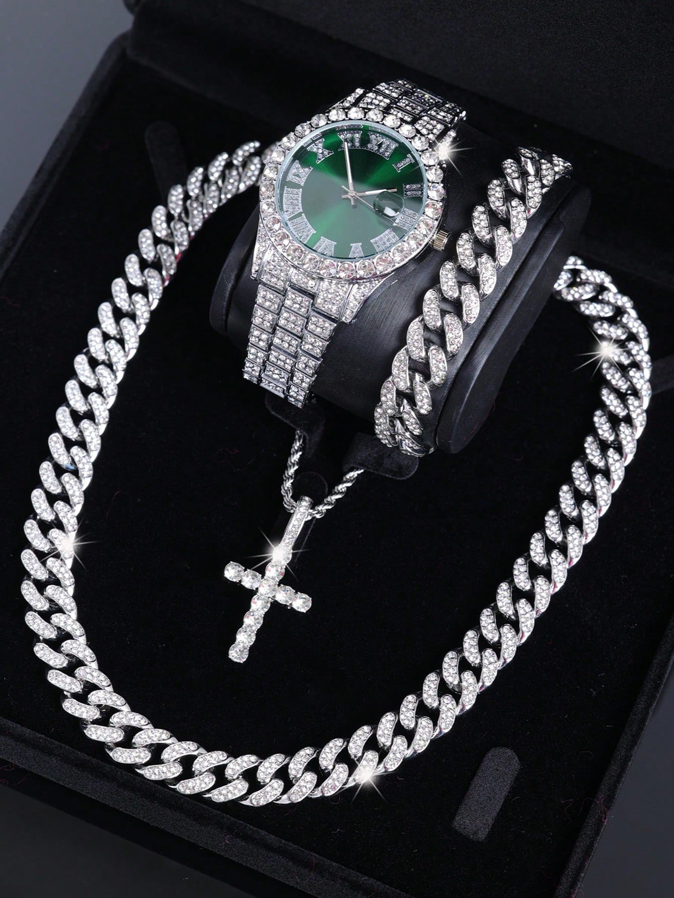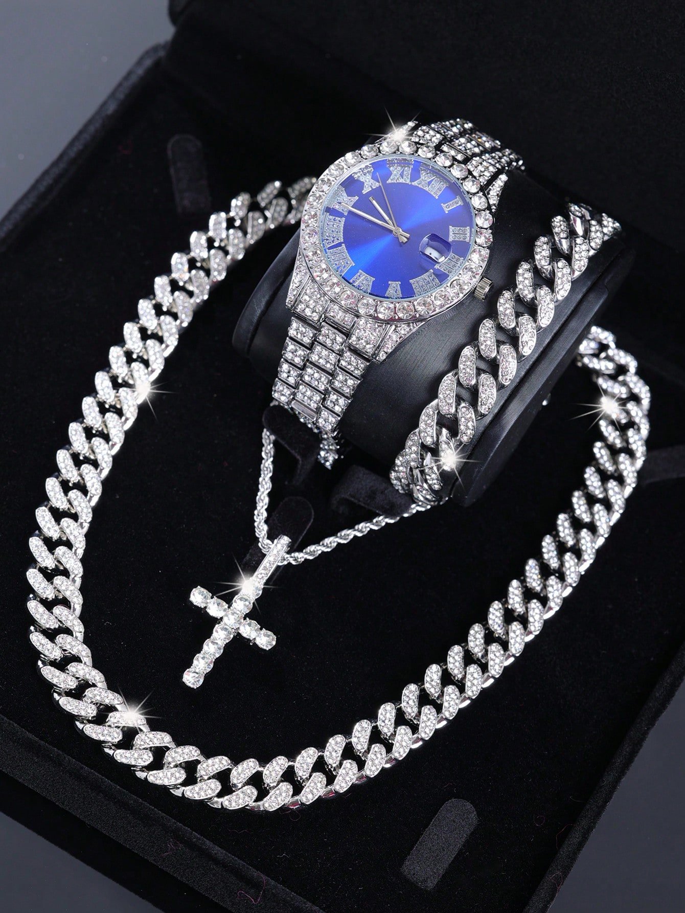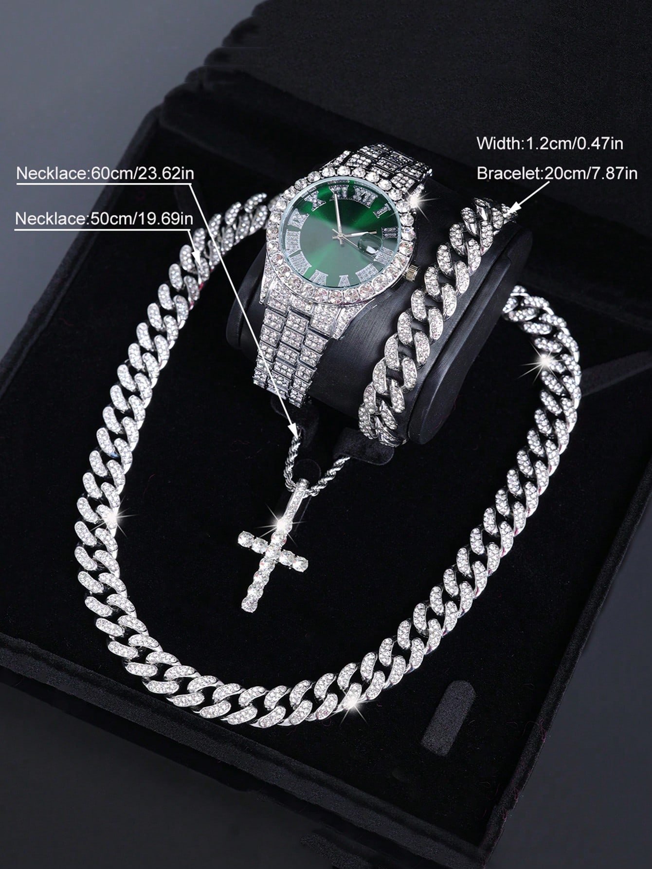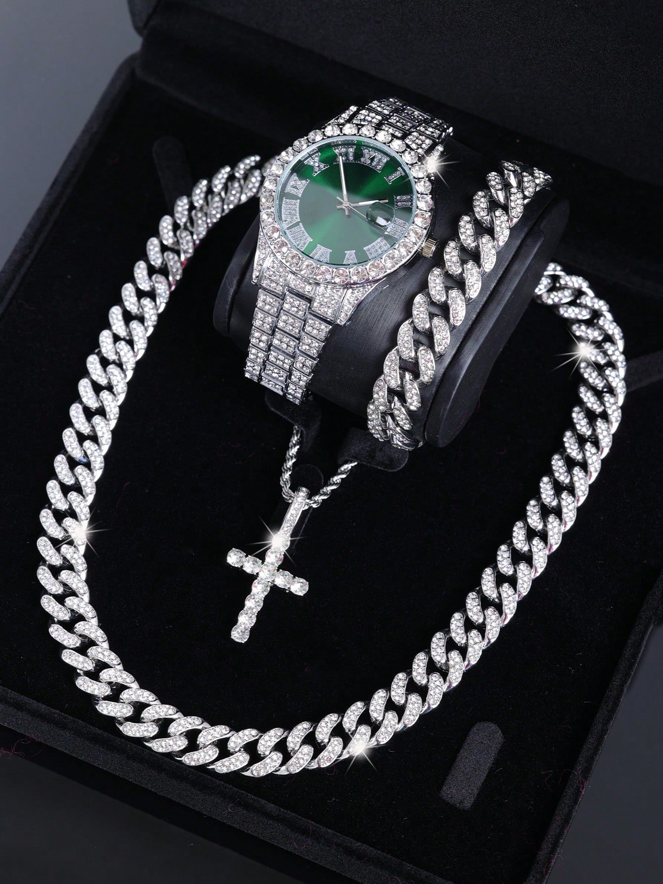 4pcs/Set Cuban Chains Necklace Bracelet Set Men's Jewelry Quartz Watch Set With Cross Pendant Necklace Hip Hop Style Cool Jewelry Gift Without Gift Box