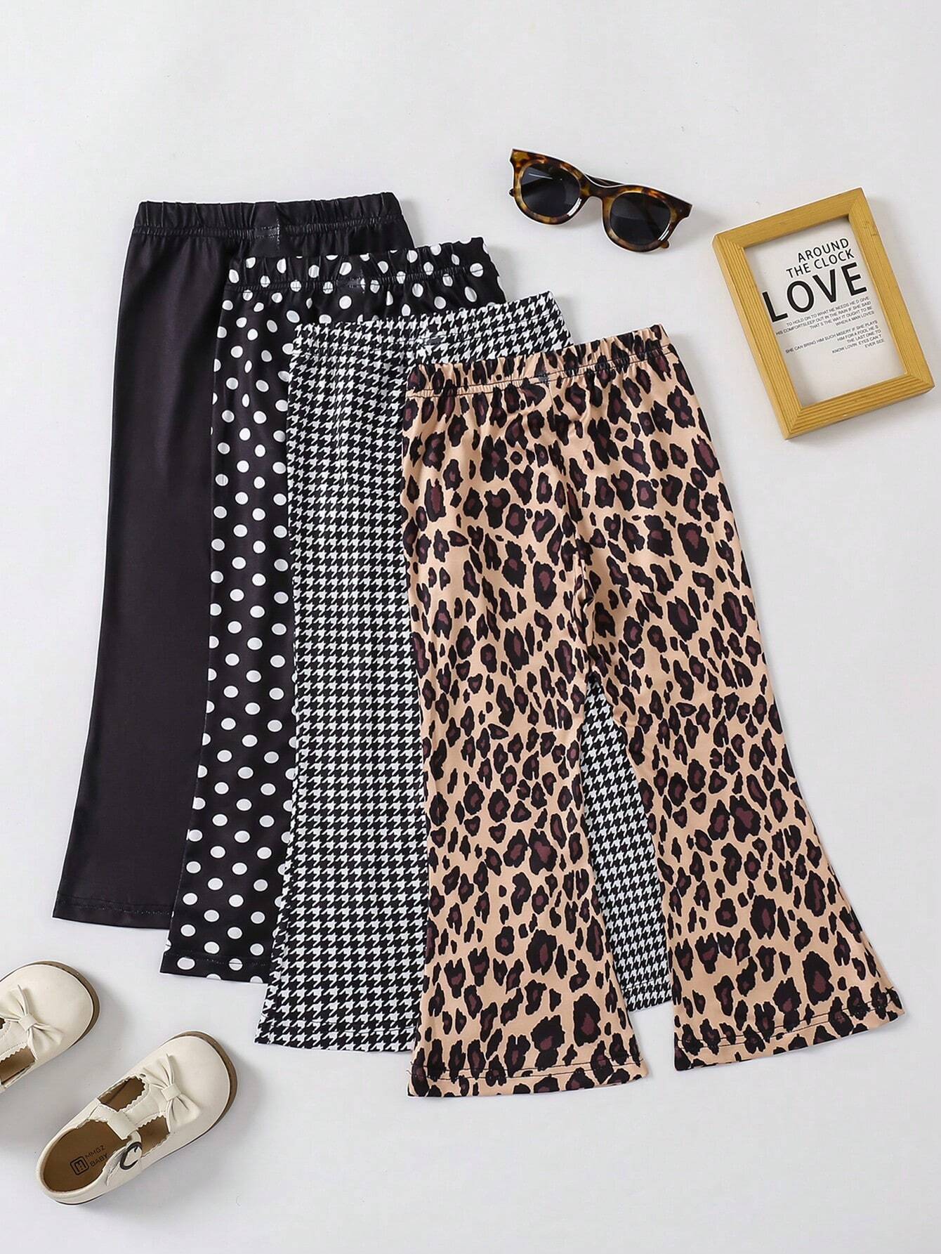 4pcs/Set Young Girl Autumn/Winter Knitted Leopard Houndstooth Polka Dot Solid Black Flared Pants, Casual Leggings
