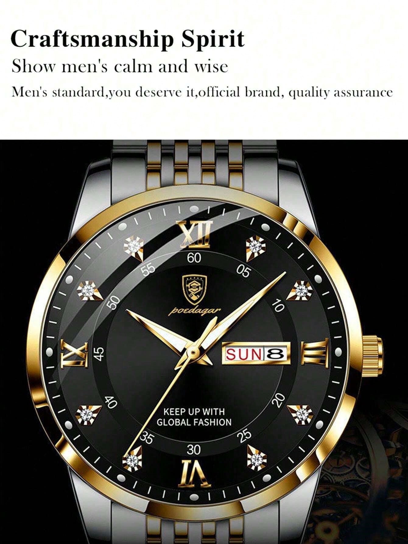 50M Waterproof Watch Real Brand POEDAGAR Classic Round Stainless Steel Men Watch Dual Date English Day Display Luminous Japan Imported Quartz Automatic Movement Built-In Long-Life Battery Luxury Gift Brothers Business Partners Fathers Men's Birthday Exam