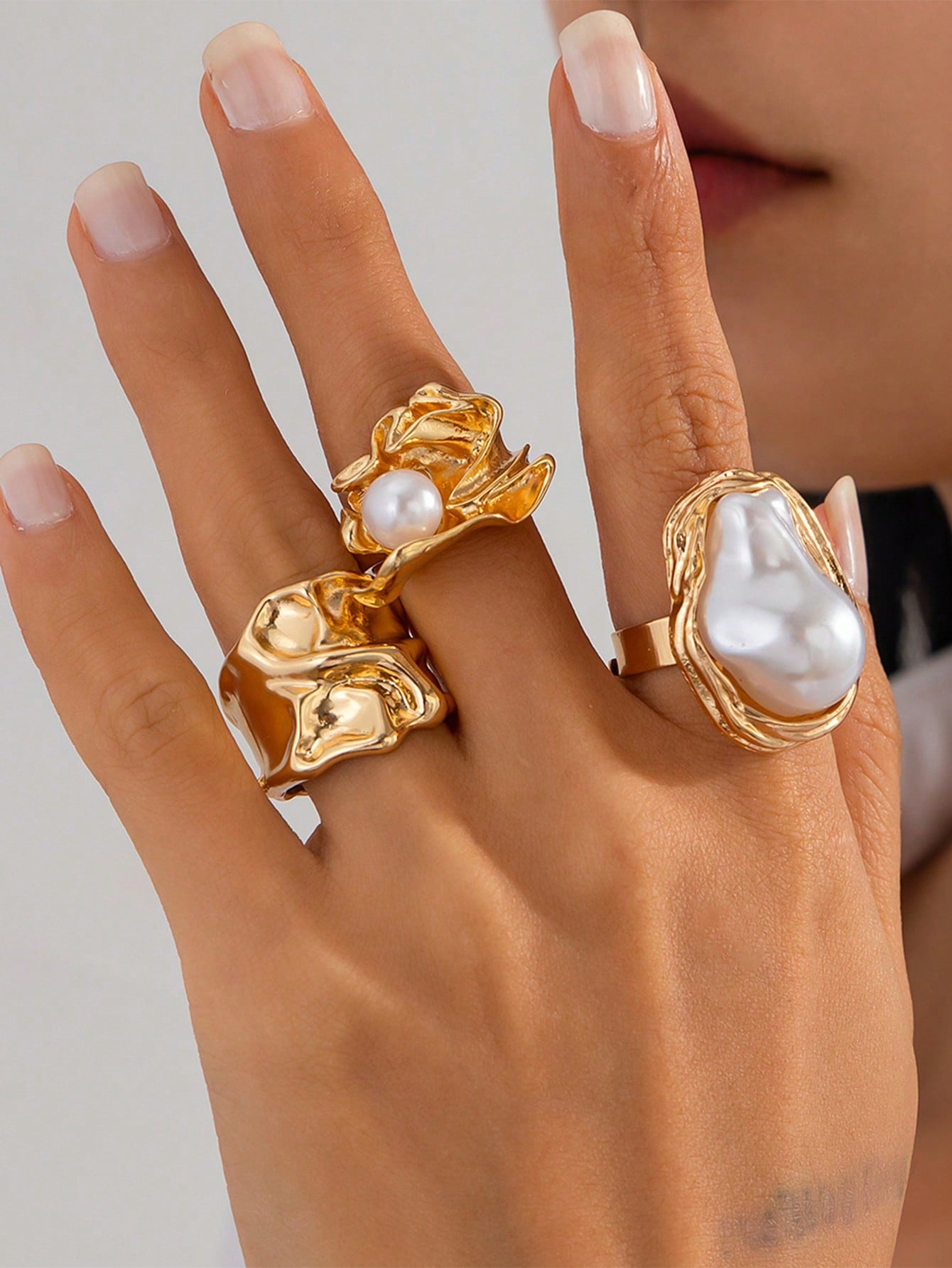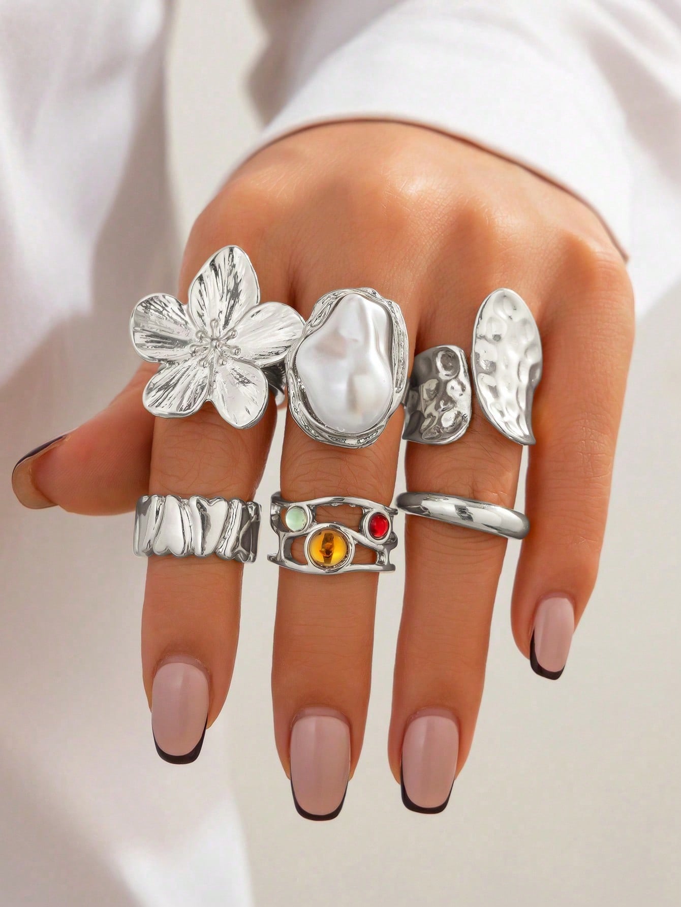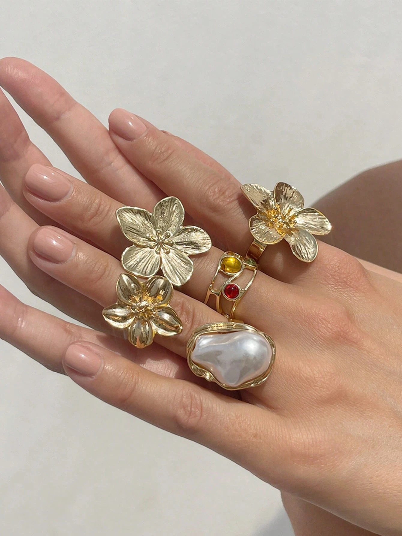 5pc/Set Vintage Metal Flower & Gemstone Decor Ring Set, Elegant Baroque Faux Pearl Open Ring, Versatile For Daily Wear, Party, Festival Gift, Valentine's Day, Mother's Day