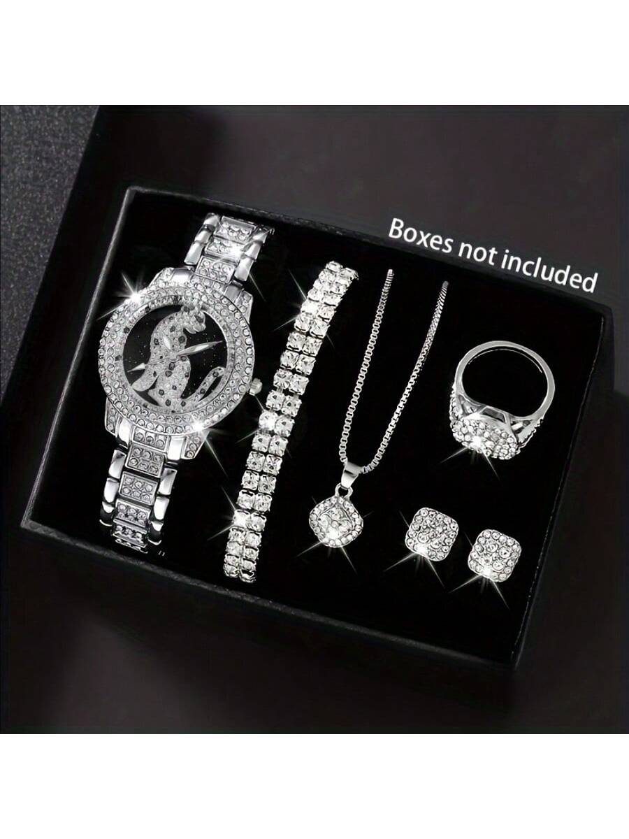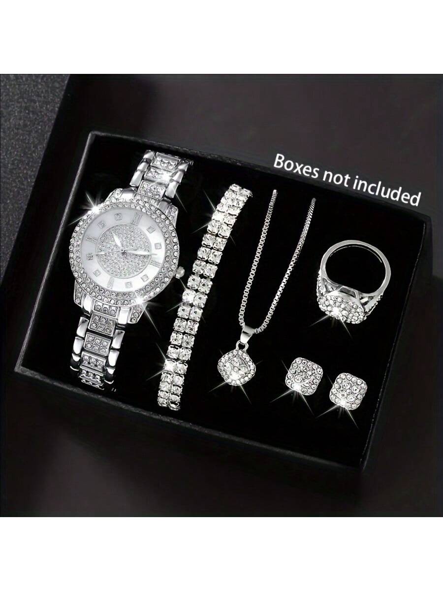 7pcs Elegant Quartz Watch And Jewelry Set, Fashion Women's Round Watch, Rhinestone Necklace, Earrings, Ring, Bracelet Set No Box