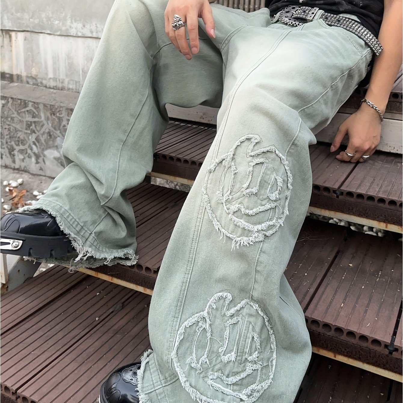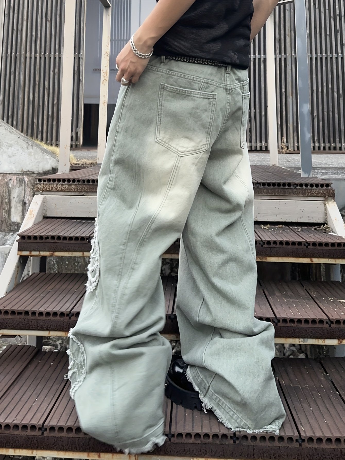 American High Trendy Frayed Patchwork Washed Distressed Men's Loose Fit Wide-Leg Jeans