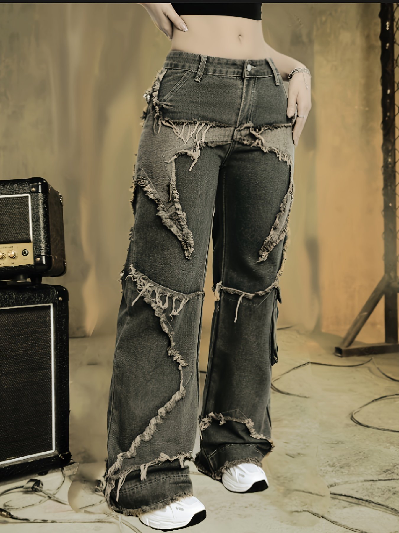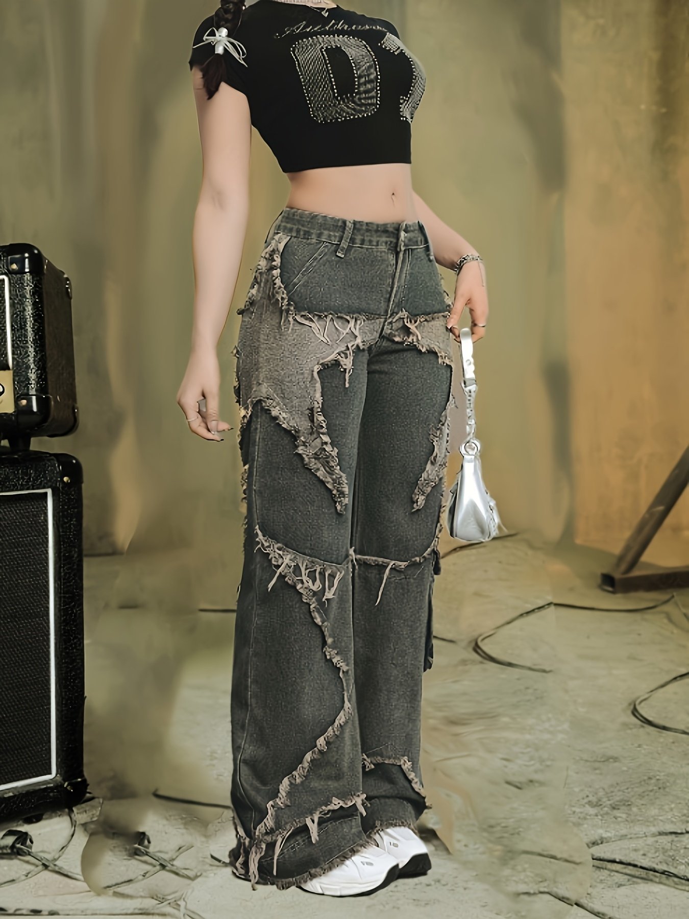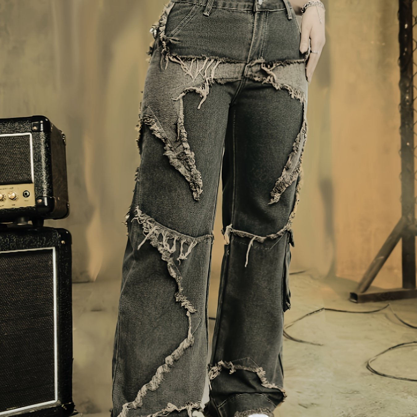 AW25 Women'S High-Waisted Wide-Leg Jeans with Contrast Stitching – Frayed Hem & Distressed Details, Non-Stretch Denim, All-Season Casual Elegant Style, High Waisted Jeans, Allseason Jeans, Geometric Pattern Jeans, Frayed Hem Jeans