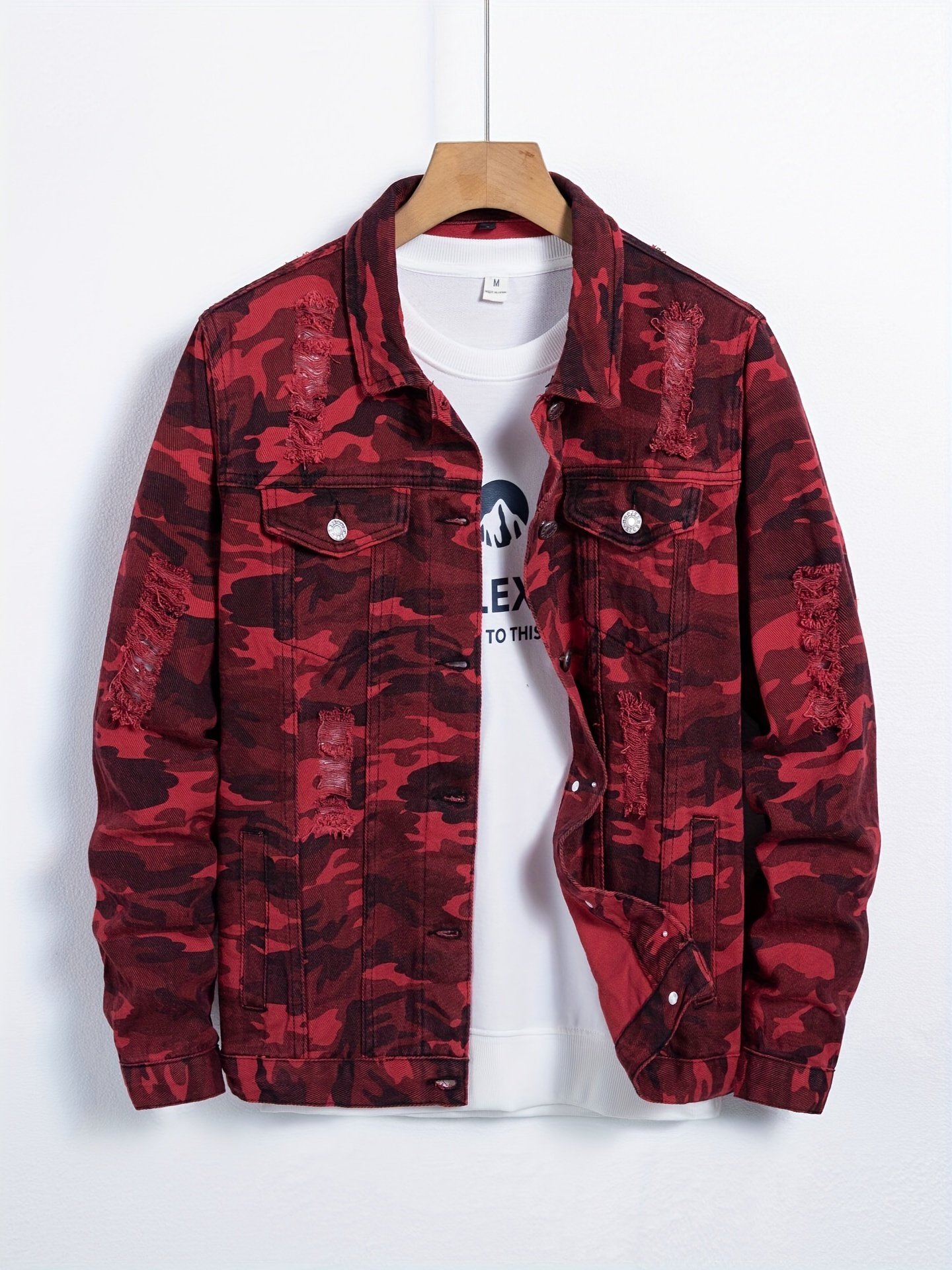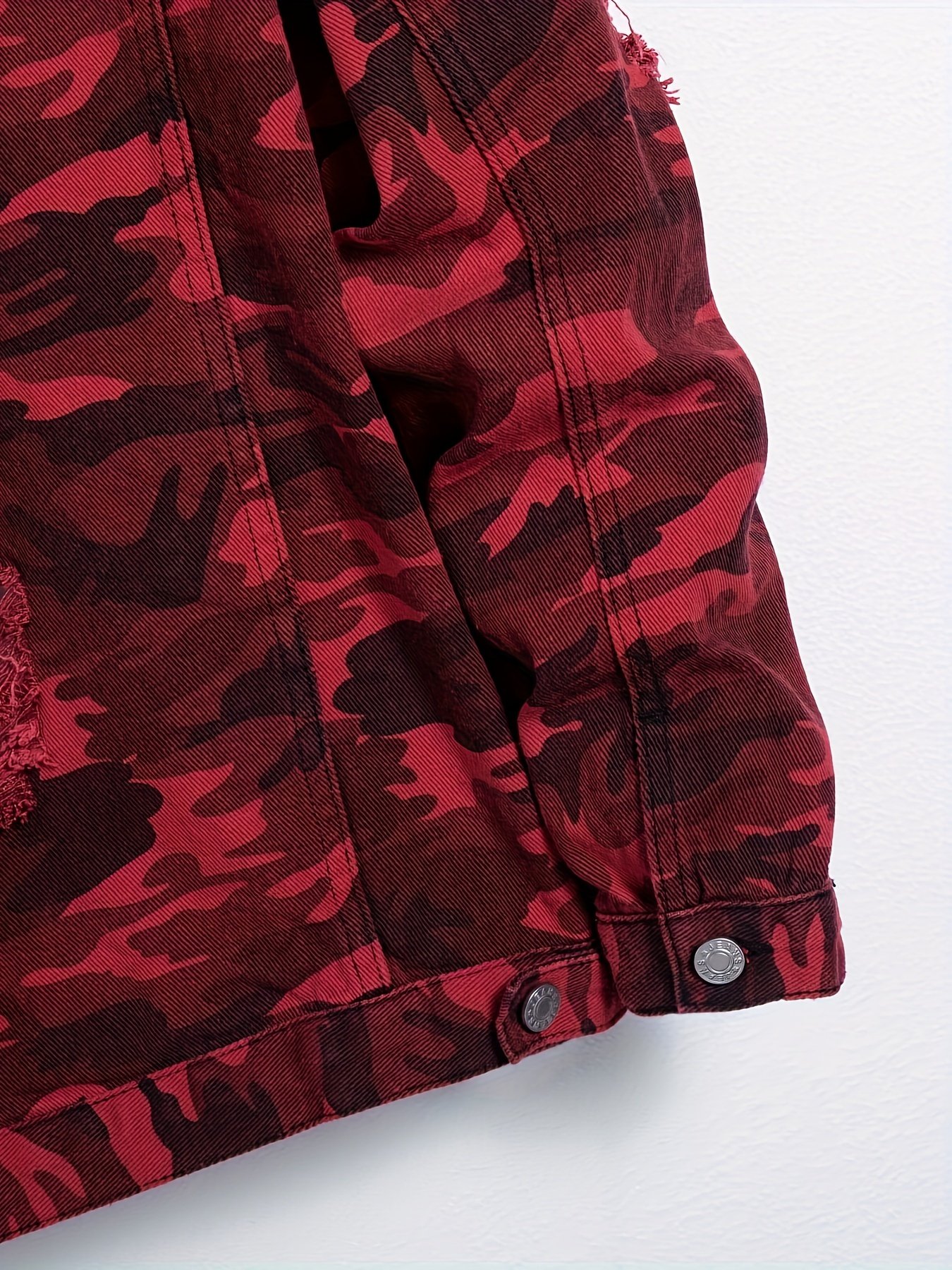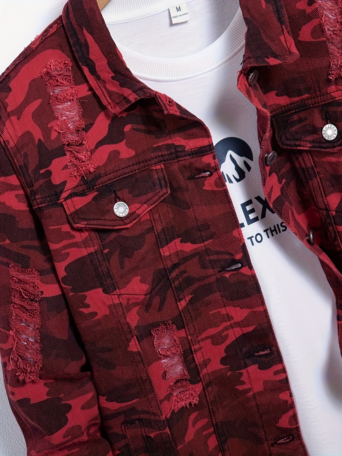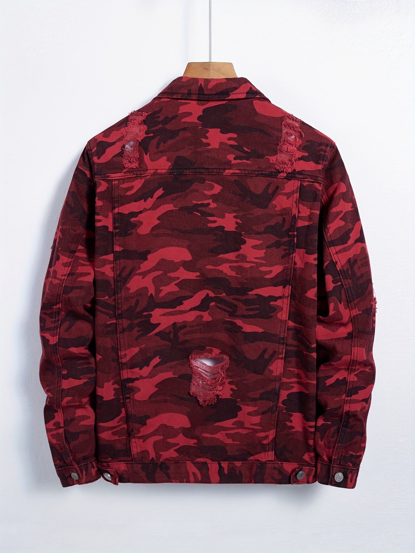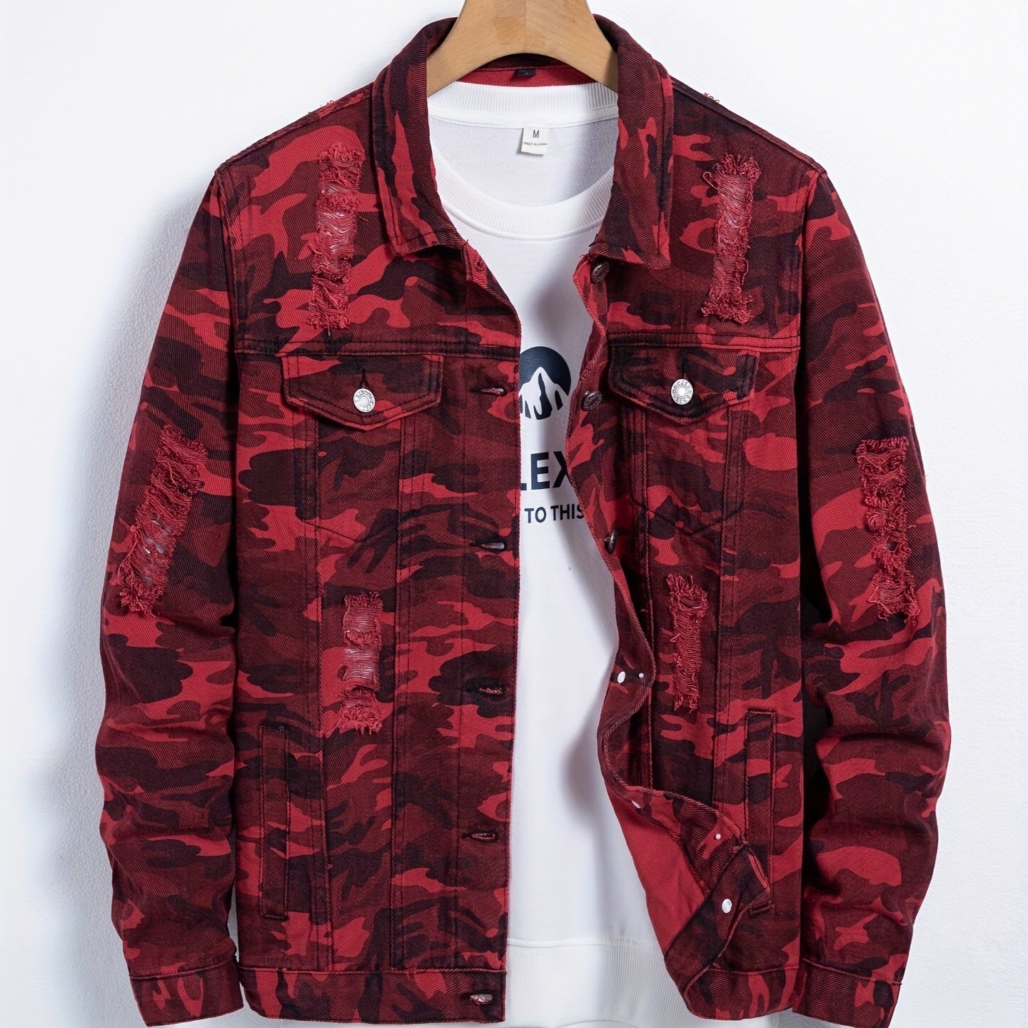 Camouflage Pattern Denim Jacket, Men's Casual Street Style Multi Pocket Ripped Coat