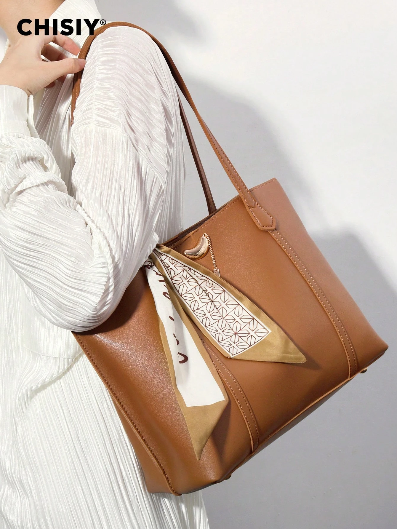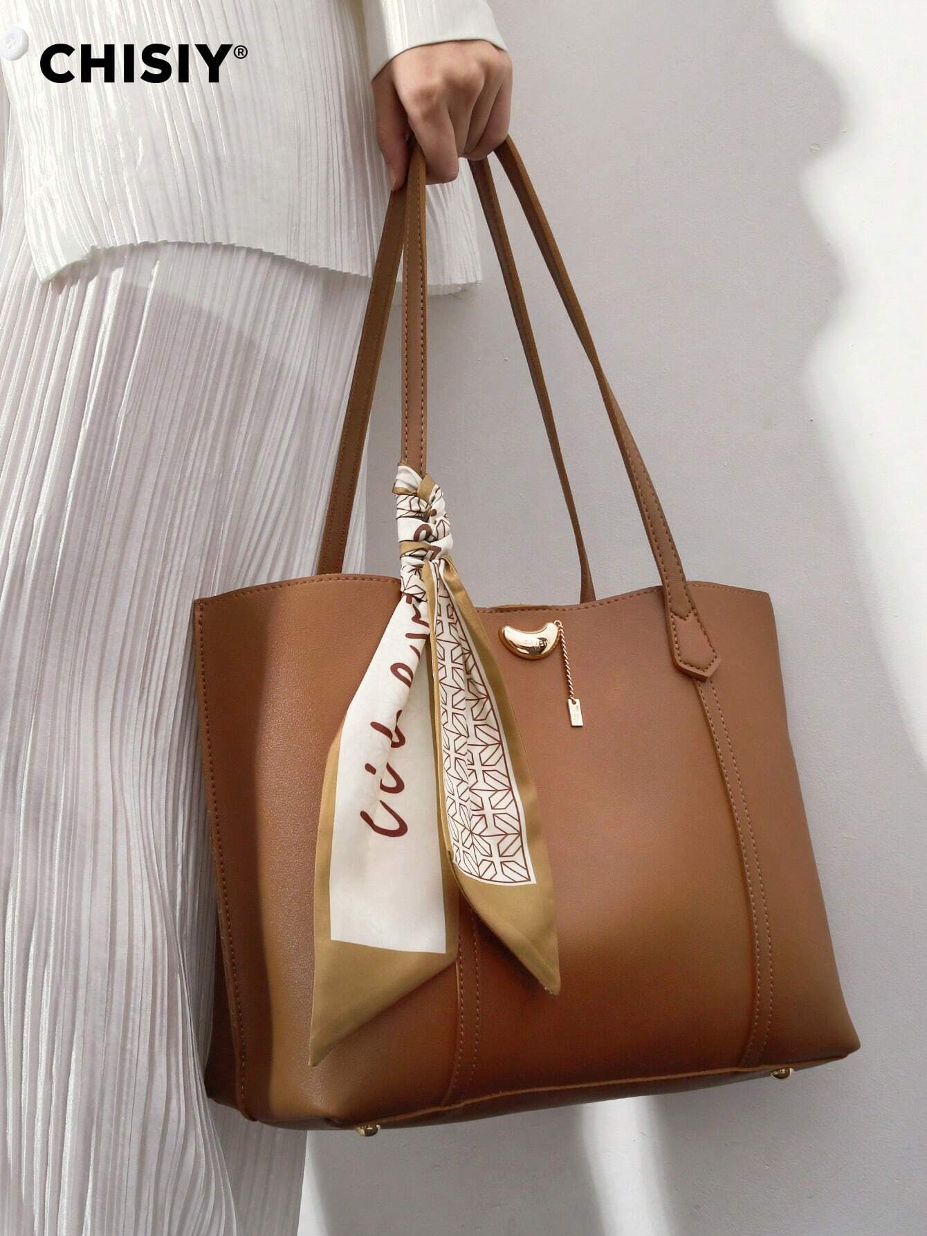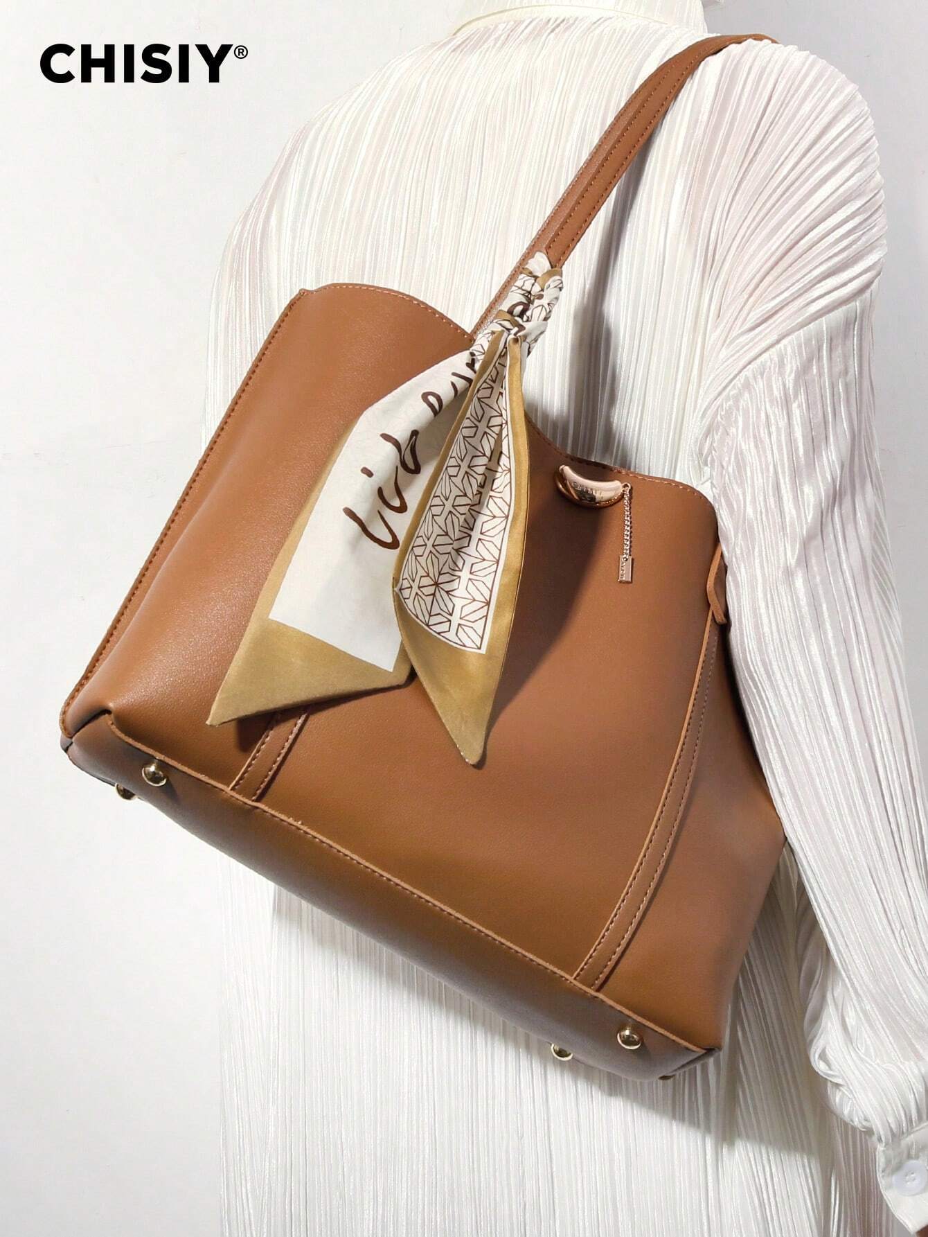 CHISIY Handmade Solid Color Golden Bead, Letter, Plaid Pattern Contrast Color PU Leather Tote Bag, Casual Minimalist Underarm Bag, Elegant Business Large Capacity Women Commuter Bag, Casual Student Shoulder Bag, Fashionable Date Handbag, Suitable For Offi