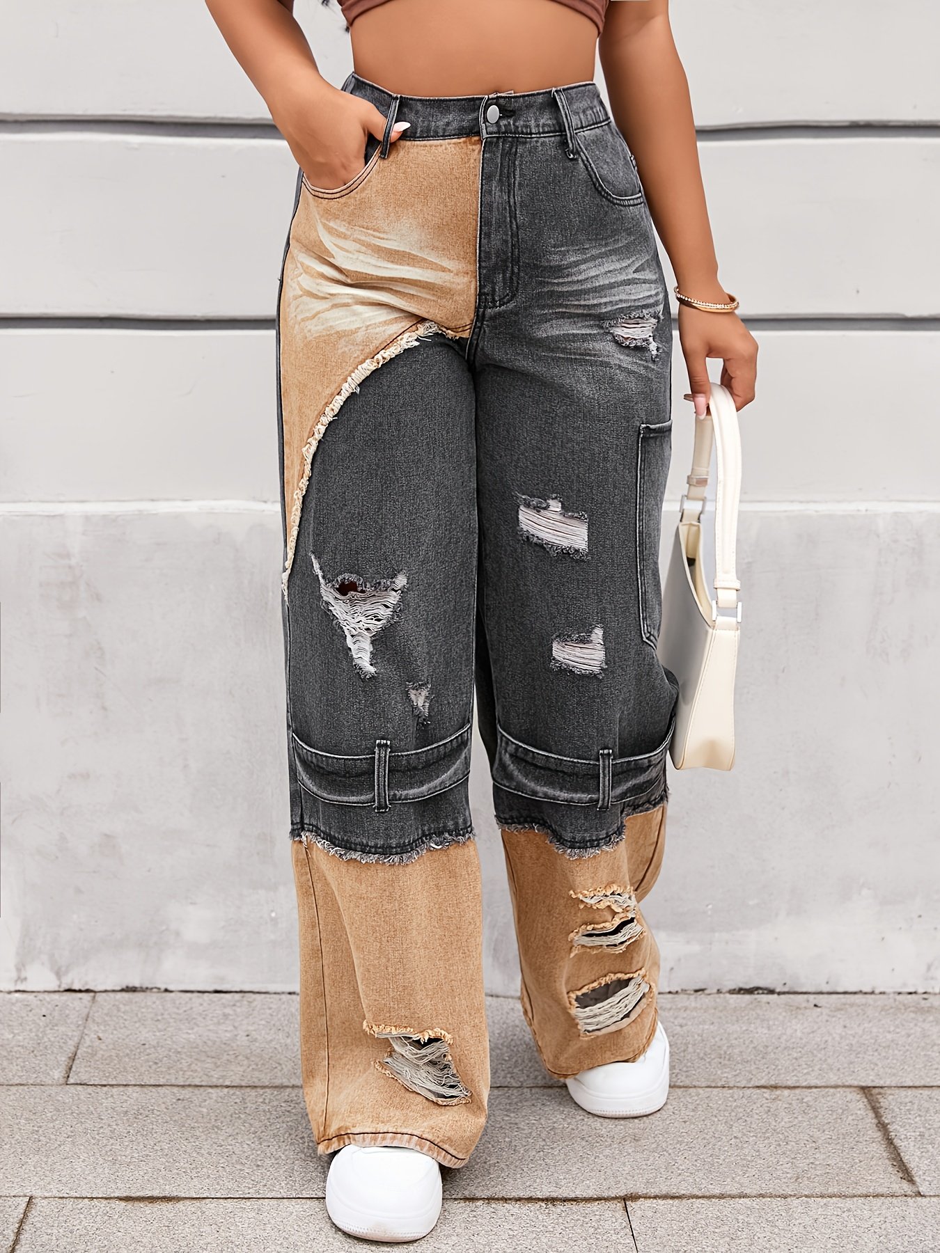 Color Block Ripped Denim Non-Stretch Regular Fit Women's Washed Jeans
