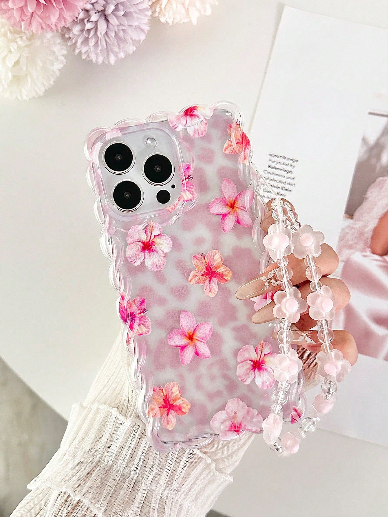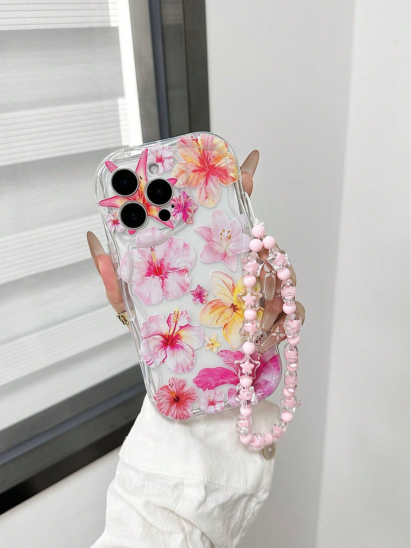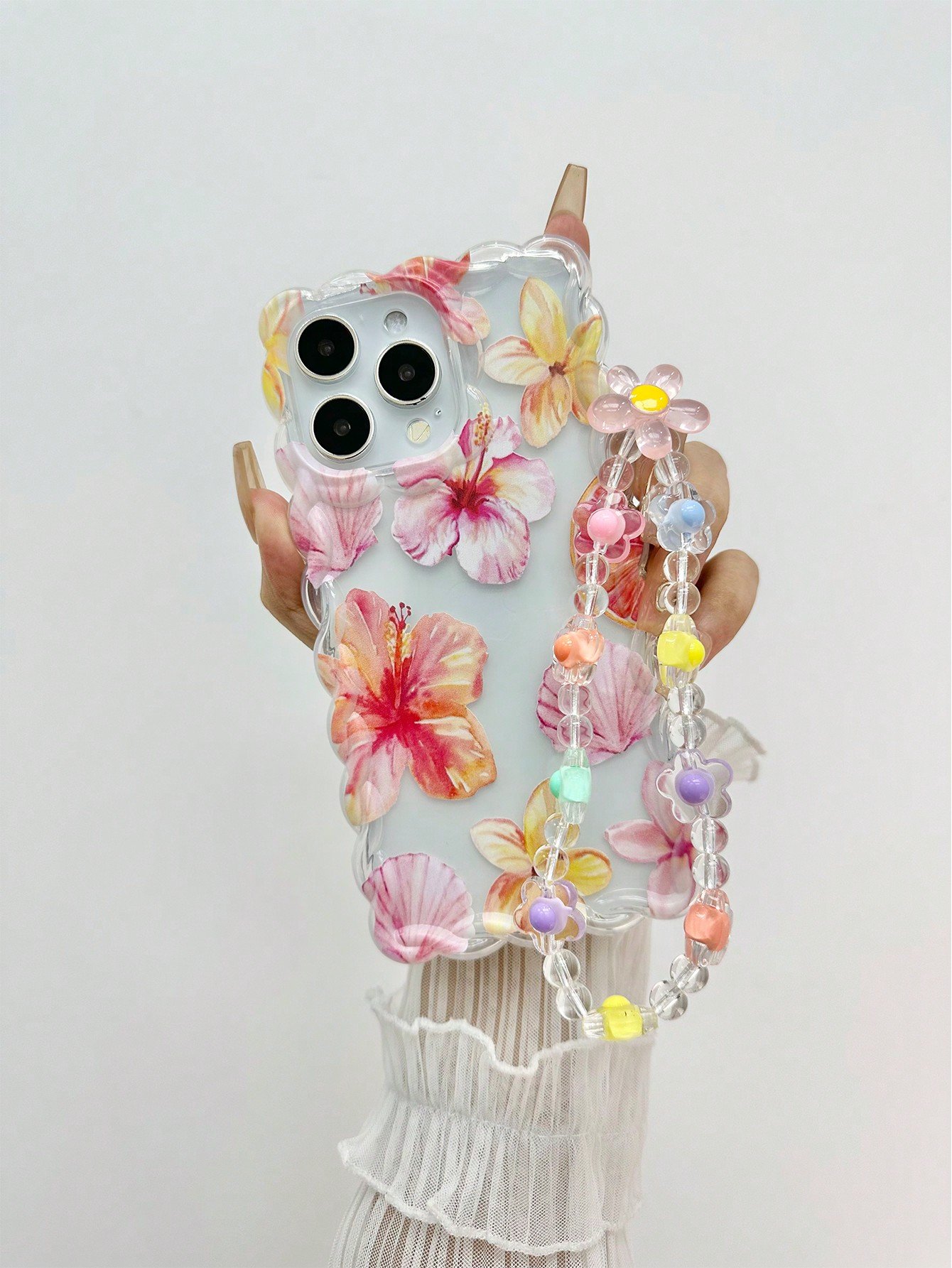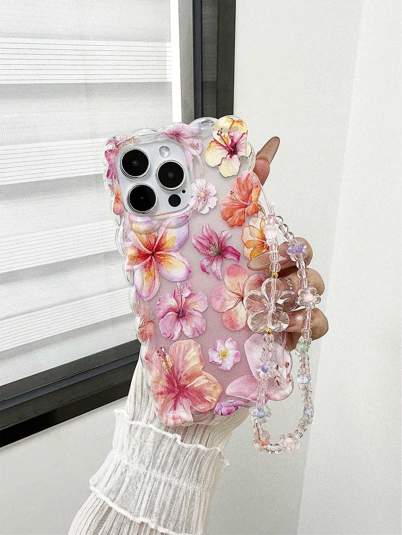 Cream Patterned Wavy Edged Glossy Floral Painted Anti-Drop Phone Case With Handmade Beaded Flower Bracelet Accessories, Compatible With IPhone 16/11/16pro/16plus/16promax/16e/15Promax/13/14/12/XS/XR/7G/8P, Galaxy 11/12Pro/12/12X/13Pro/14Pro/15Pro/, Redmi