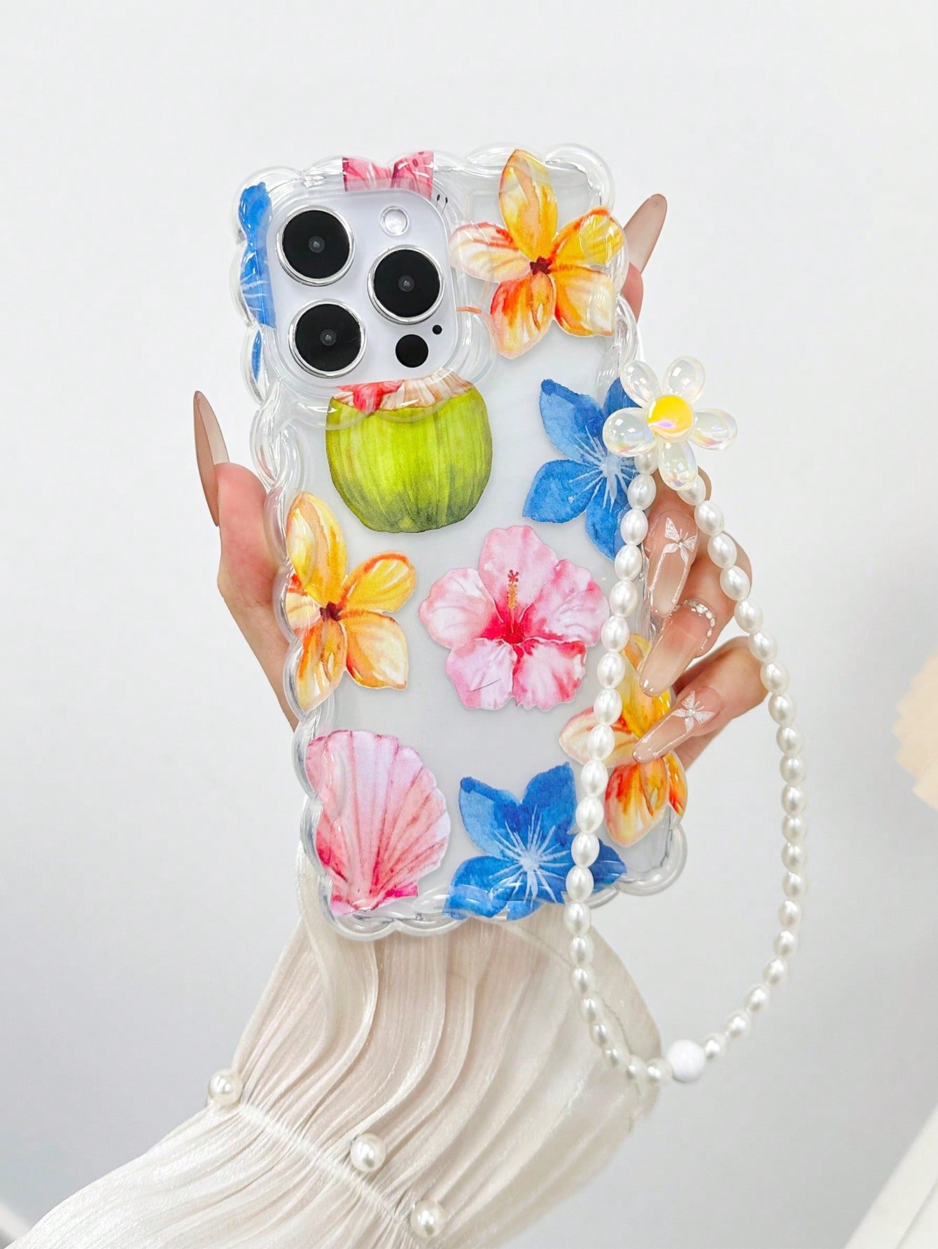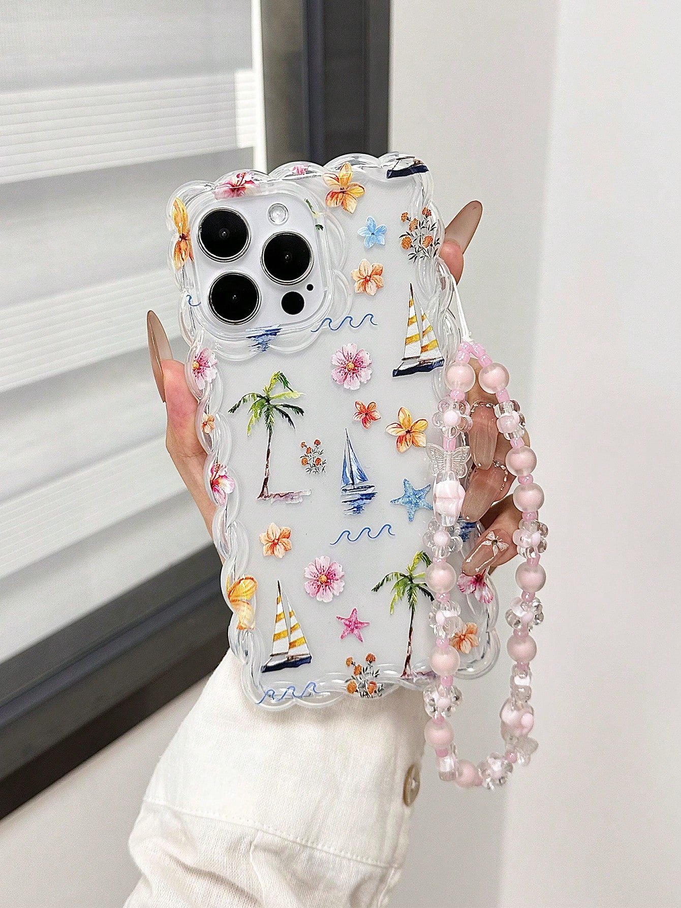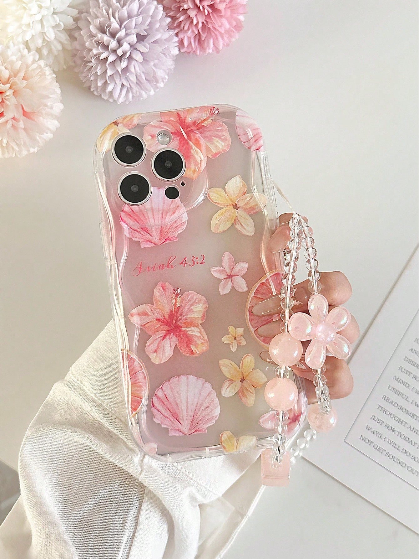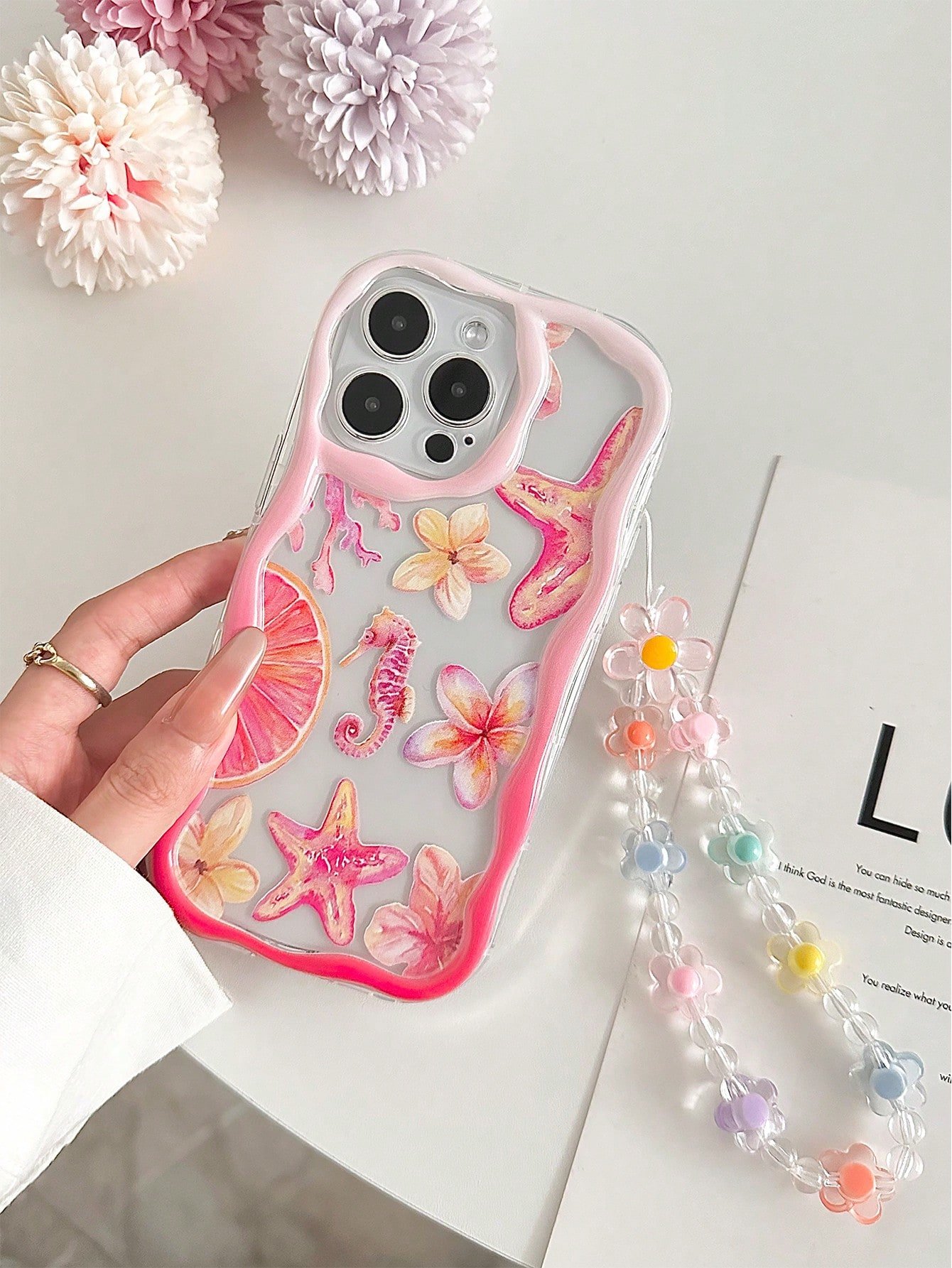 Cream Patterned Wavy Edged Glossy Floral Painted Anti-Drop Phone Case With Handmade Beaded Flower Bracelet Accessories, Compatible With IPhone 16/11/16pro/16plus/16promax/16e/15Promax/13/14/12/XS/XR/7G/8P, Galaxy 11/12Pro/12/12X/13Pro/14Pro/15Pro/, Redmi
