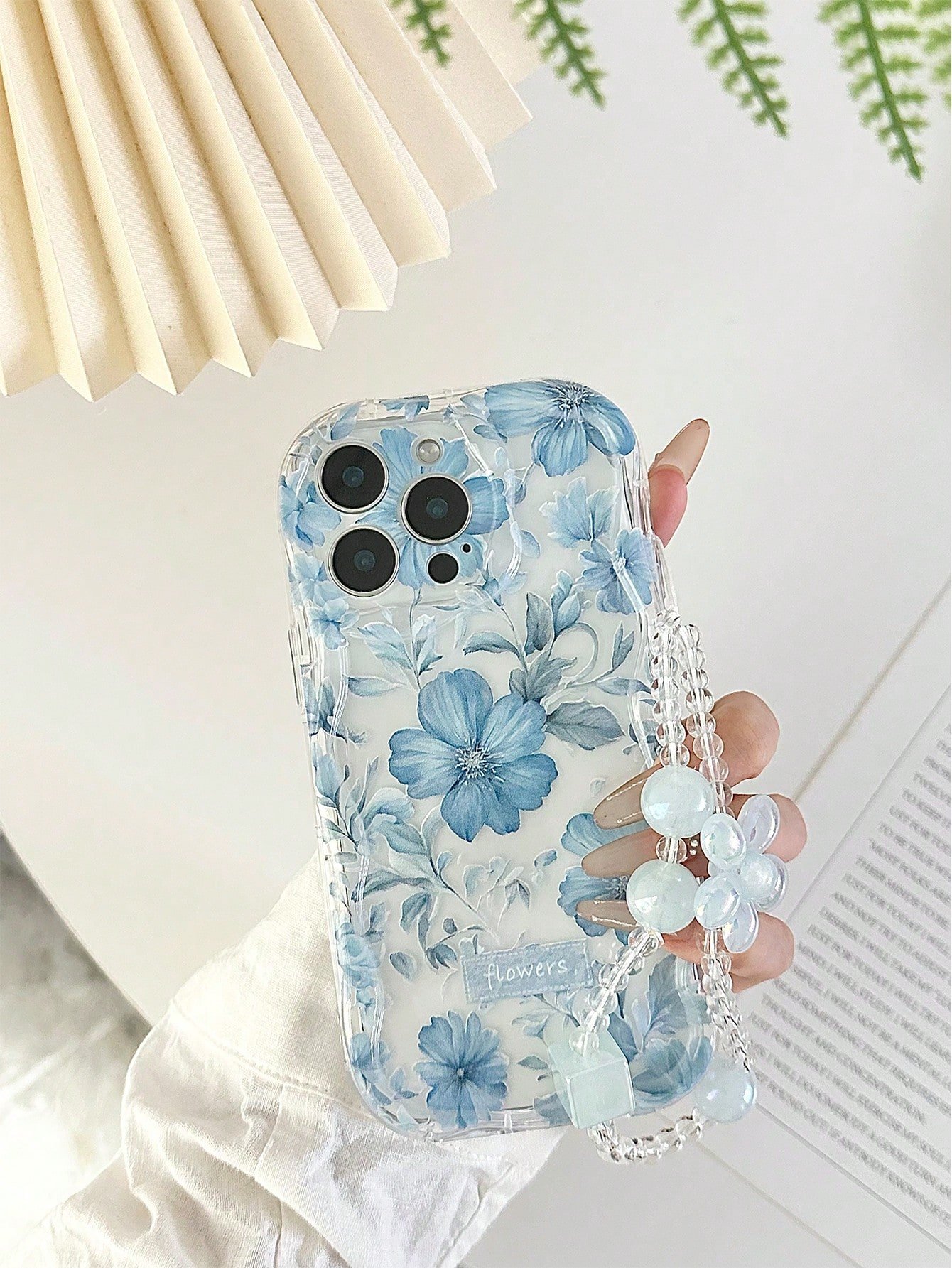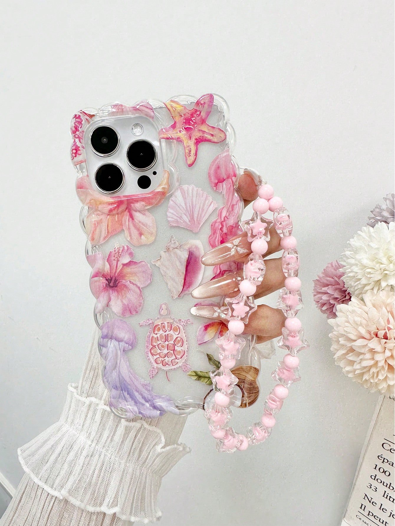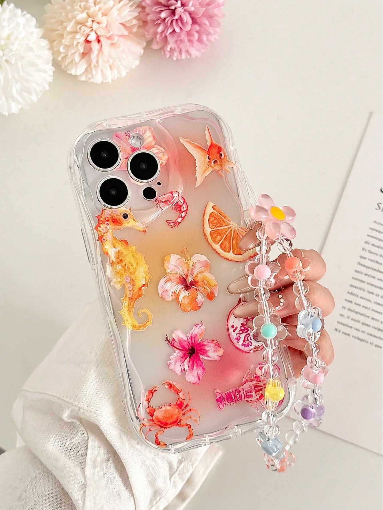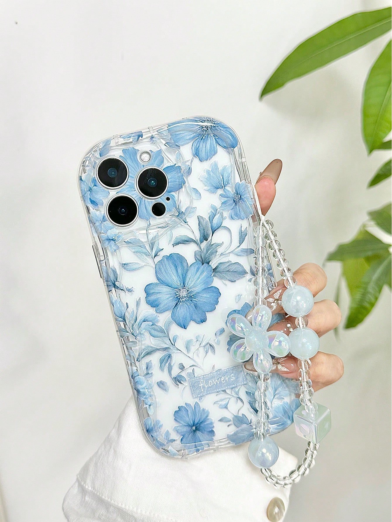Cream Patterned Wavy Edged Glossy Floral Painted Anti-Drop Phone Case With Handmade Beaded Flower Bracelet Accessories, Compatible With IPhone 16/11/16pro/16plus/16promax/16e/15Promax/13/14/12/XS/XR/7G/8P, Galaxy 11/12Pro/12/12X/13Pro/14Pro/15Pro/, Redmi